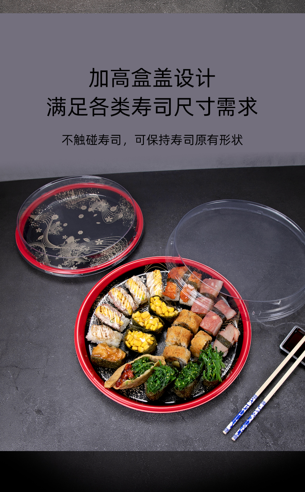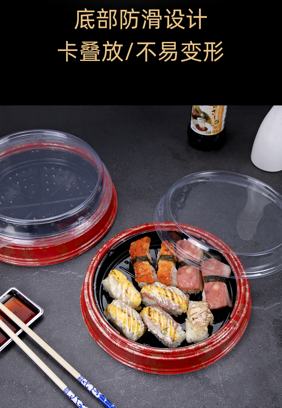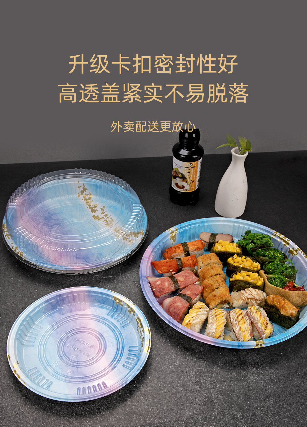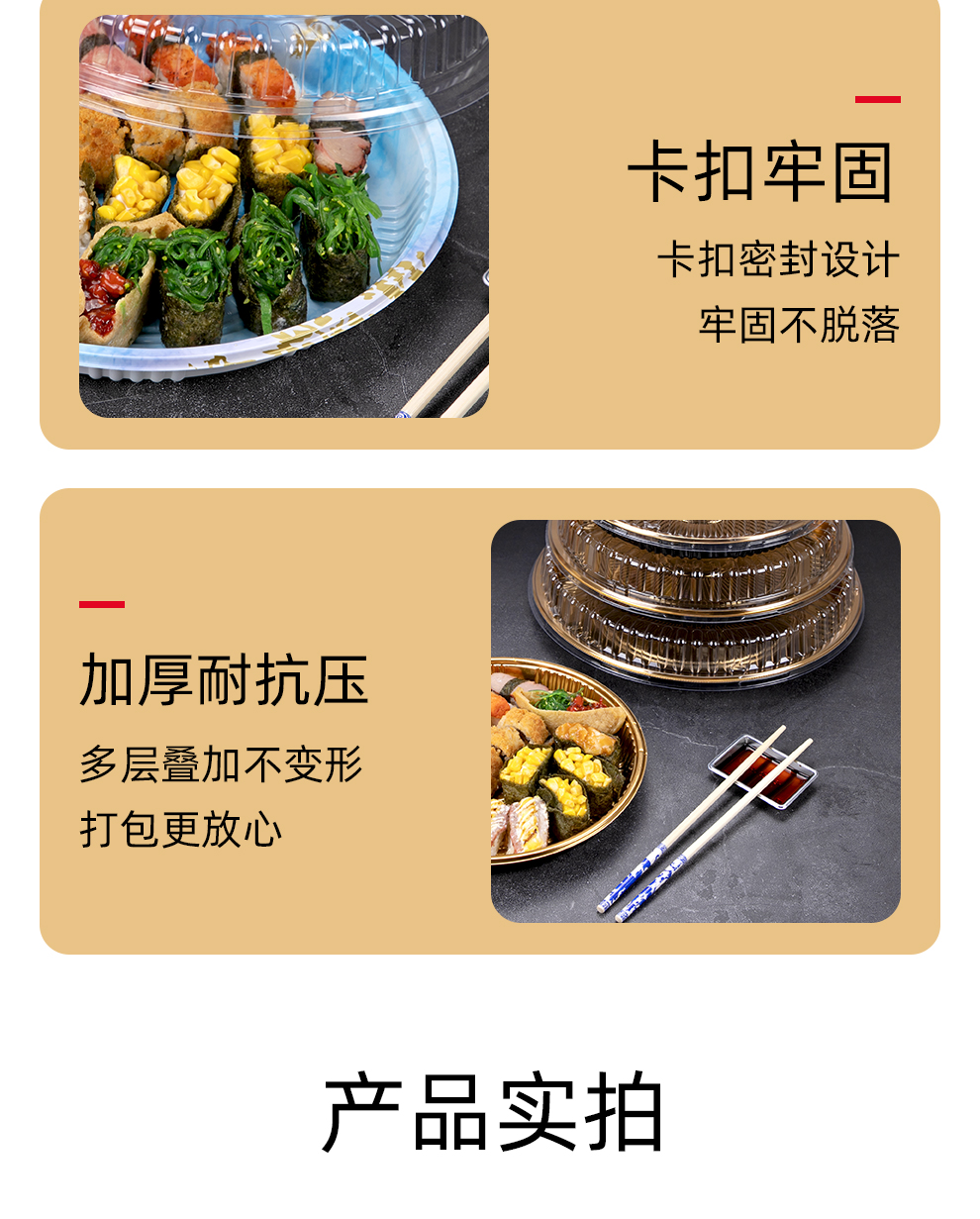 喇叭花圆形寿司盒寿喜锅拼盘海鲜烧鹅外带盒一次性外卖盒圆形刺身盒印花双层拼盘