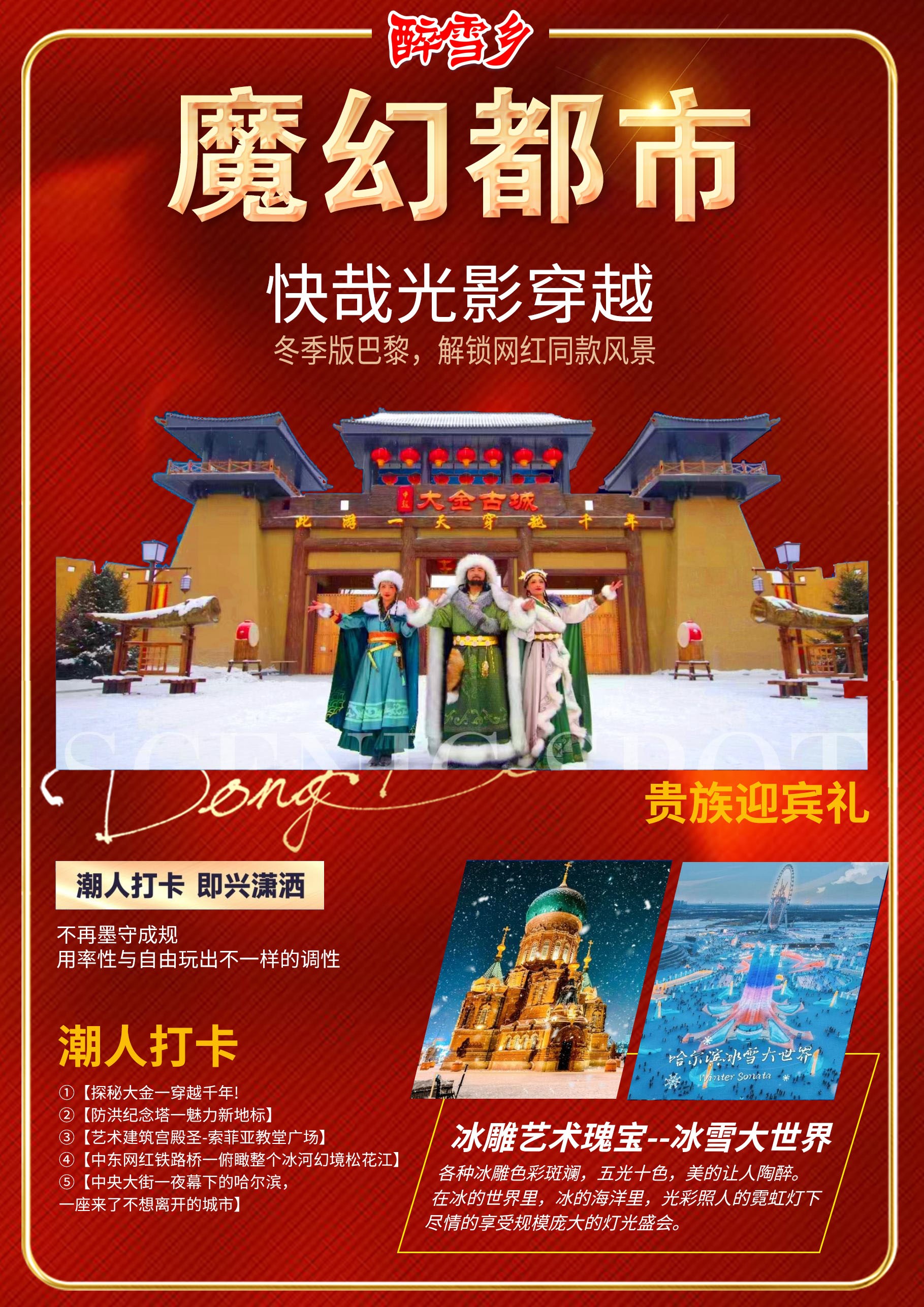 酒店:哈尔滨2晚携程携程4钻,雪阅商旅酒店、金谷酒店、伯爵酒店、雪黎酒店、和颐至尊、豪滨或同级;