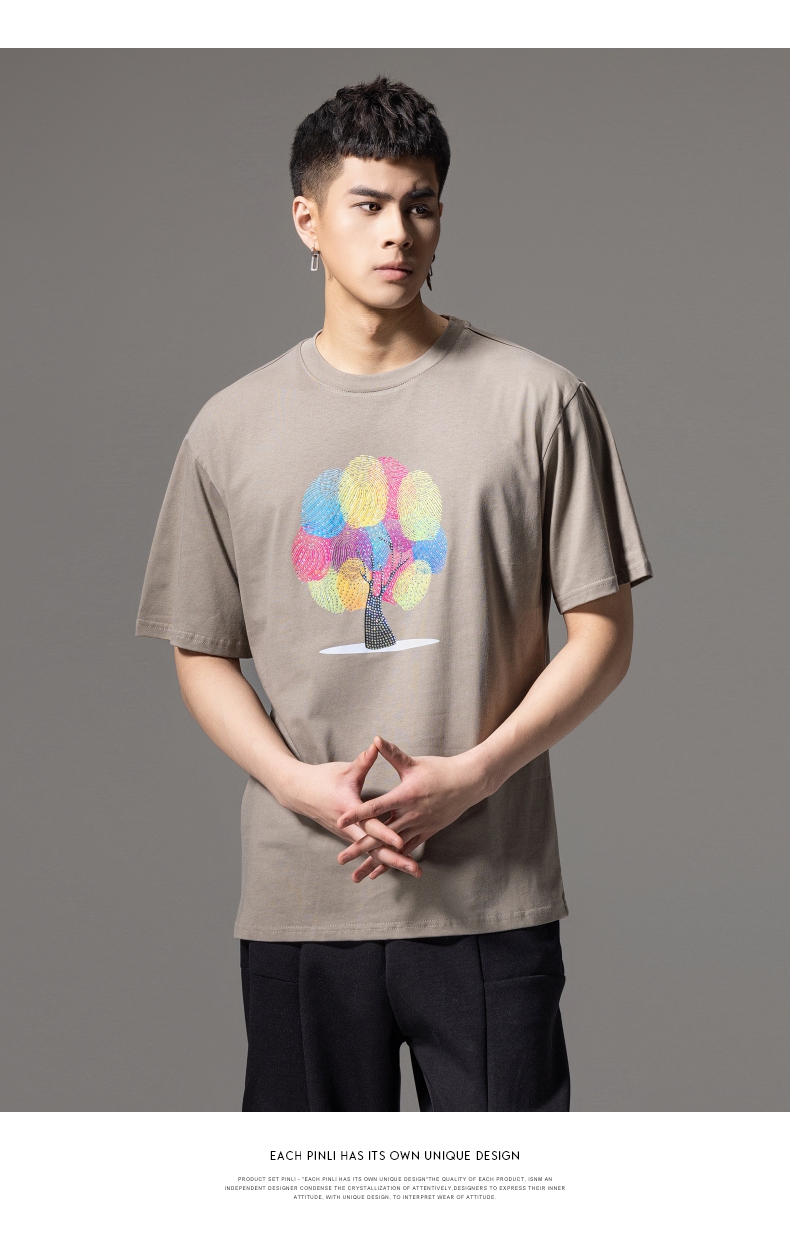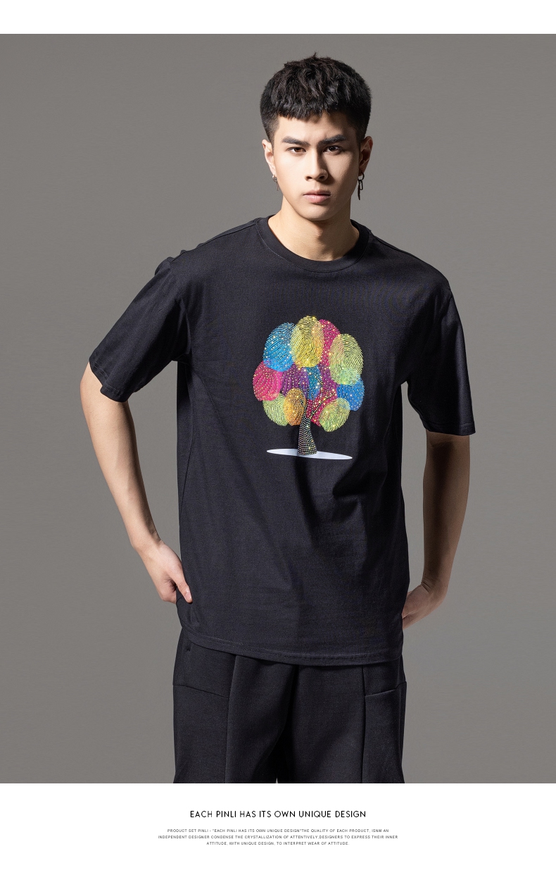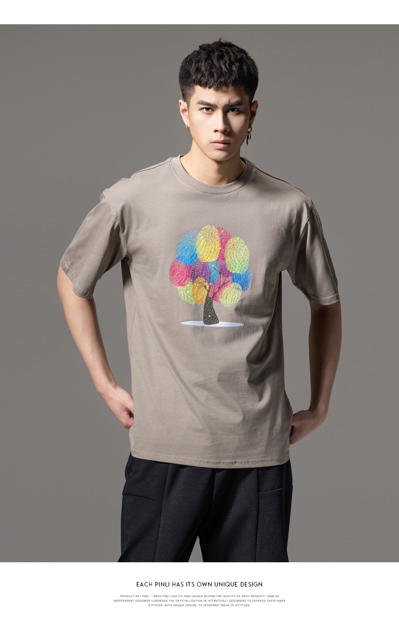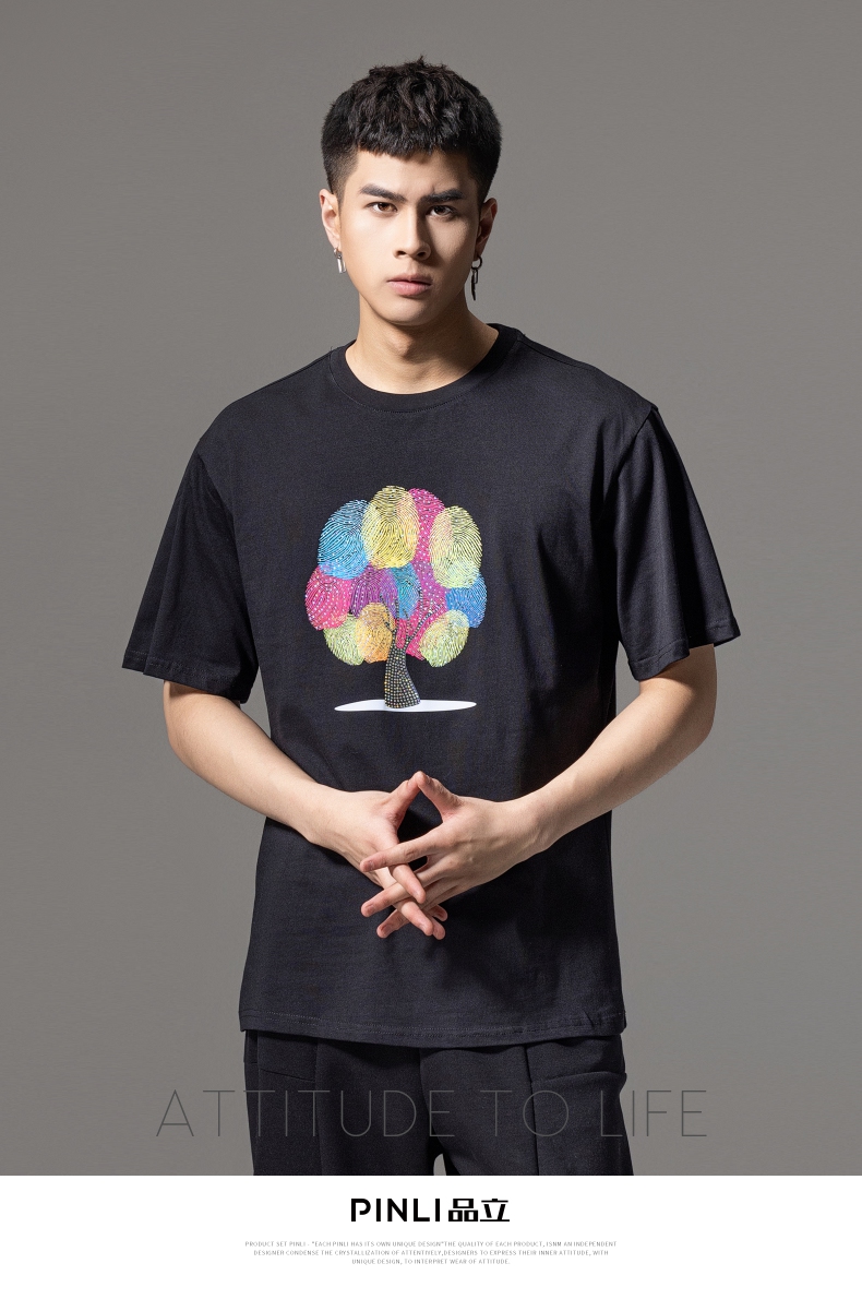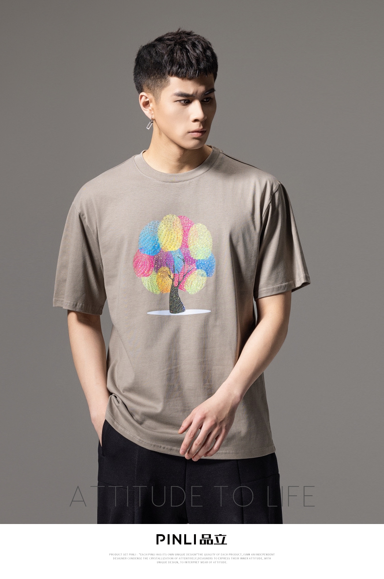 PINLI品立2024夏季新款印花烫钻短袖T恤男士休闲潮牌百搭体恤上衣BG242111017