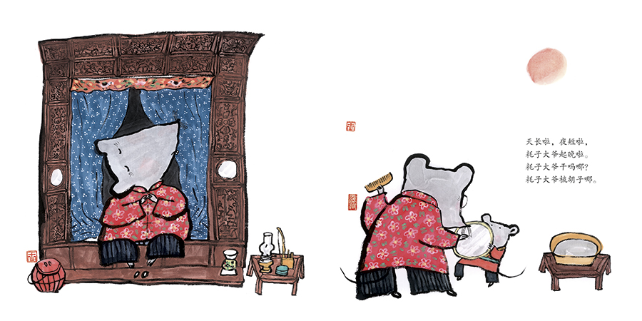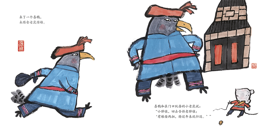 首届“童阅中国”原创好童书熟悉汪曾祺先生作品的读者都知道,汪先生作品中细腻的细节描写,生活化的场景,中国味道的幽默,文字的简练,都是我们喜爱他作品的不争的理由。他的每一篇短篇小说,都给人以深刻的记忆和无限的回味。《仓老鼠和老鹰借粮》这个故事,是汪曾祺先生通过民间故事创作的,并由中国知名插画家王祖民先生绘制,是一本中国韵味又风趣幽默的图画书。这则故事的语言读起来朗朗上口,里面的几个词语精妙绝伦,生动:小胖墩、大胖墩;小尖嘴、老尖嘴;小猫菜,老猫菜……让人有会心一笑之感。