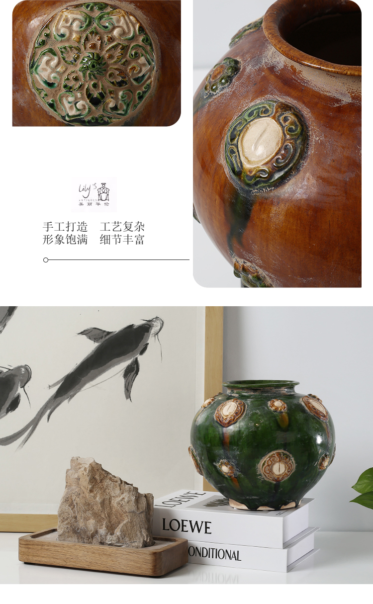 复古陶制唐三彩花瓶侘寂做旧陶瓷插花罐中式装饰仿古民宿桌面摆件