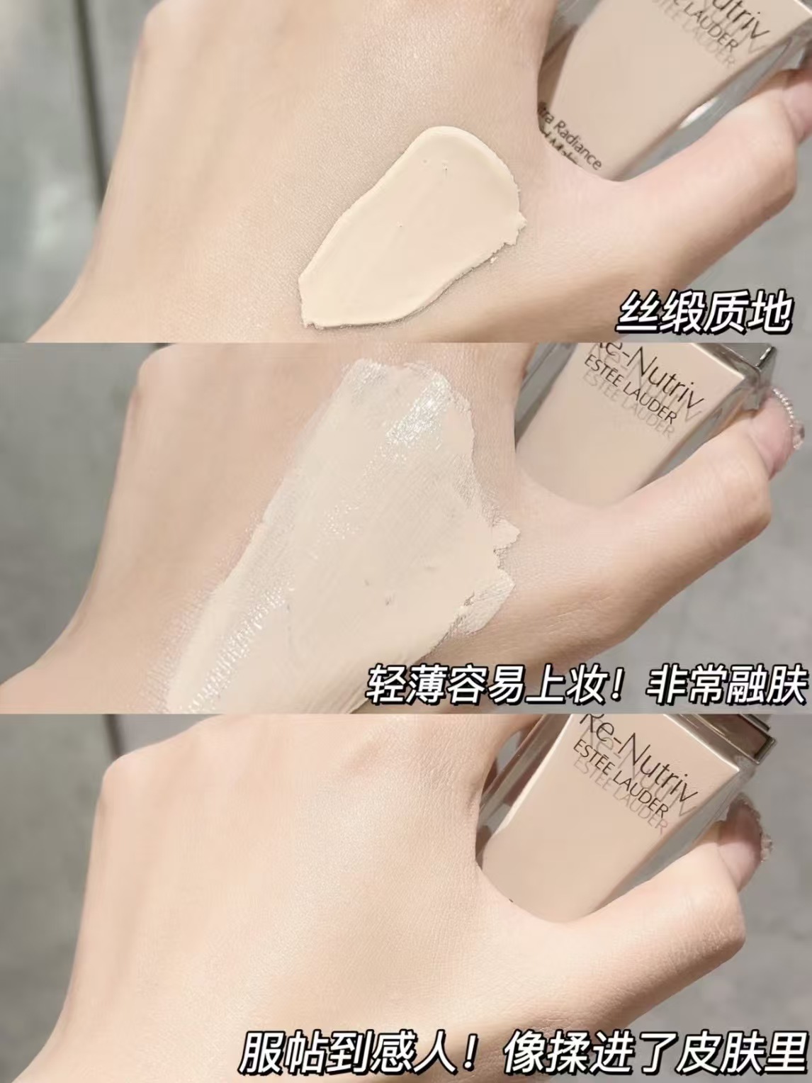 质细腻质地滋润,不油腻适合所有肤质,算是比较难得!混油皮也不会觉得油的养肤粉底,持久度太值得夸了。带妆一整天都不暗沉,轻松拥有长时间的gao级光泽!