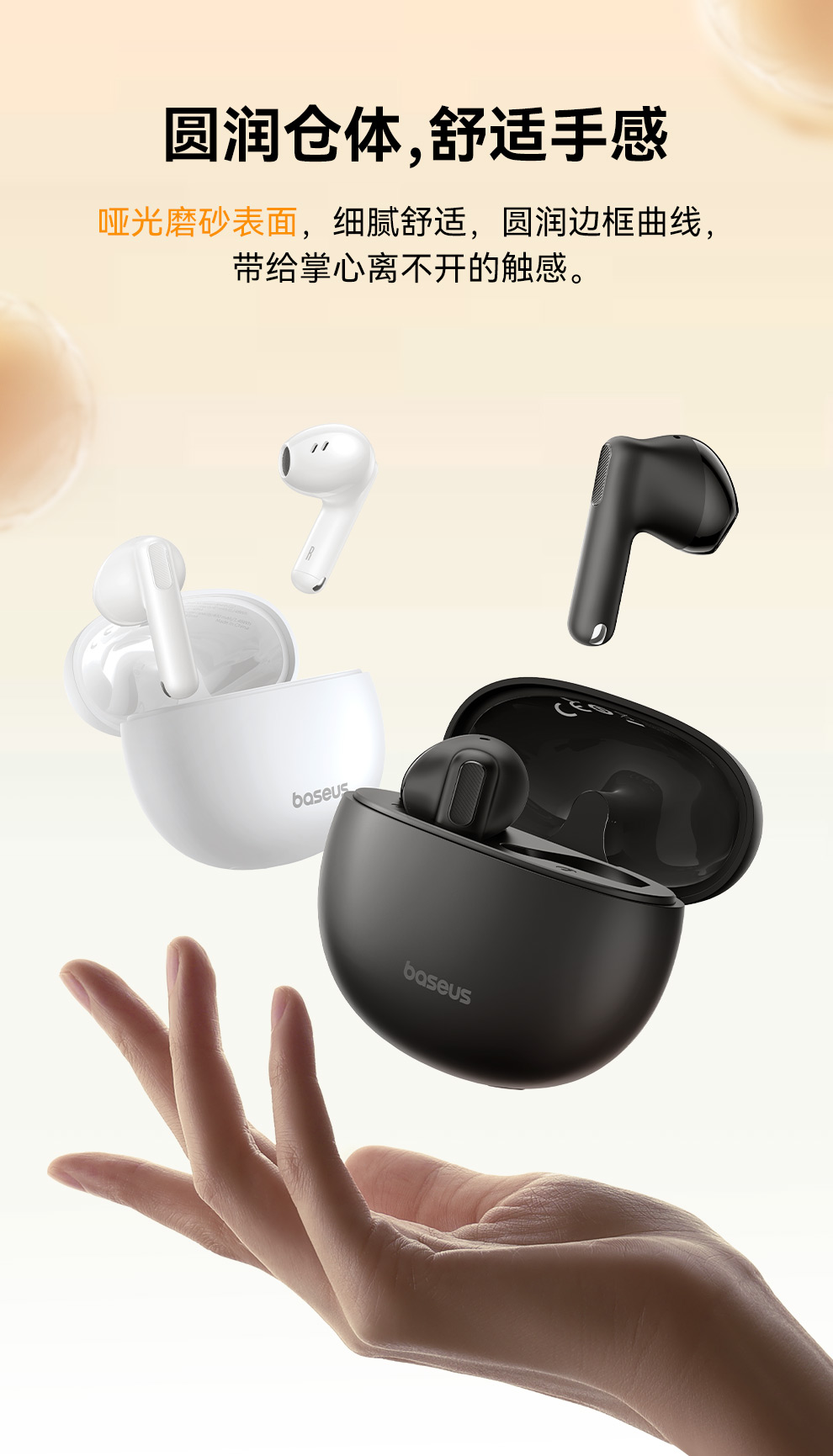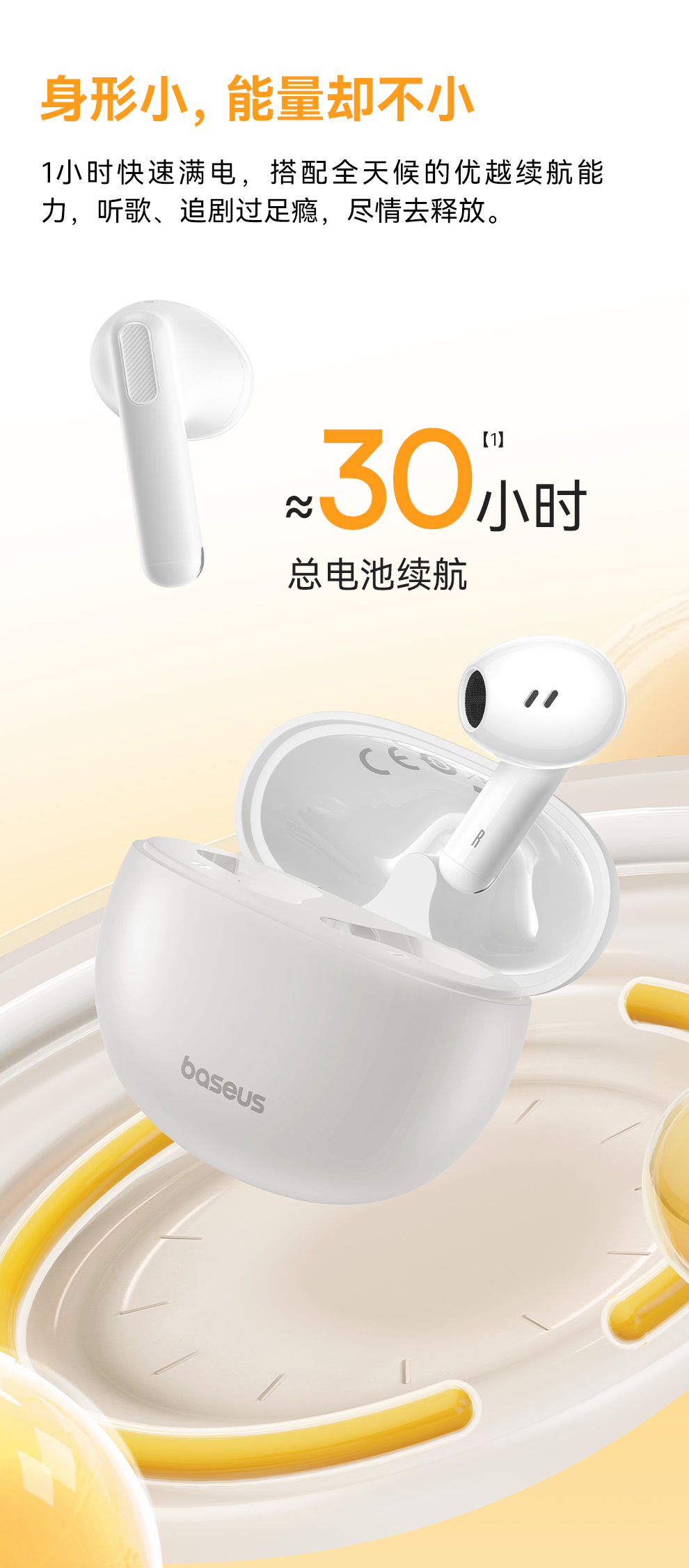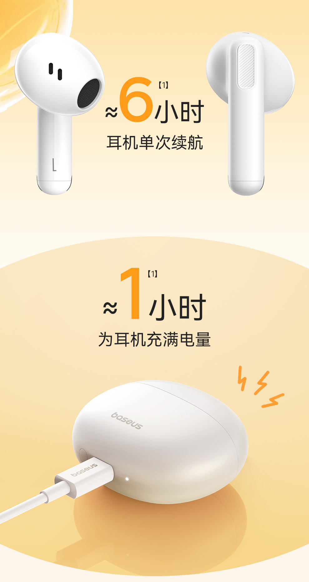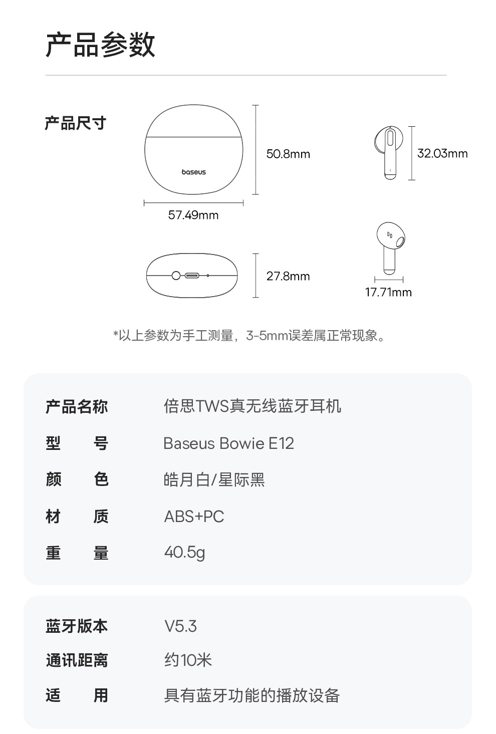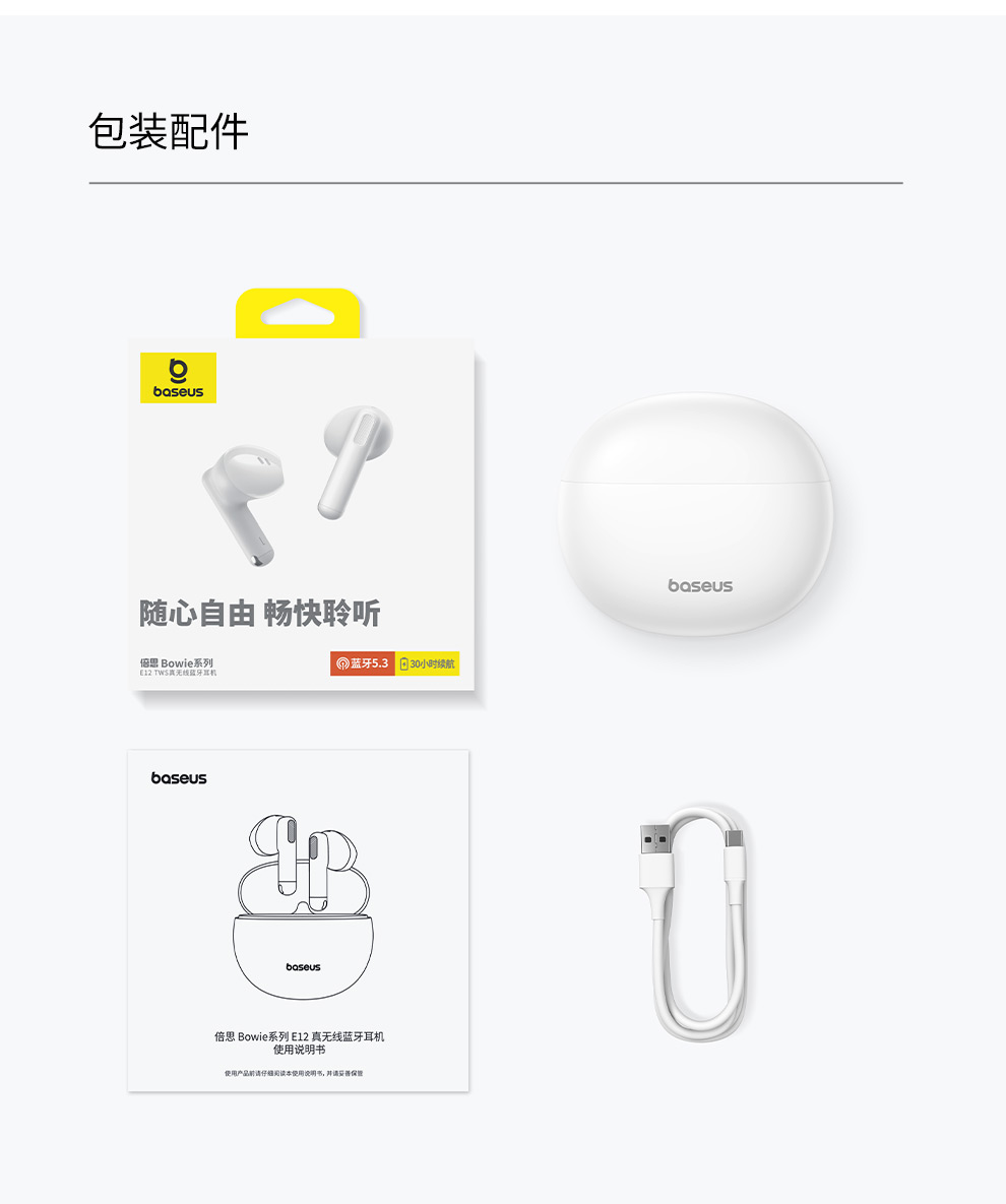 倍思 Bowie系列 E12 TWS真无线蓝牙耳机(含:简易通用数据线 Type-c 3A 0.3M 黑色)