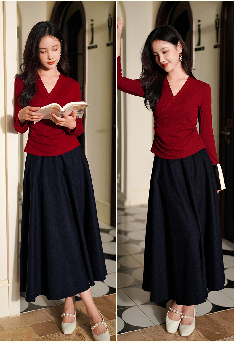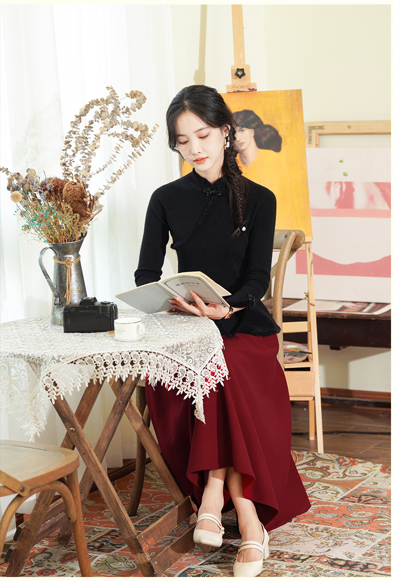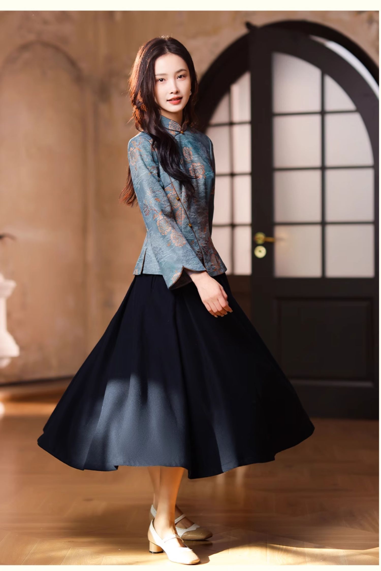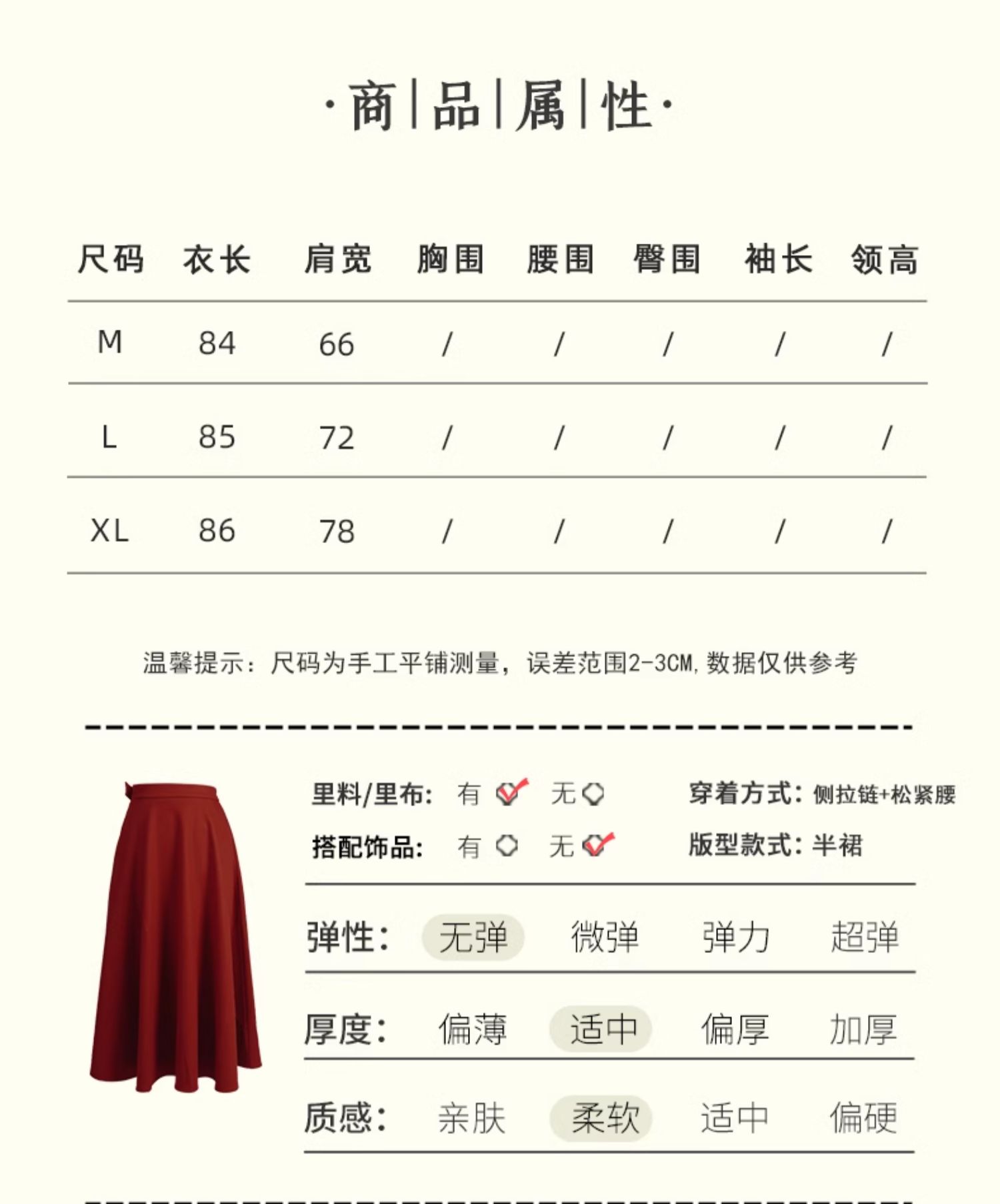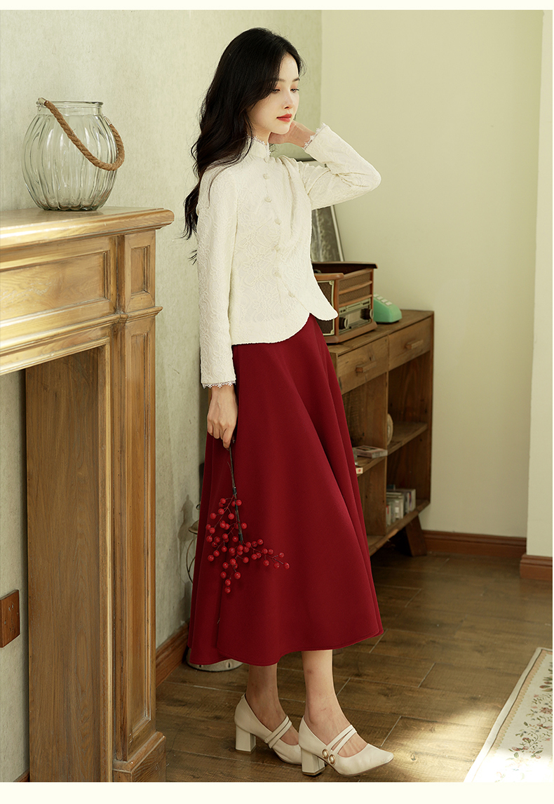 上海逸红颜芸婳2025秋冬新款毛呢新中式A摆后腰松紧百搭半身裙女