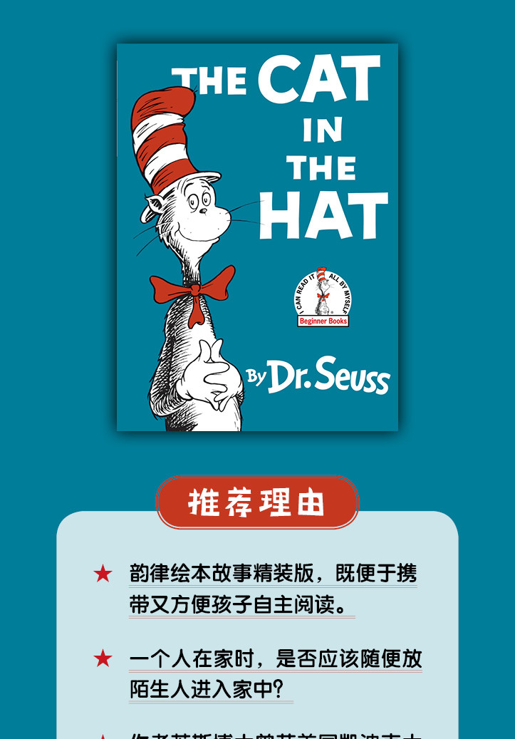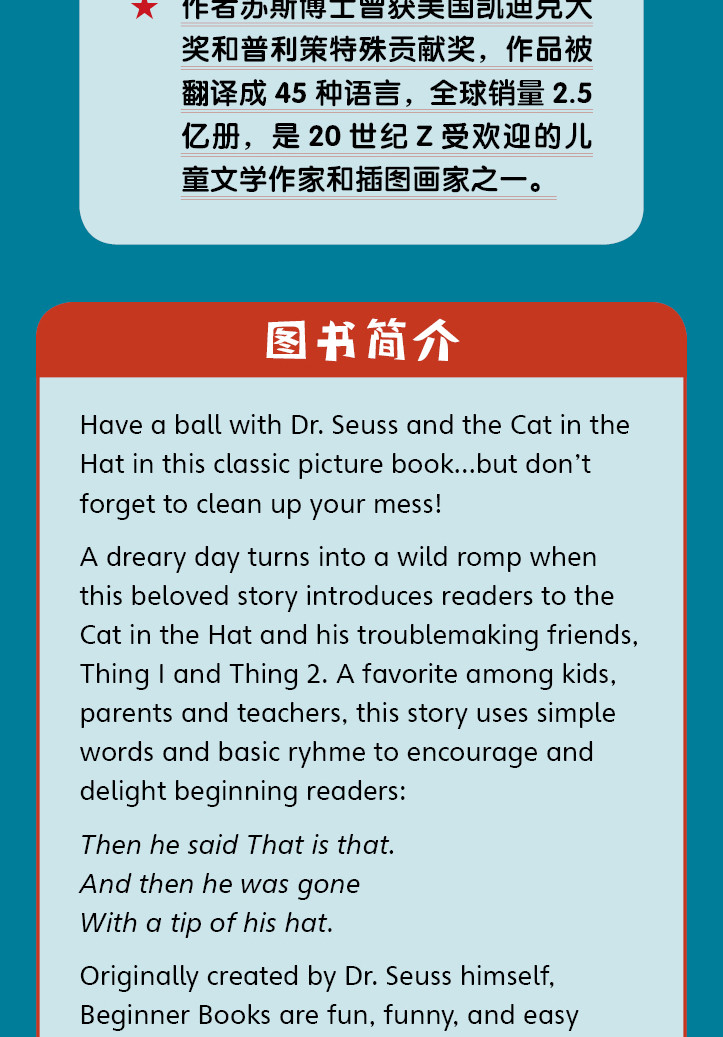 The Cat in the Hat(戴帽子的猫)的语言风格依然延续苏斯博士Dr. Seuss一向的文字风格:非常押韵,读起来琅琅上口,故事性强。