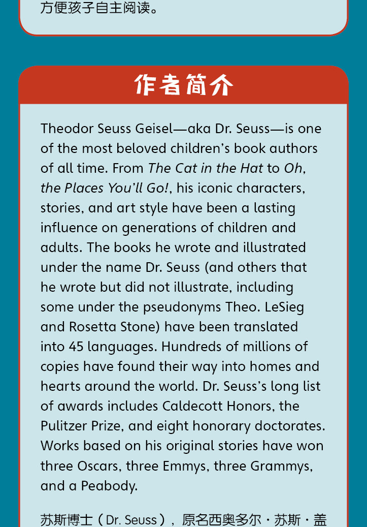 苏斯博士,可以说是二十世纪很受欢迎的儿童图画书作家,在英语世界里,是家喻户晓的人物。他创作的图画书,人物形象鲜明,个性突出,情节夸张荒诞,语言妙趣横生,是半个多世纪以来孩子们的至爱,同时他的书也被教育工作者推荐给家长,作为提高阅读能力的重要读物。