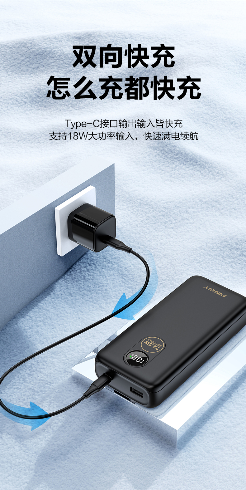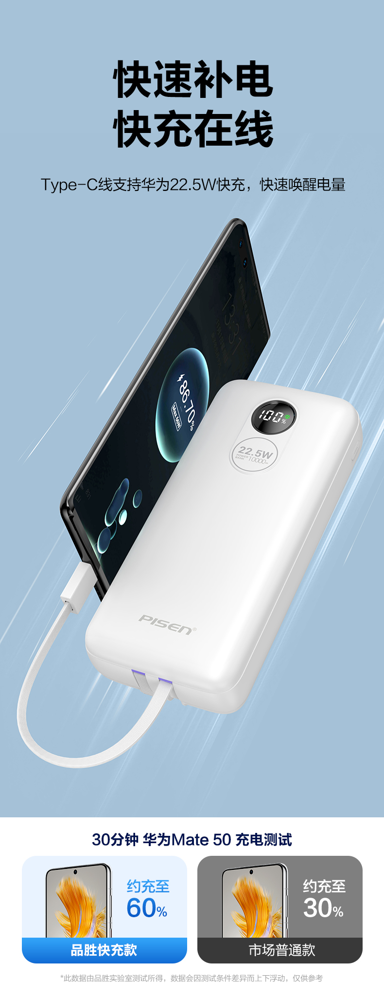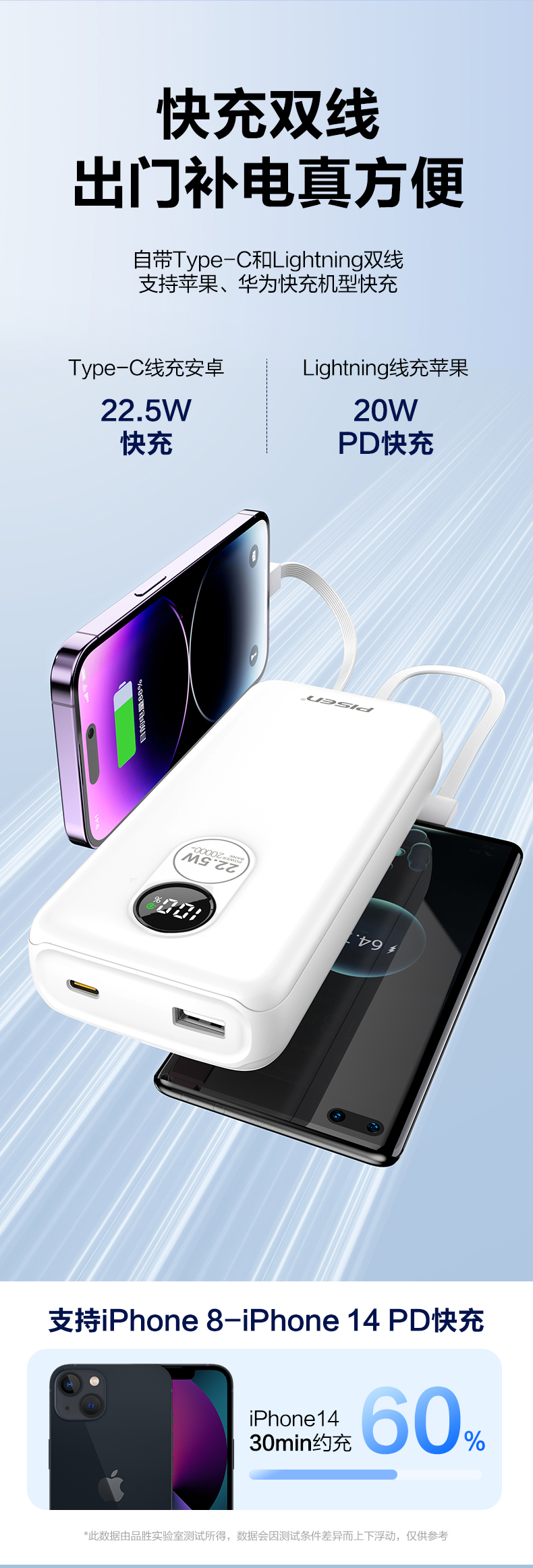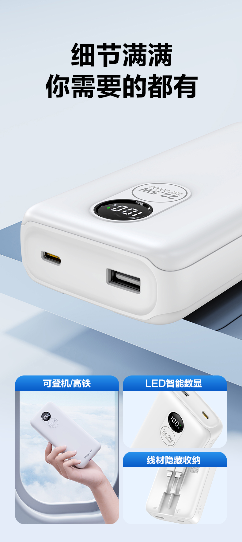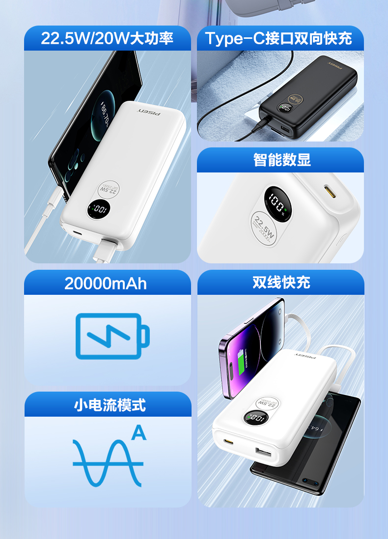 品胜 22.5W双快充线数显快充电宝20000毫安移动电源 自带Type-C/Lightning双线输出