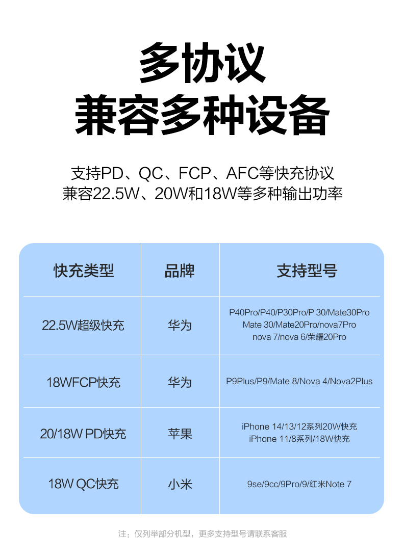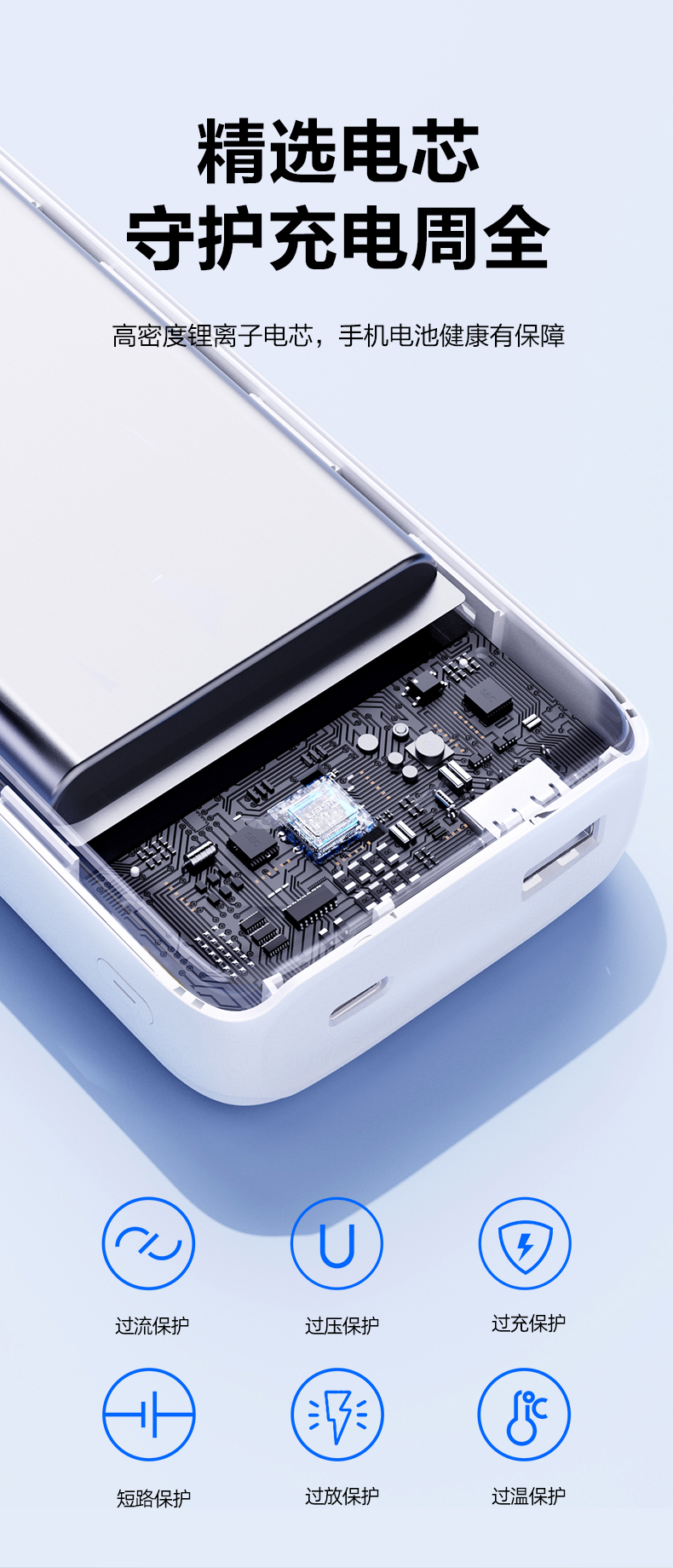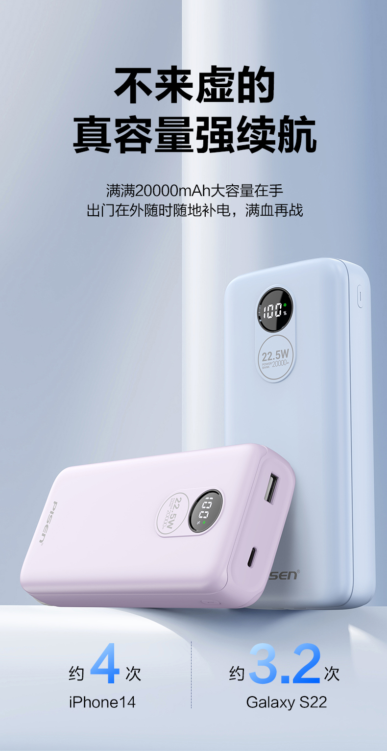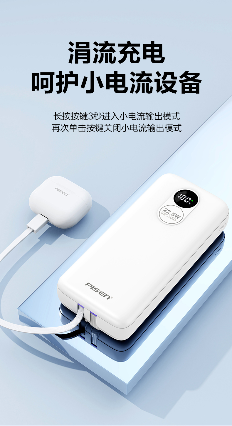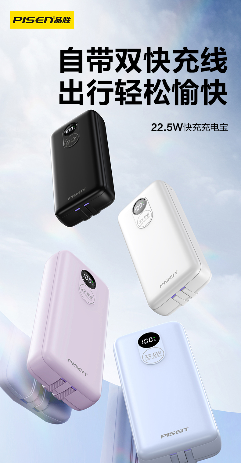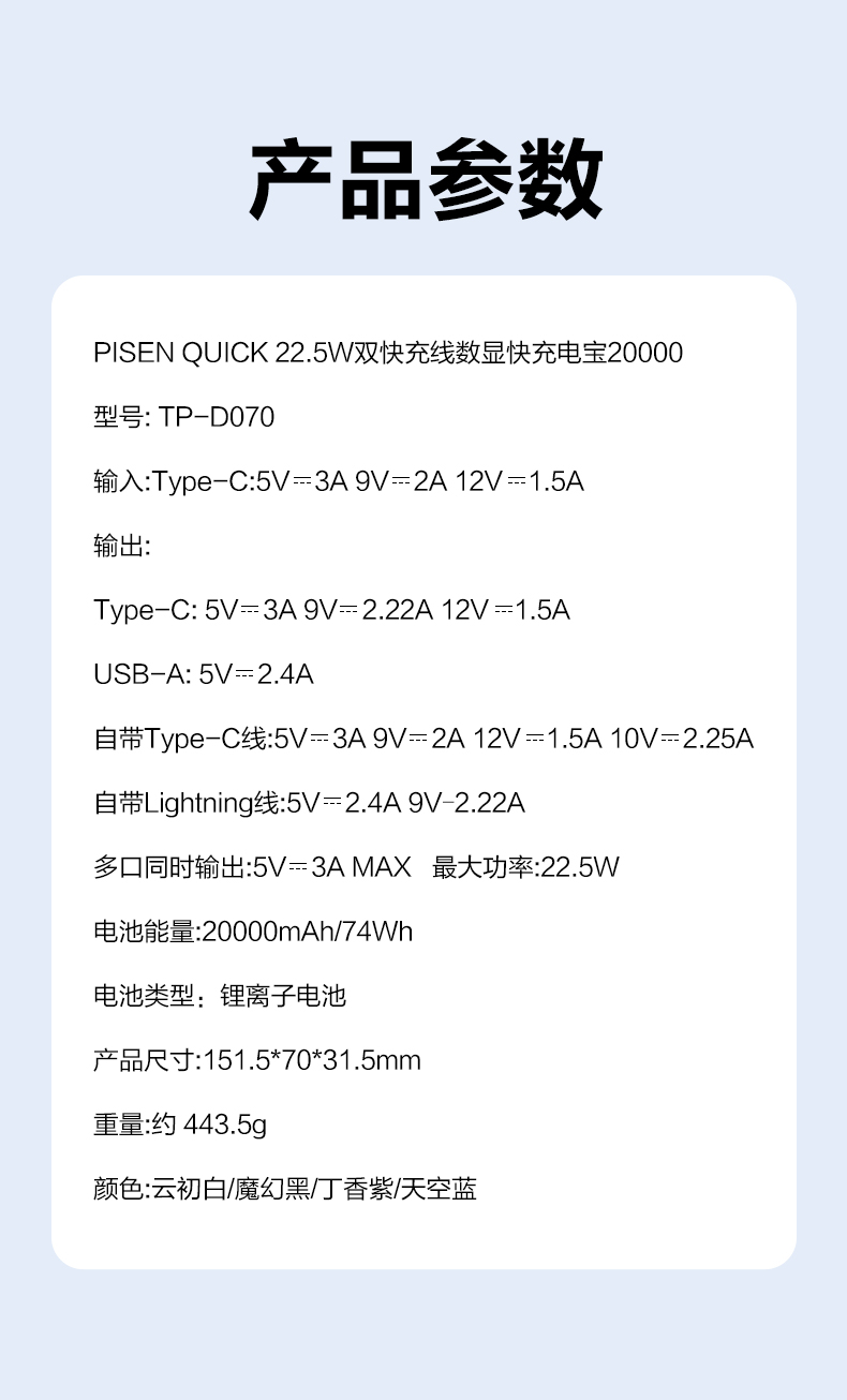 品胜 22.5W双快充线数显快充电宝20000毫安移动电源 自带Type-C/Lightning双线输出