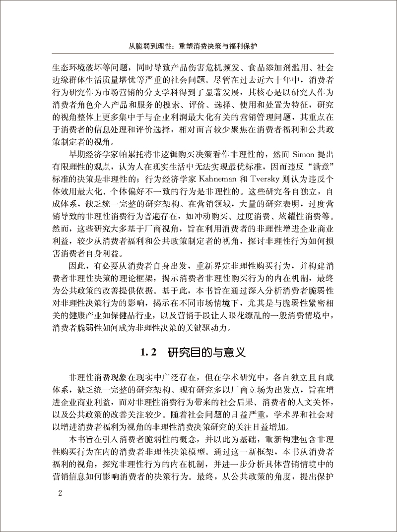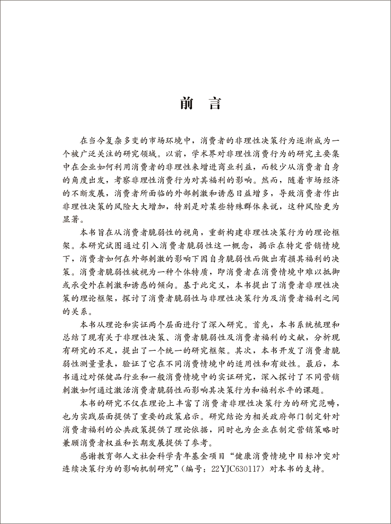 本 书 旨 在 从 消 费 者 脆 弱 性 的 视 角 , 重 新 构 建 非 理 性 决 策 行 为 的 理 论 框架 。 本 研 究 试 图 通 过 引 入 消 费 者 脆 弱 性 这 一 概 念 ,