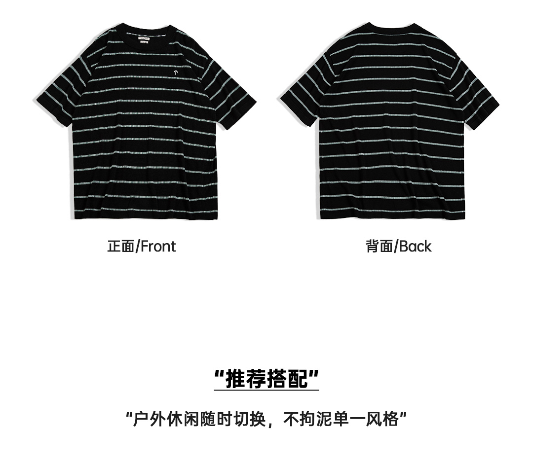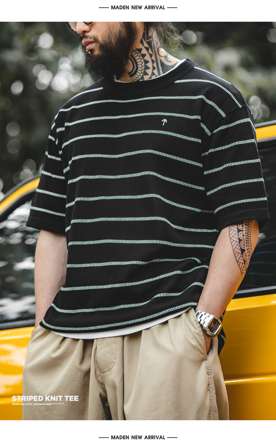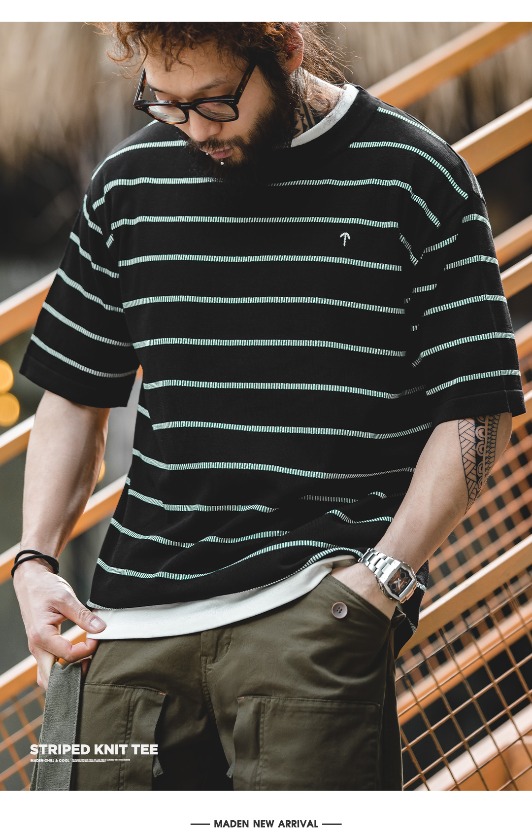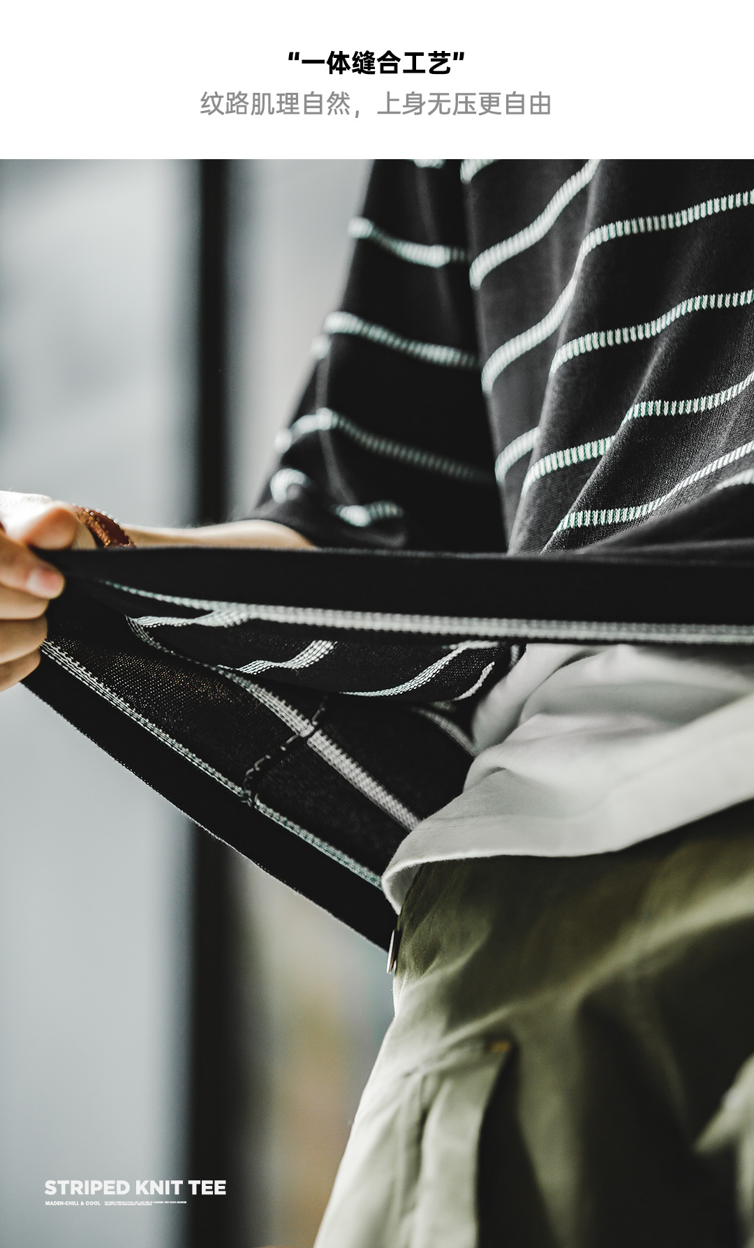 马登工装 美式休闲细条纹针织短袖黑白撞色圆领宽松中袖T恤男夏季