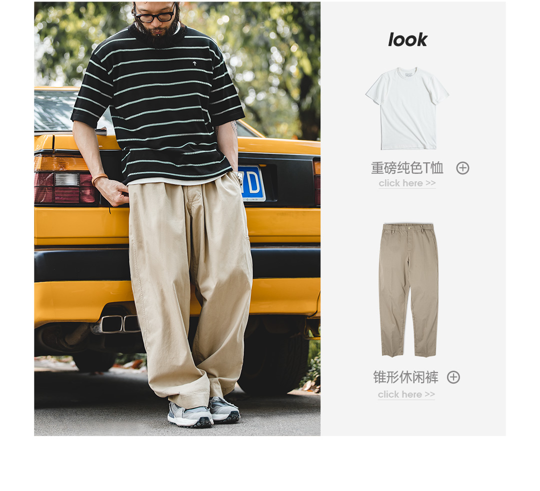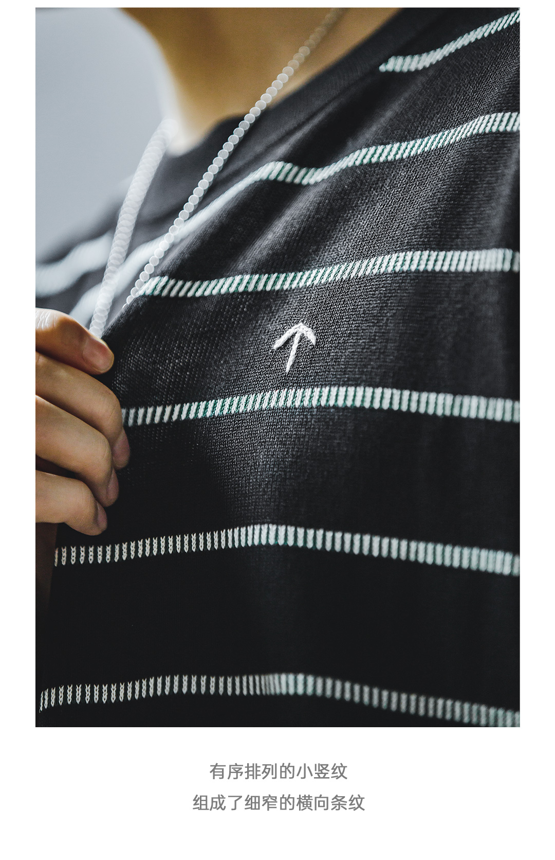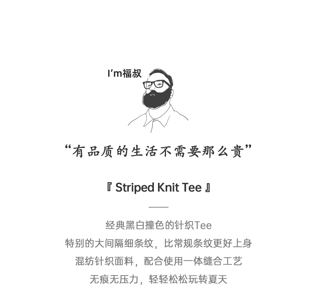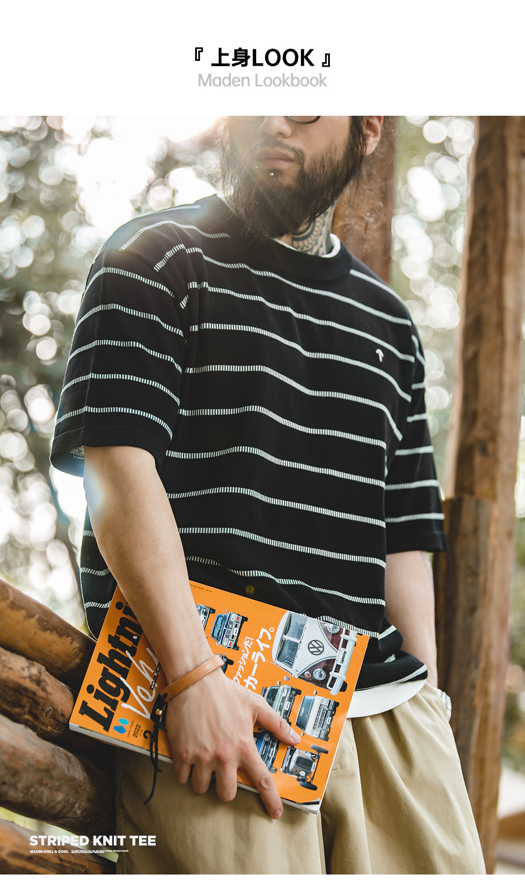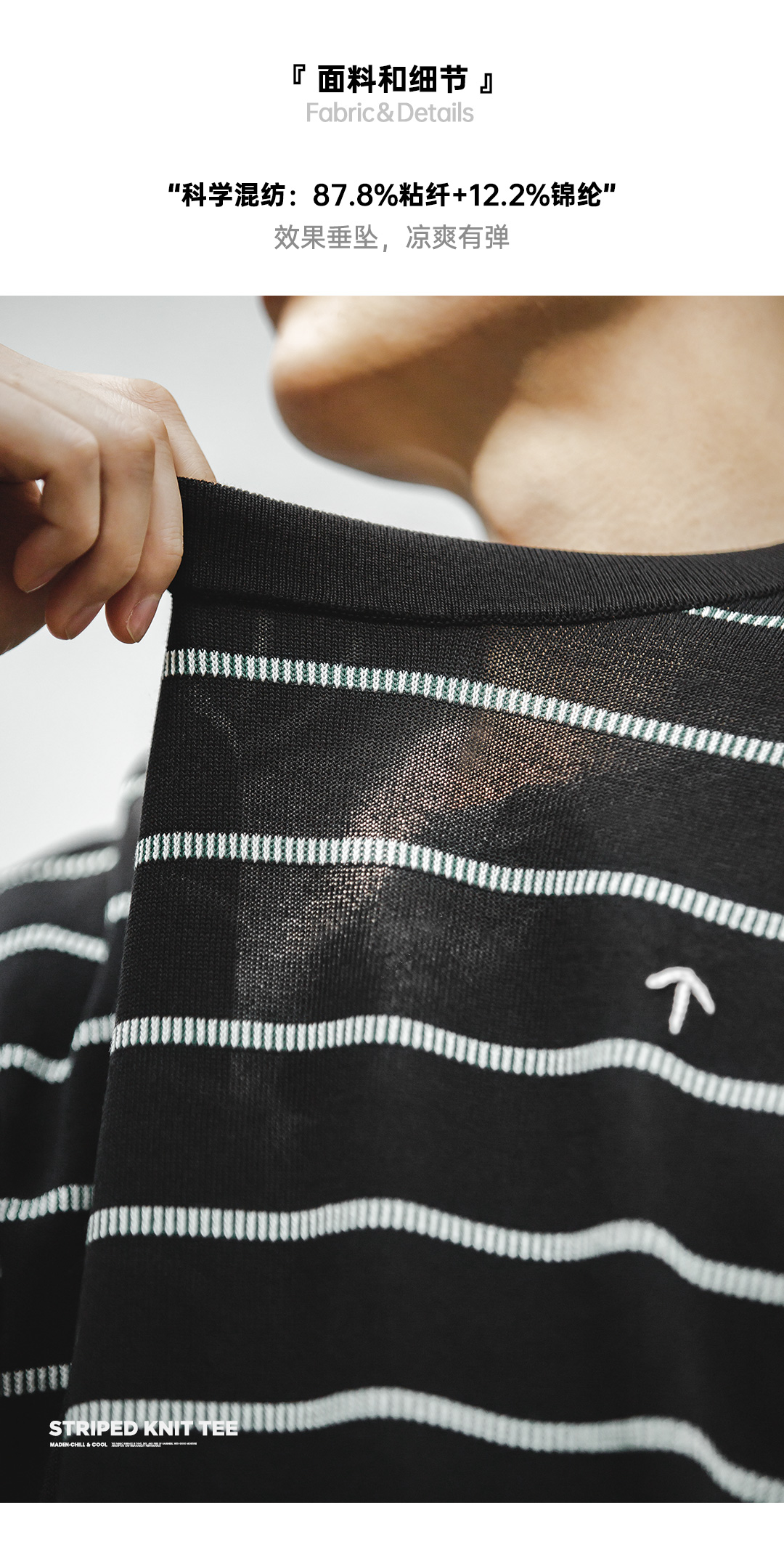 马登工装 美式休闲细条纹针织短袖黑白撞色圆领宽松中袖T恤男夏季