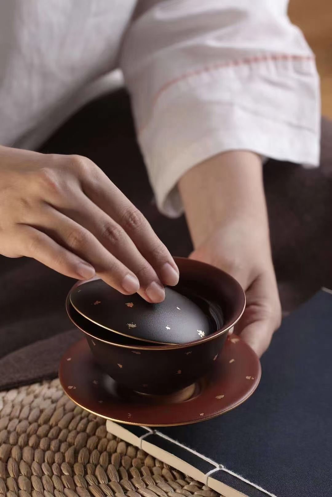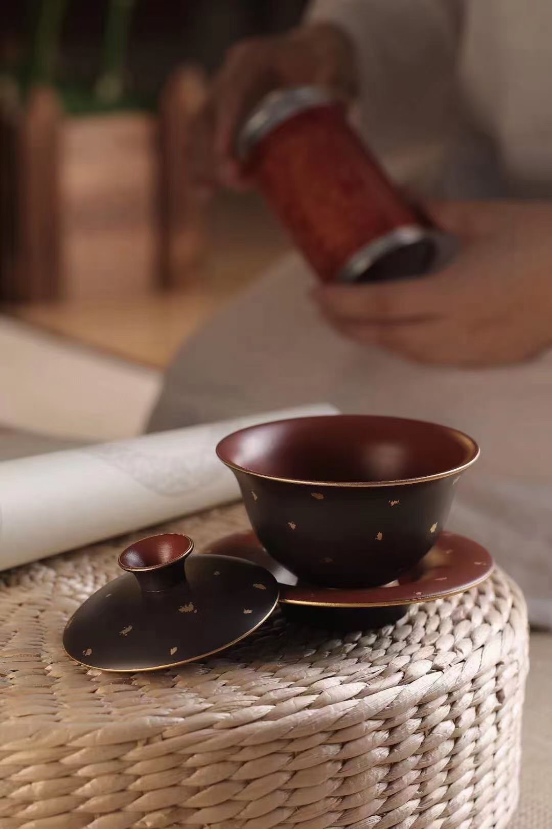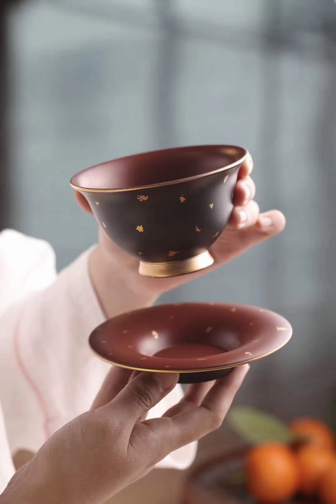 【周年庆】宜兴正宗原矿精品双色描金洒金紫砂盖碗 150cc