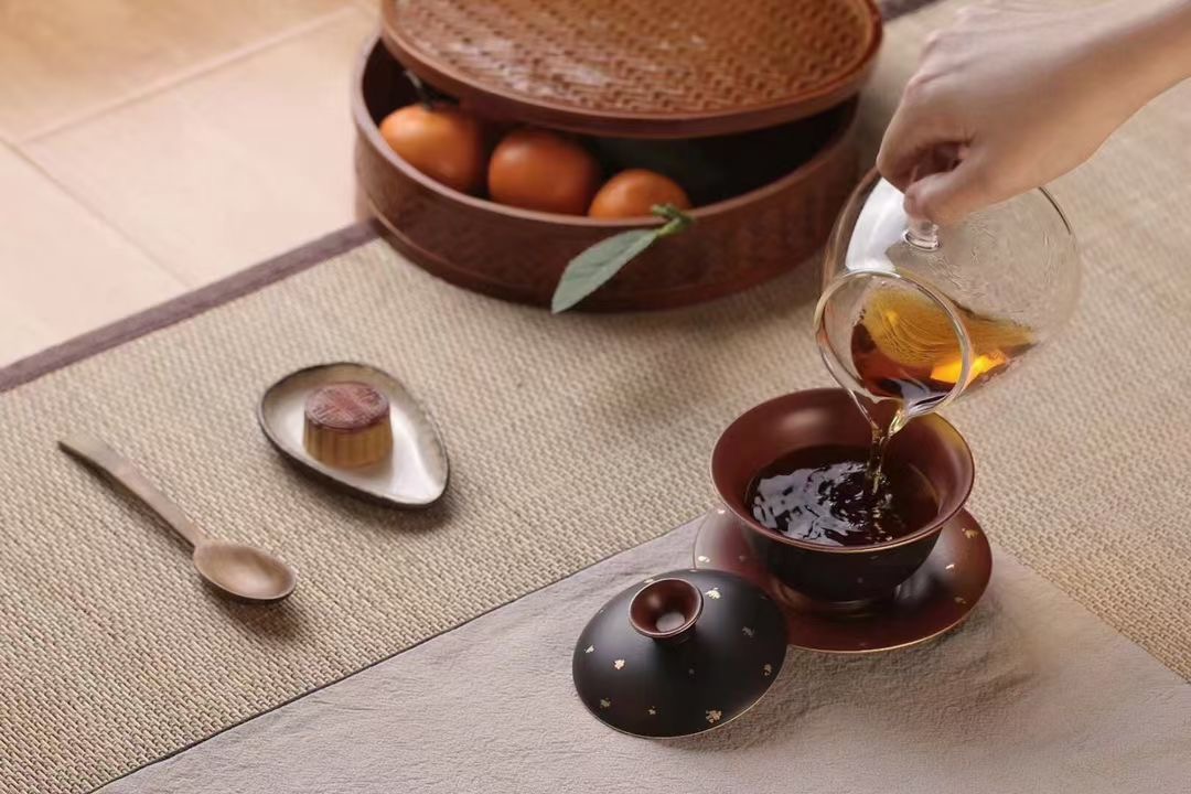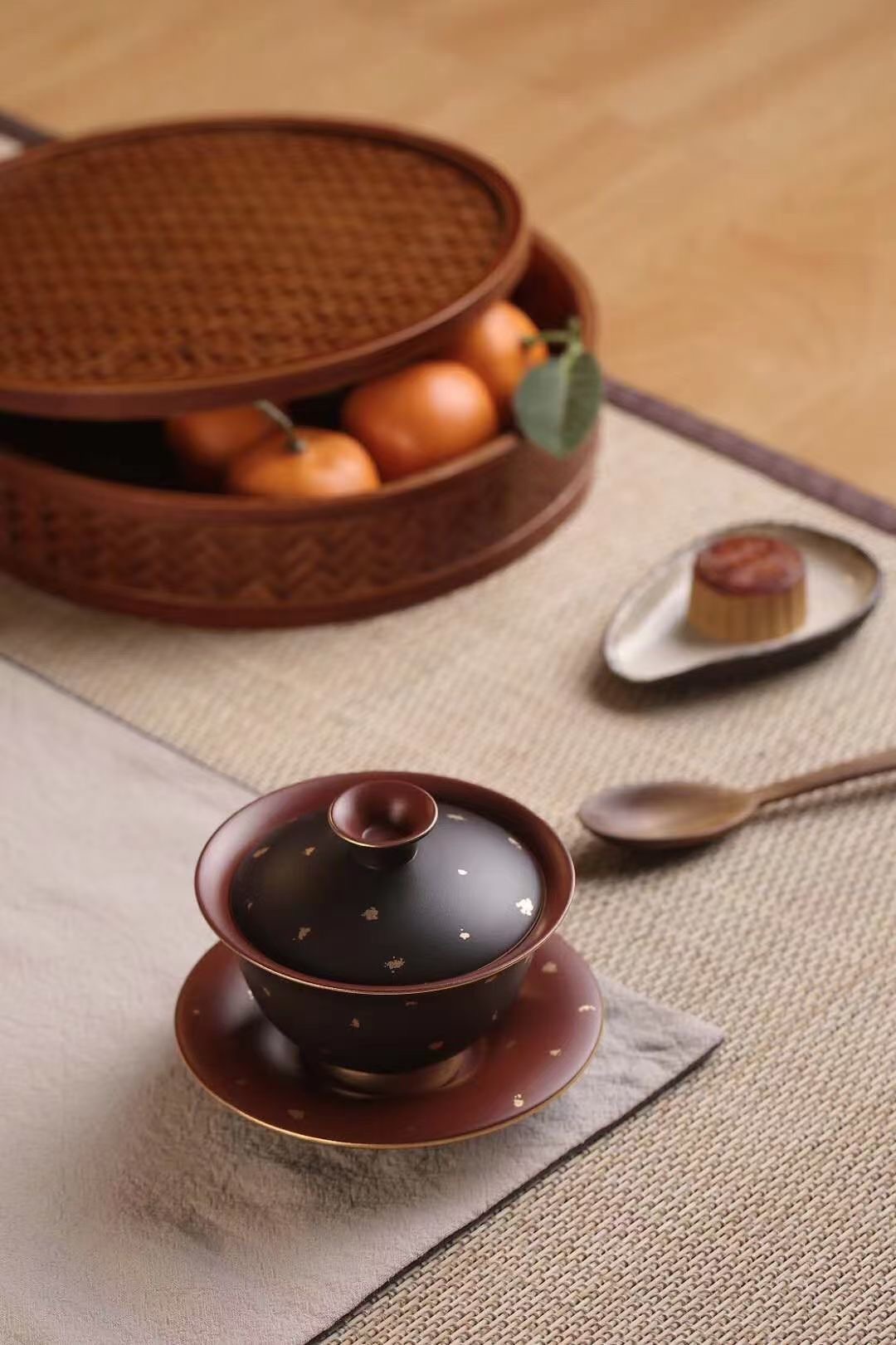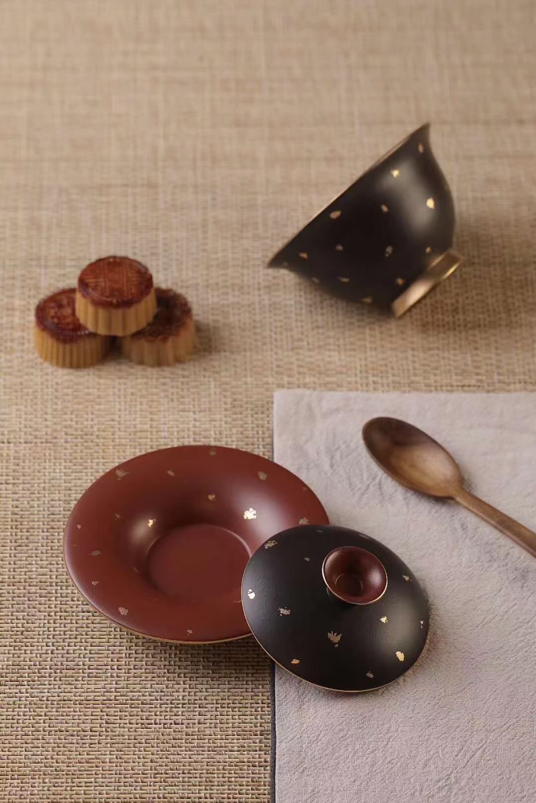 【周年庆】宜兴正宗原矿精品双色描金洒金紫砂盖碗 150cc