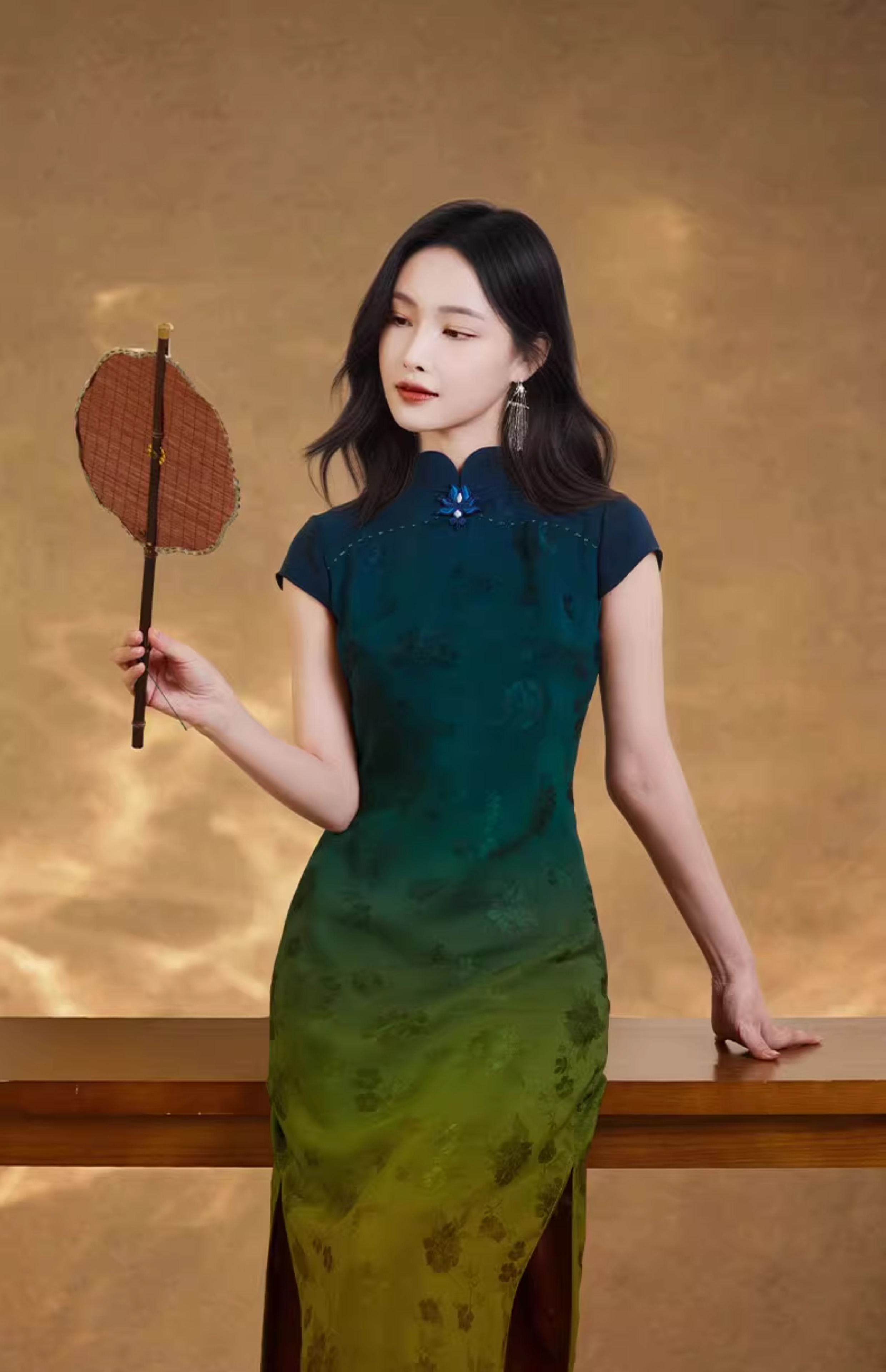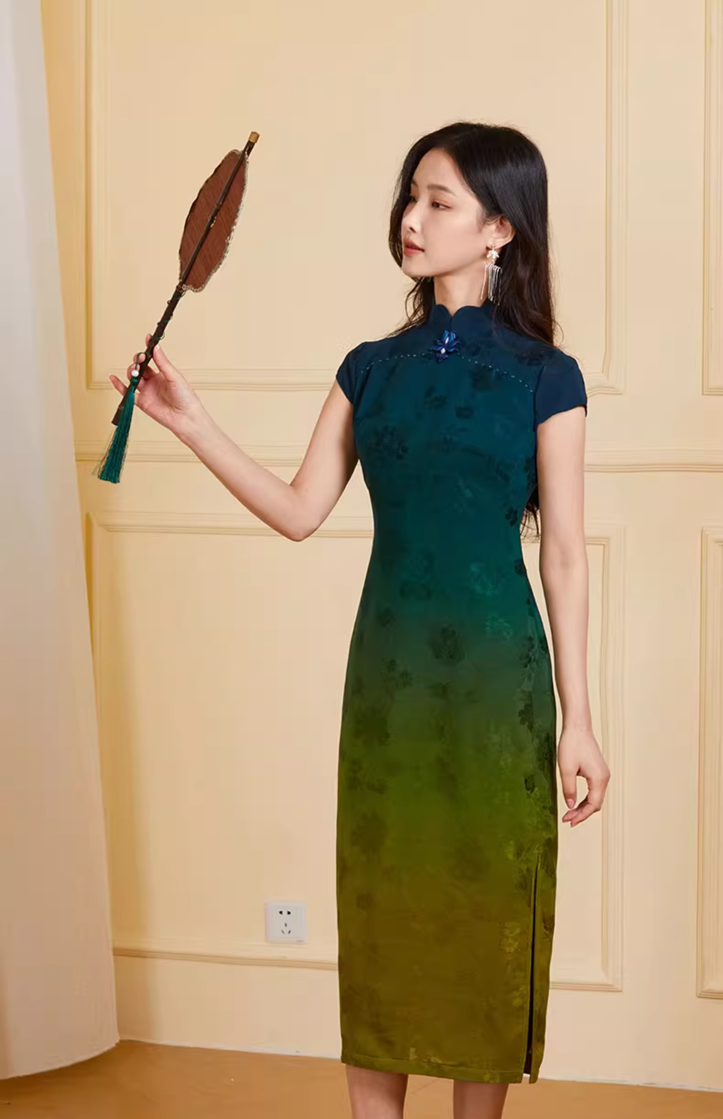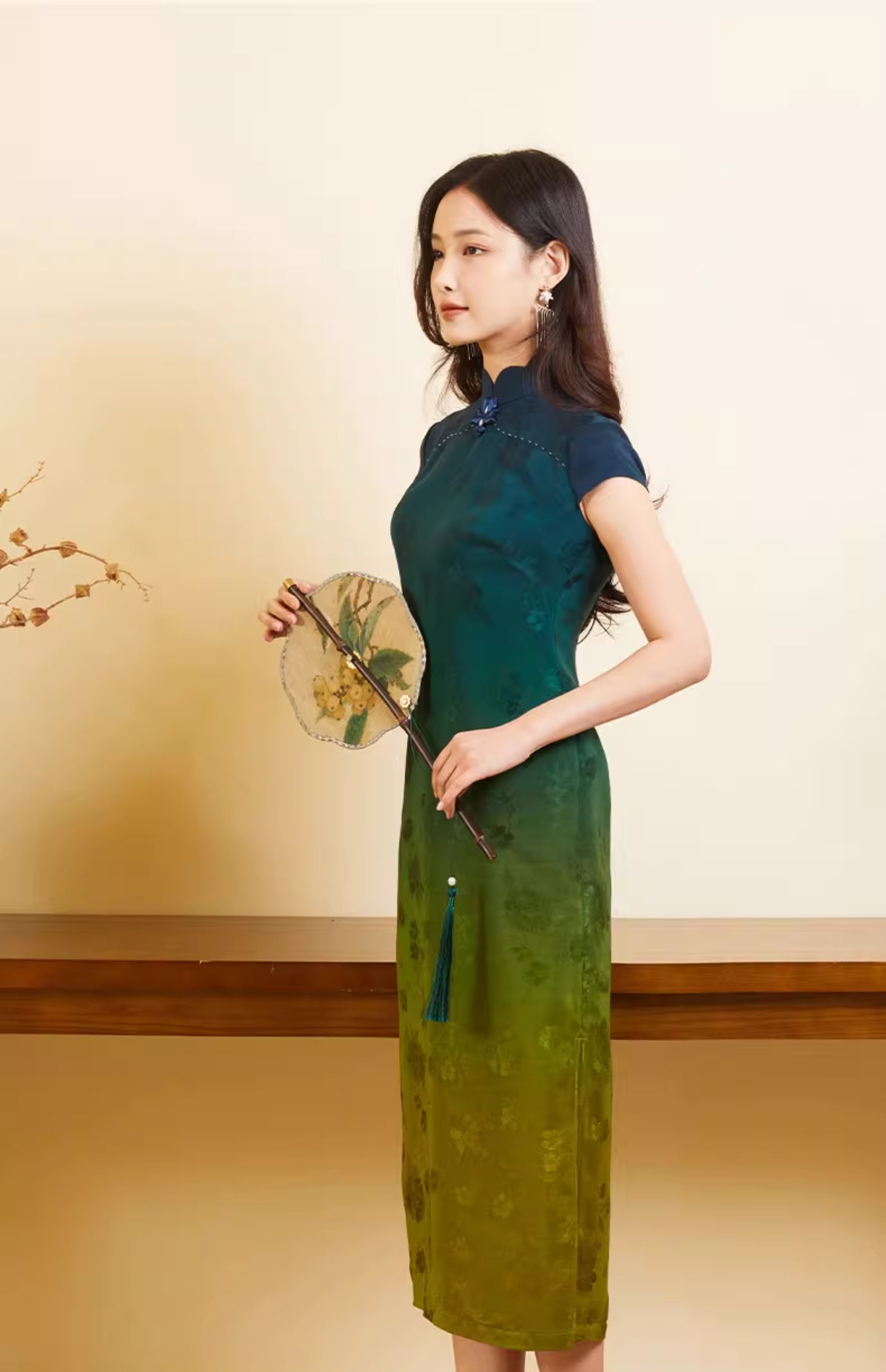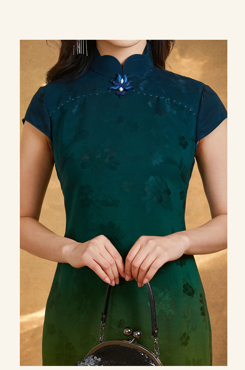 逸红颜青沐2025夏新天然植物吊染渐变青绿花瓣领钉珠红云纱旗袍女