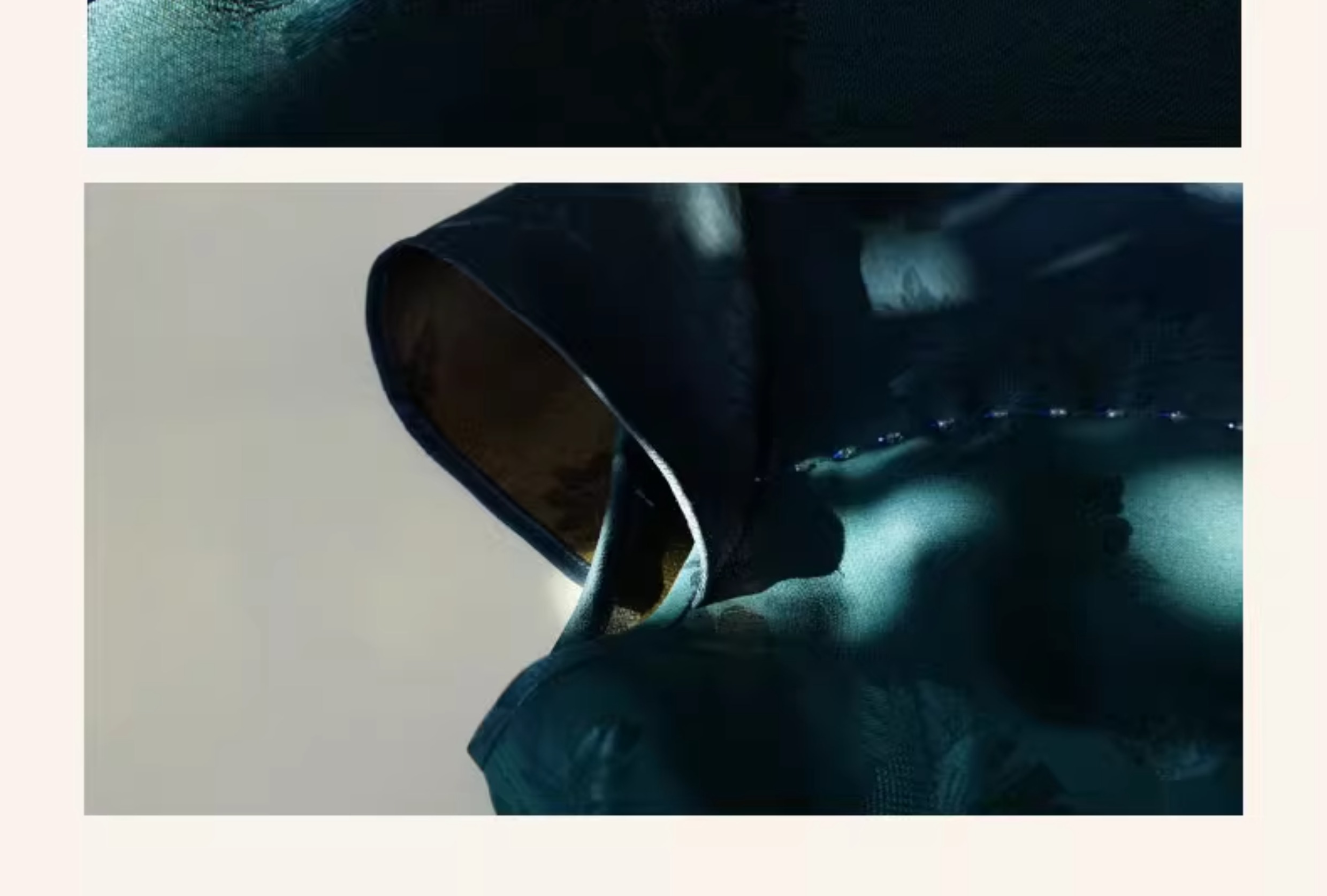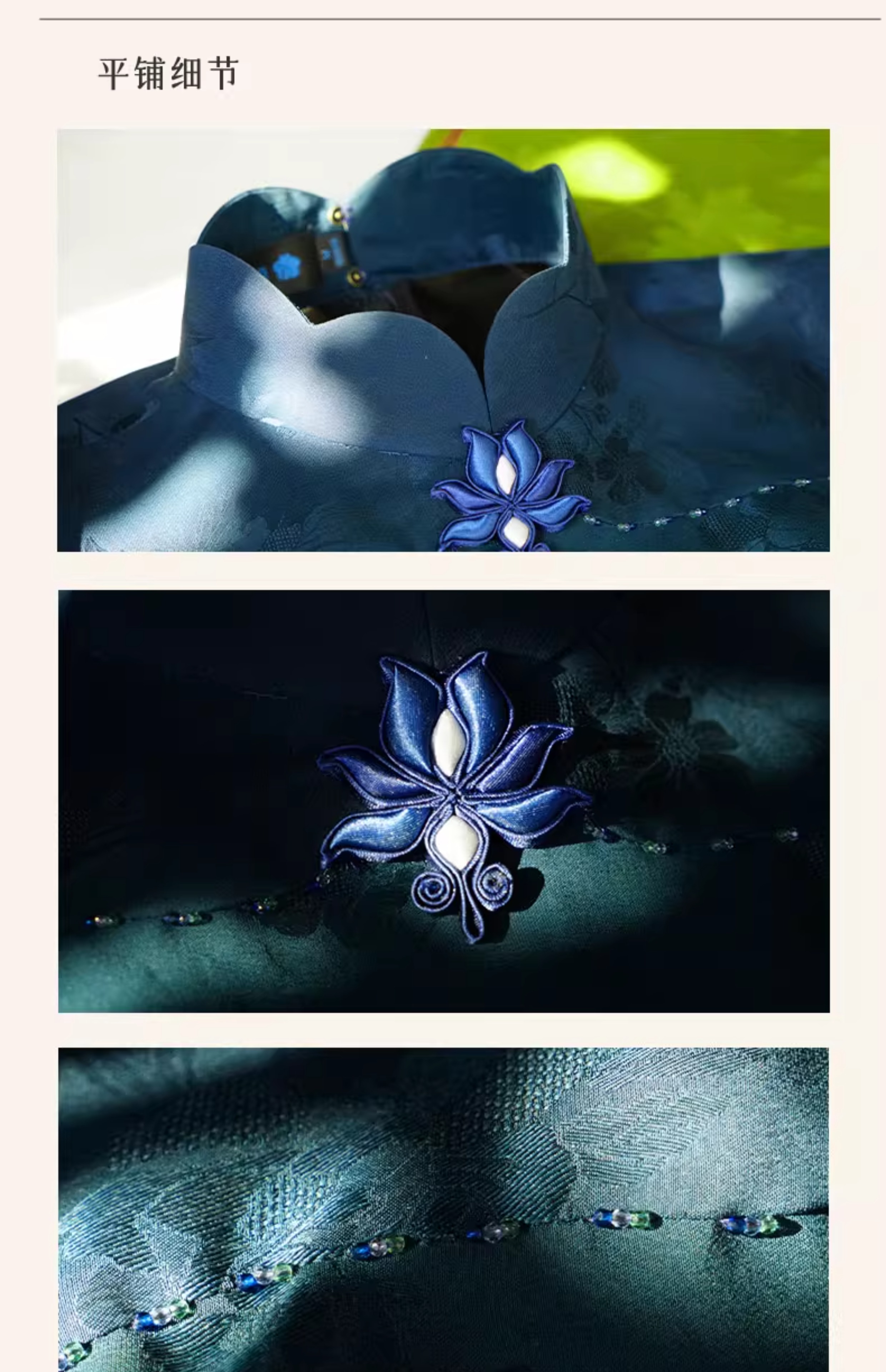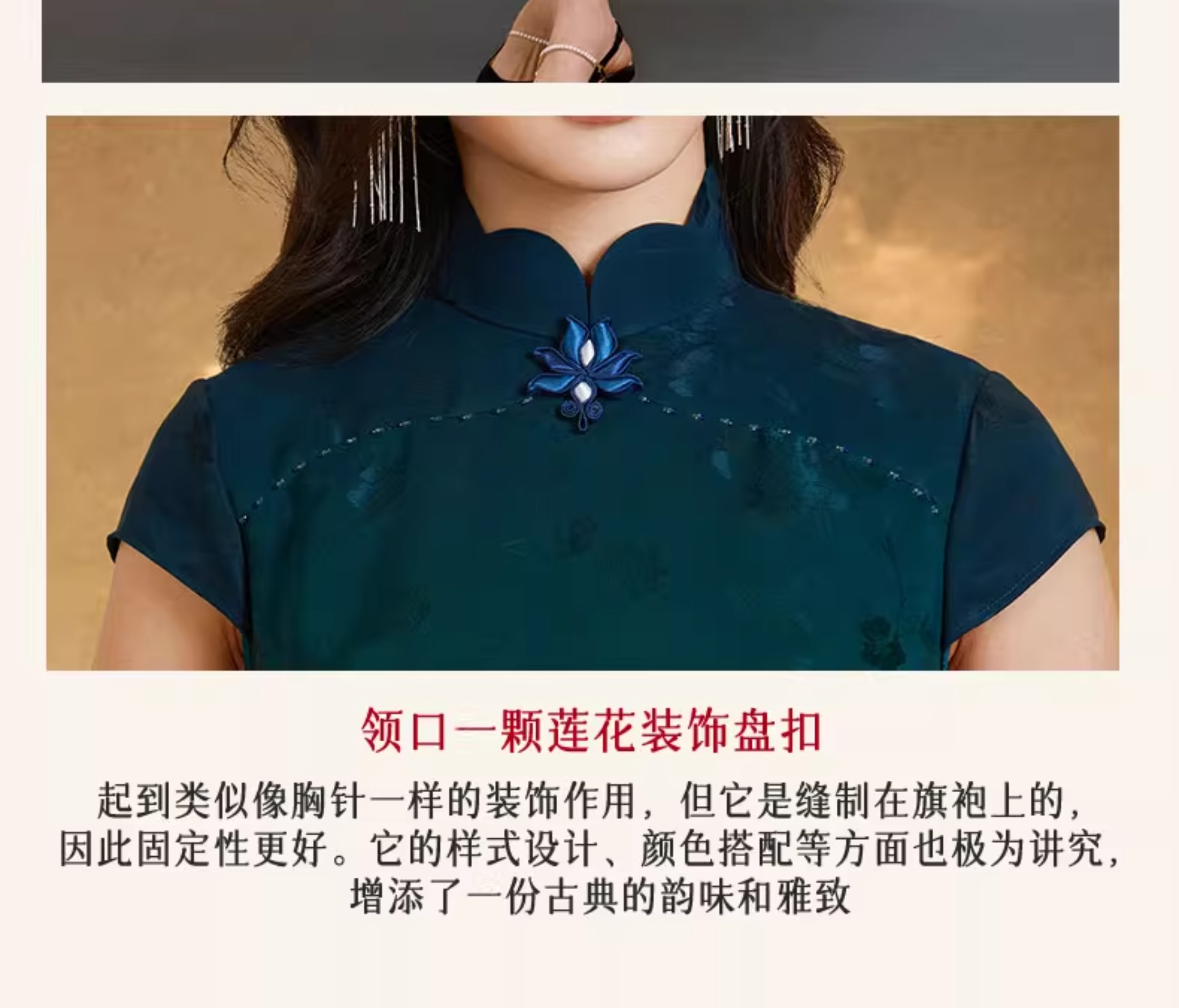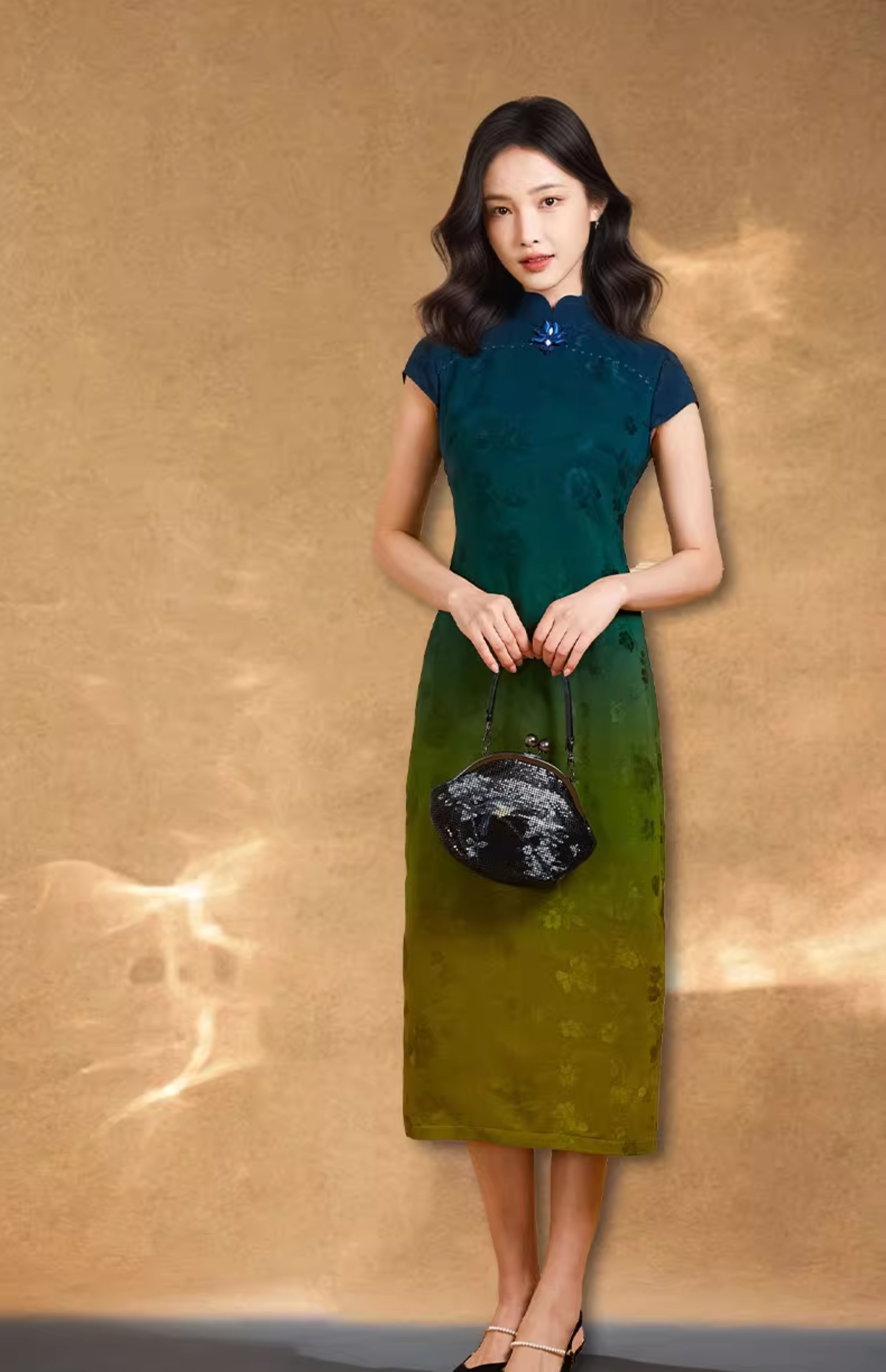逸红颜青沐2025夏新天然植物吊染渐变青绿花瓣领钉珠红云纱旗袍女