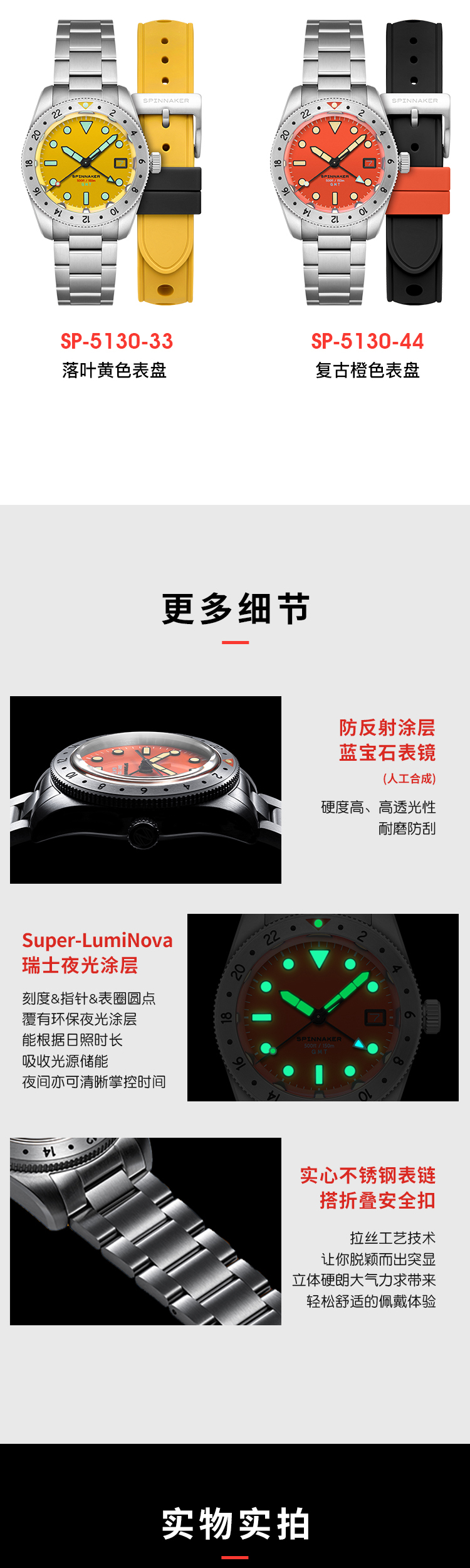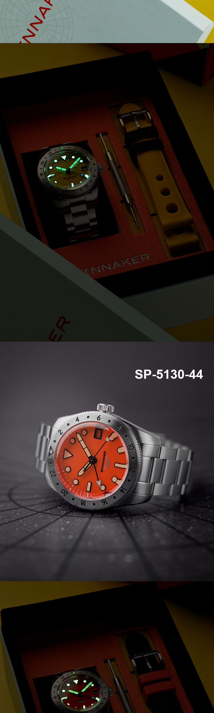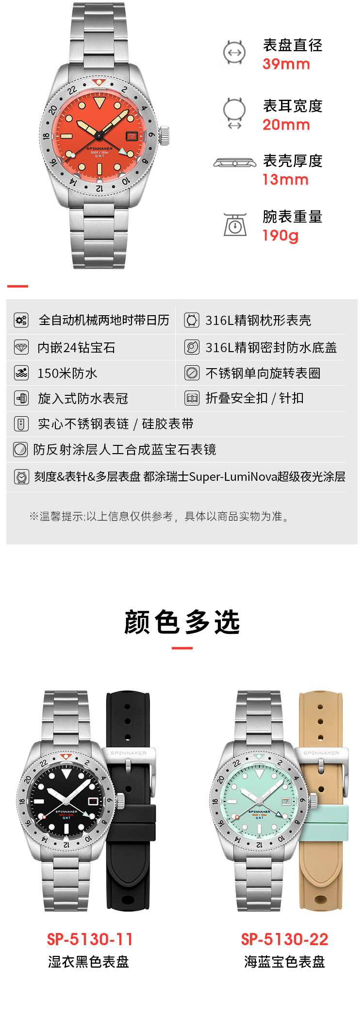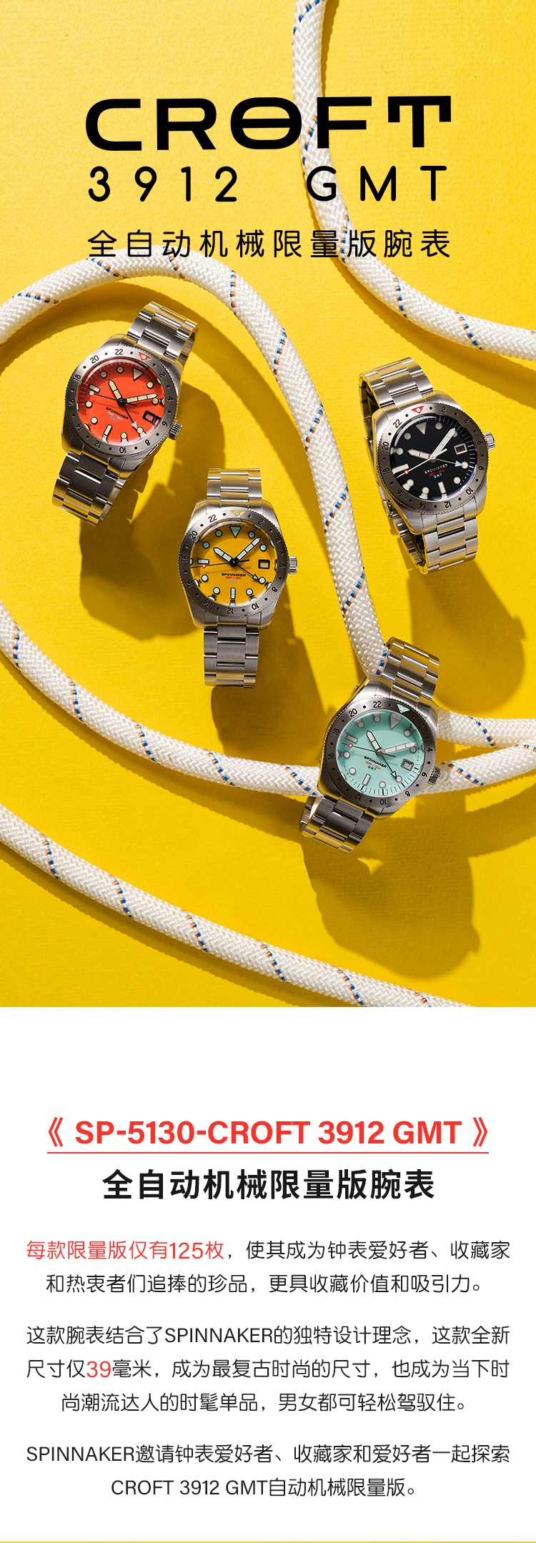 新款SPINNAKER三角帆39毫米限量版GMT两地时自动机械表夜光5130