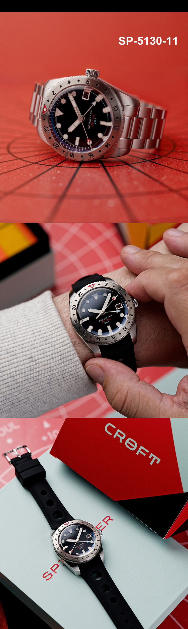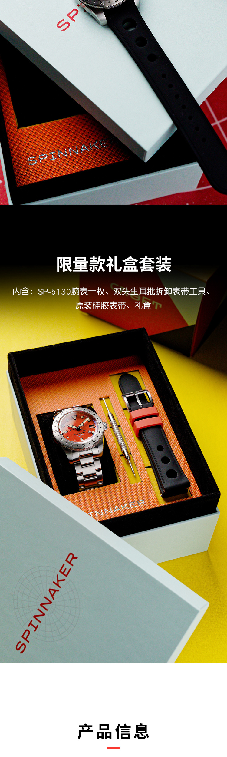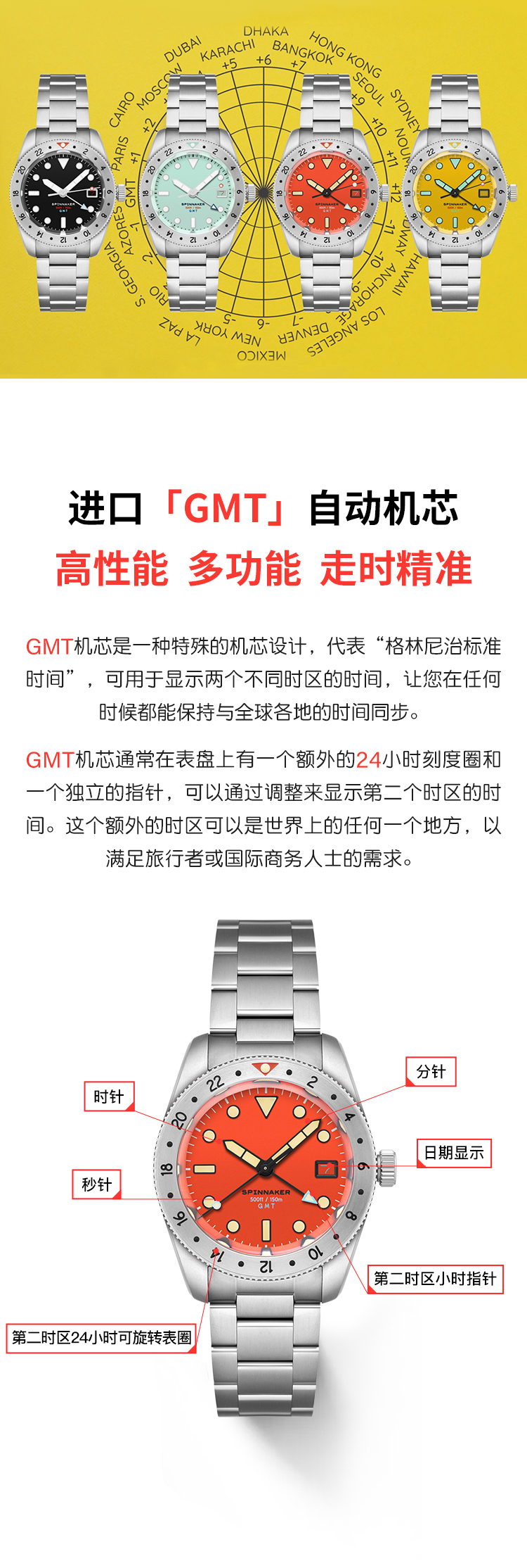 新款SPINNAKER三角帆39毫米限量版GMT两地时自动机械表夜光5130