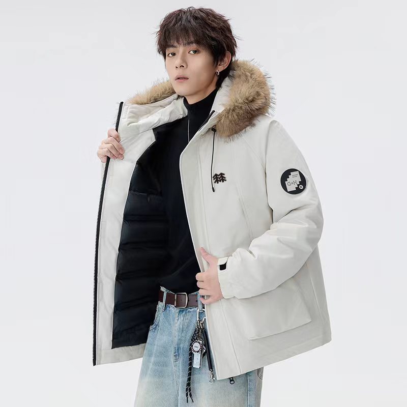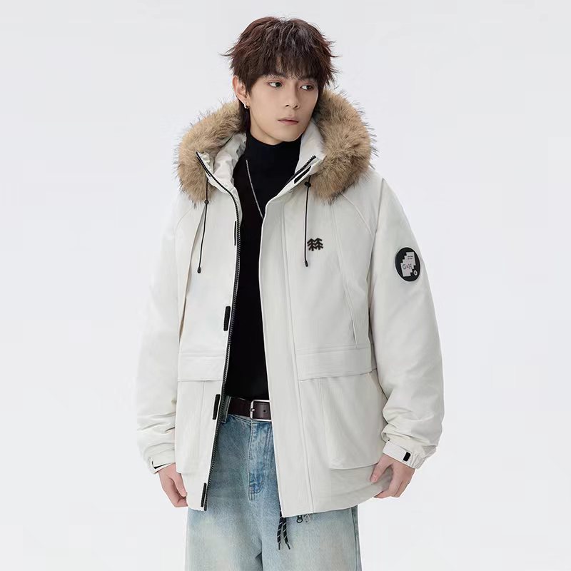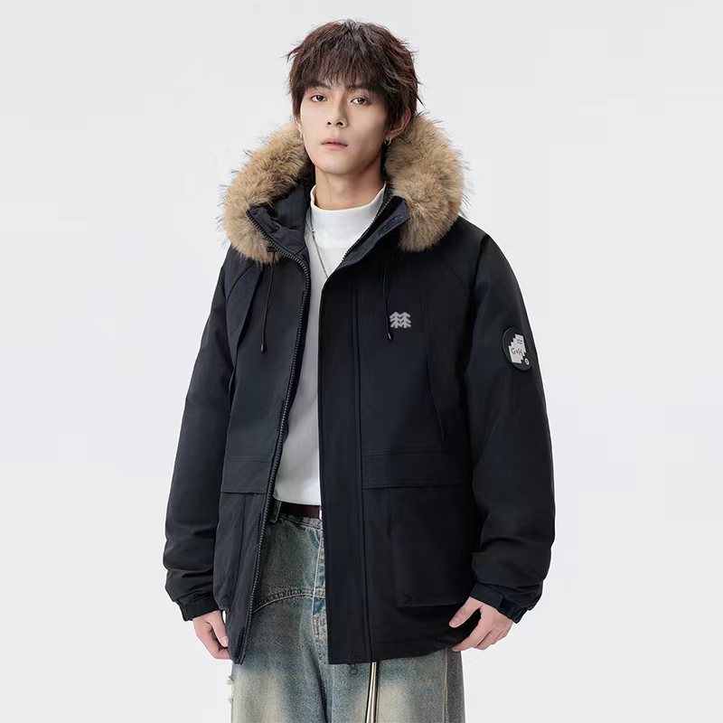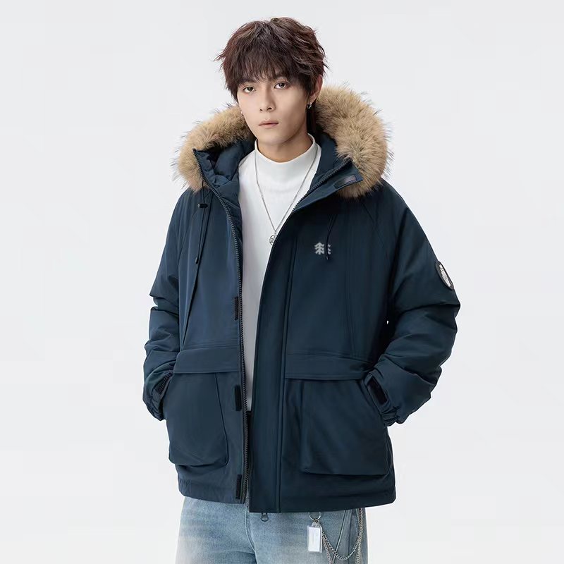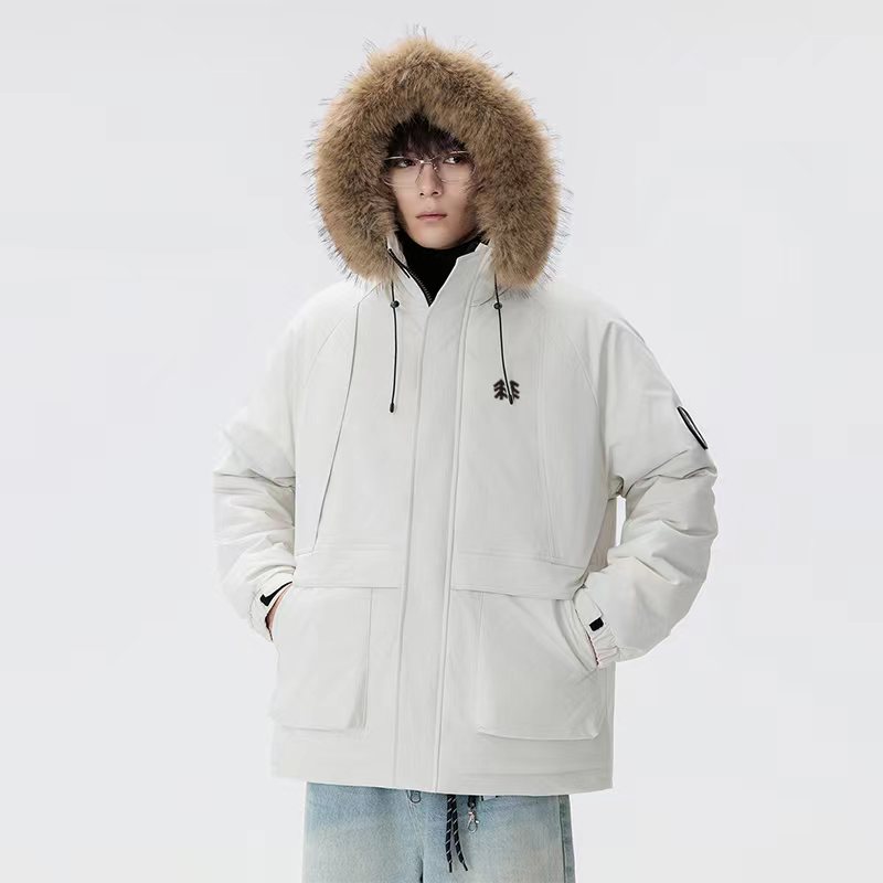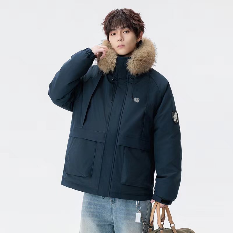 羽绒棉服貉子毛连帽派克棉衣外套,男女同款, 纯天然手塞羽绒棉填充,每个部分充棉饱满 给人温暖的的视觉感观!前面硅胶logo,情侣闺蜜搭配更佳!