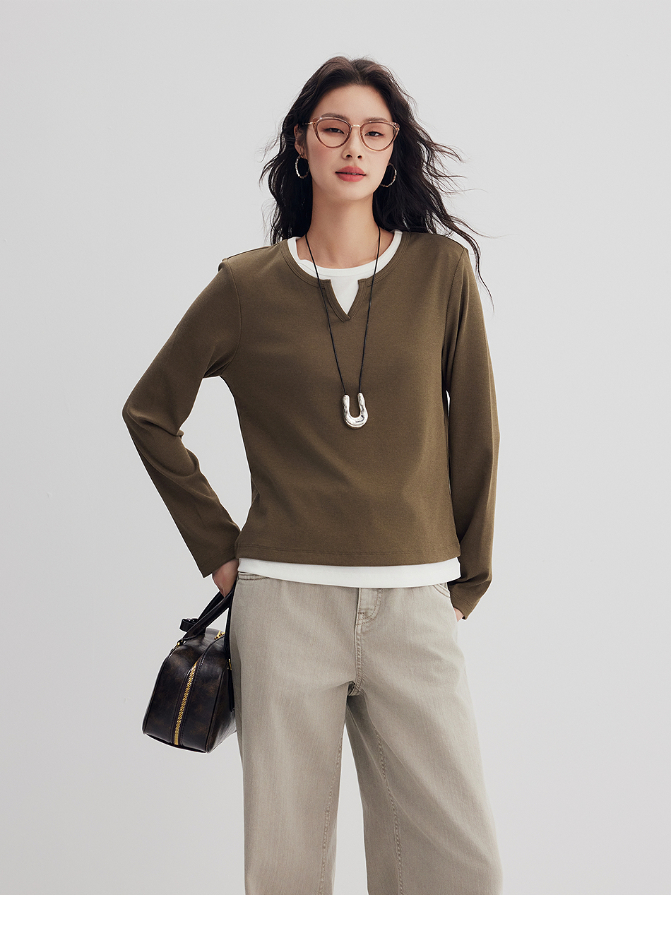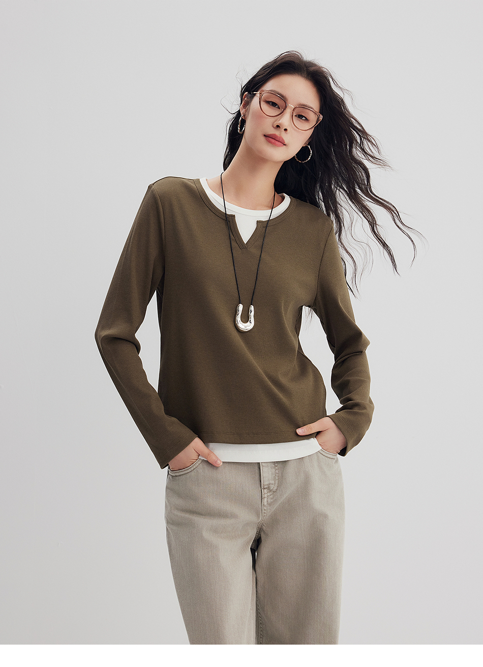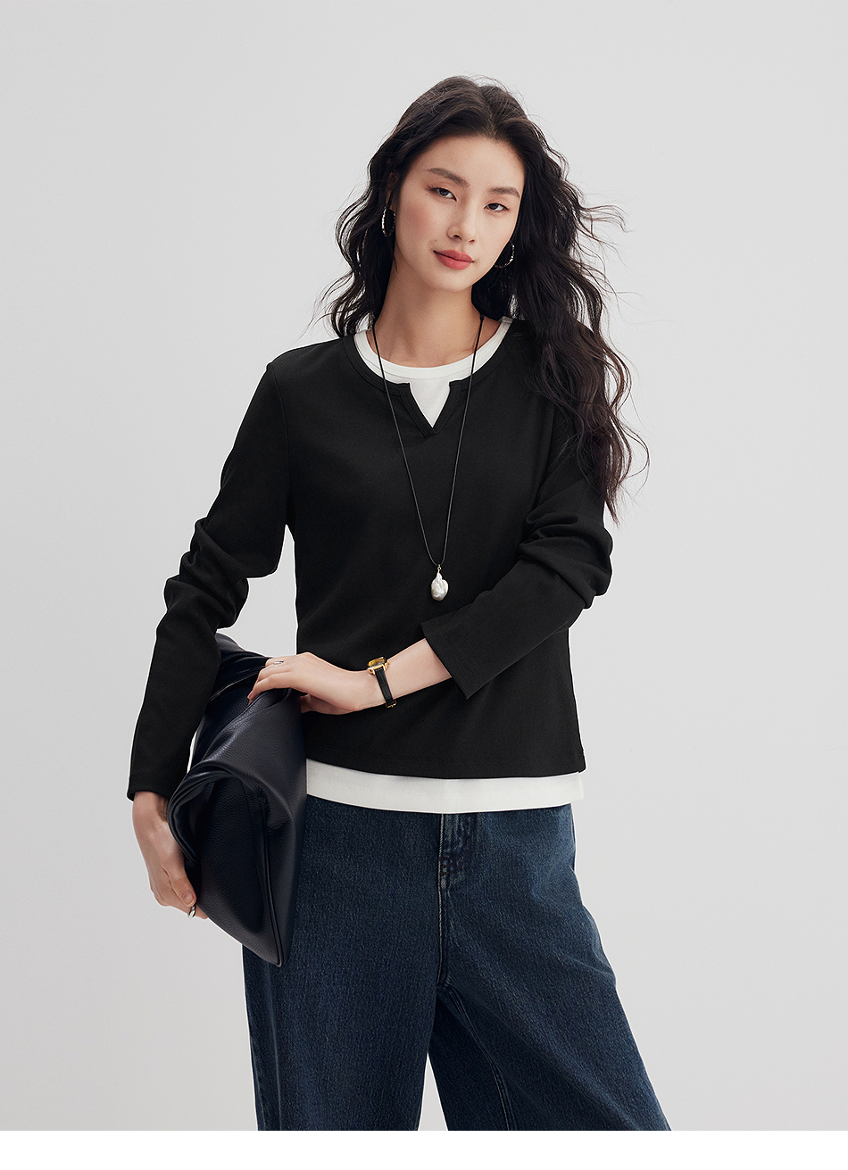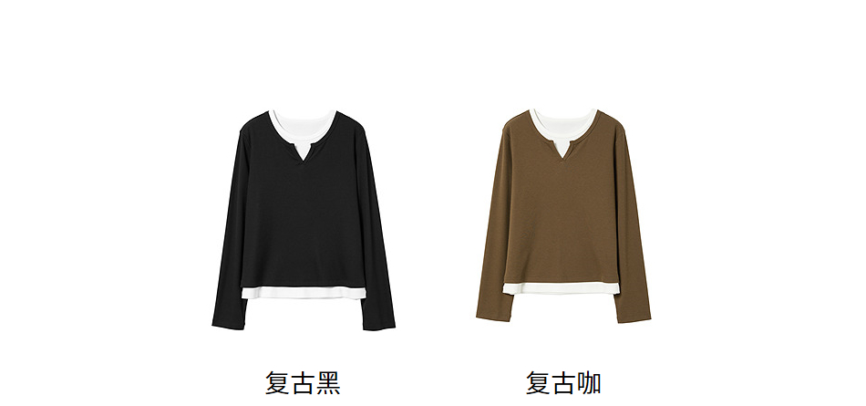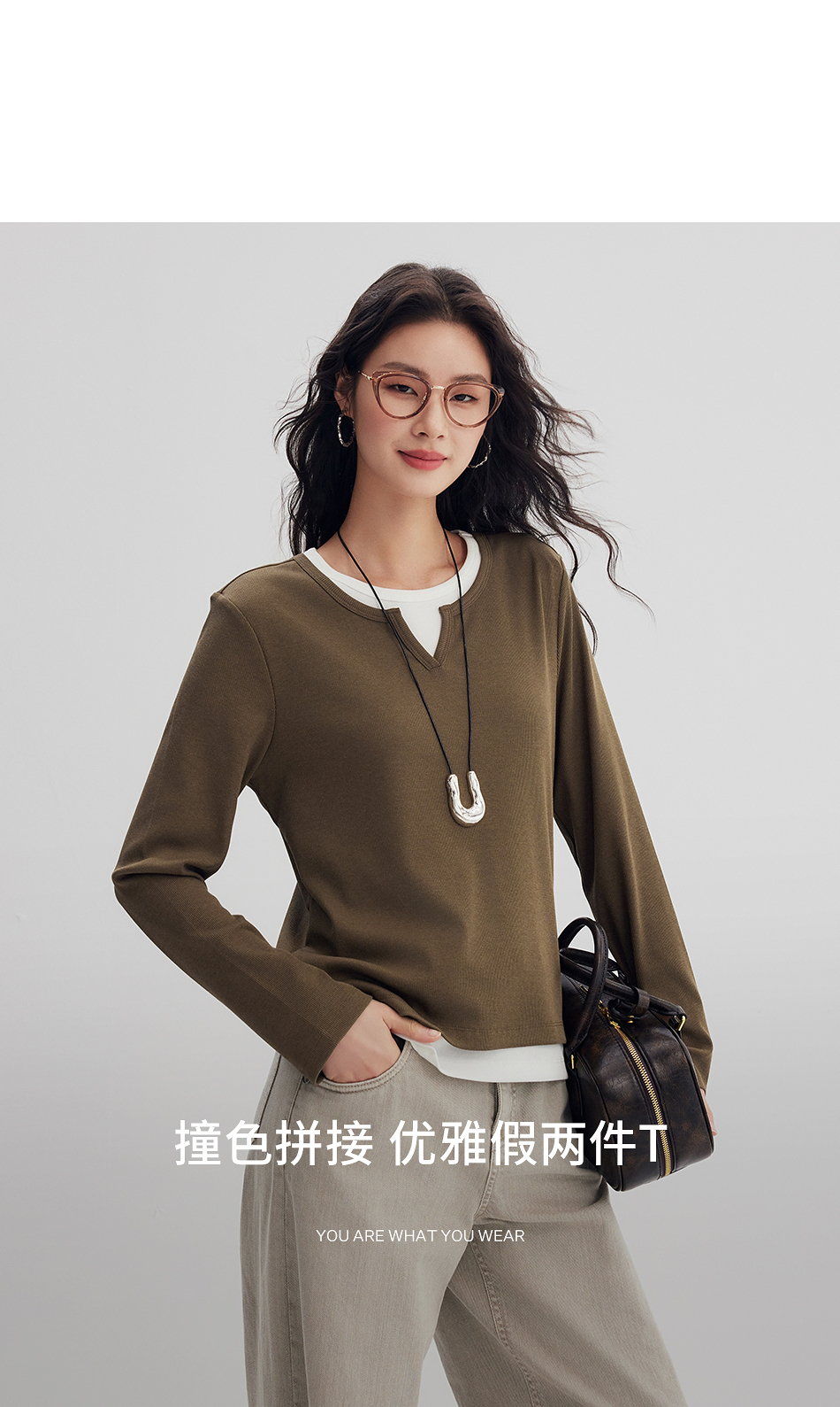棉仓356601006-优雅假两件小V领合体微宽松T