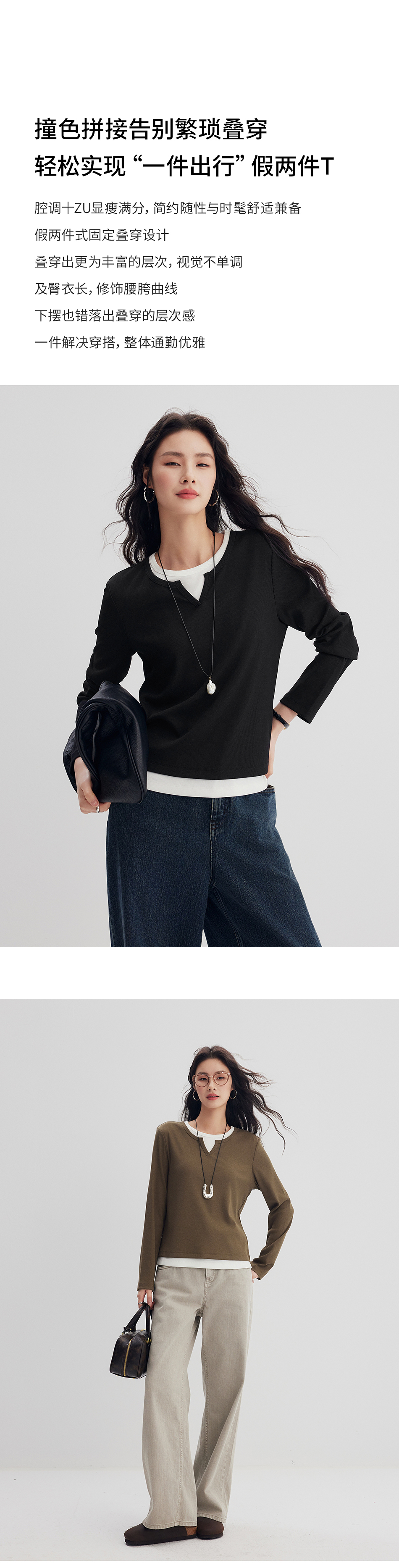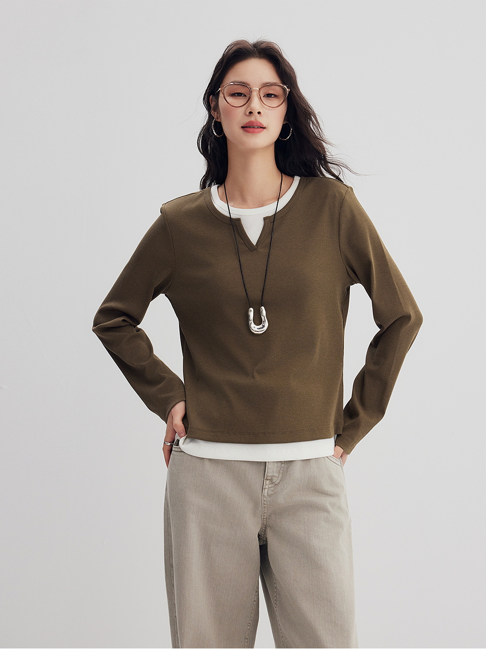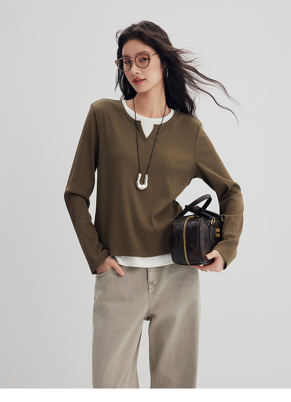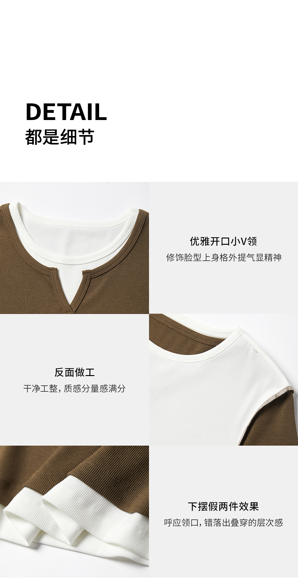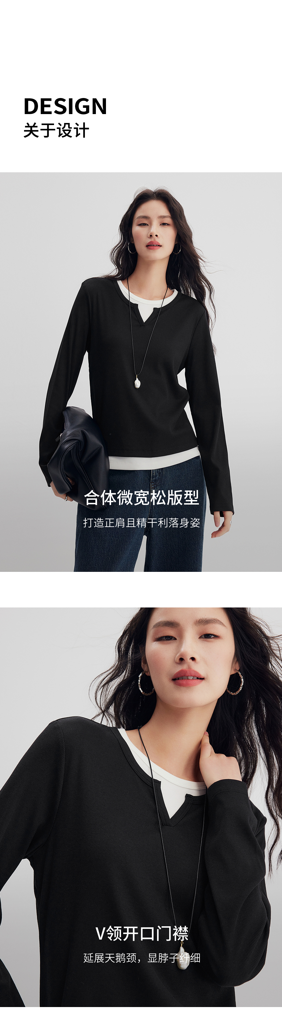 棉仓356601006-优雅假两件小V领合体微宽松T