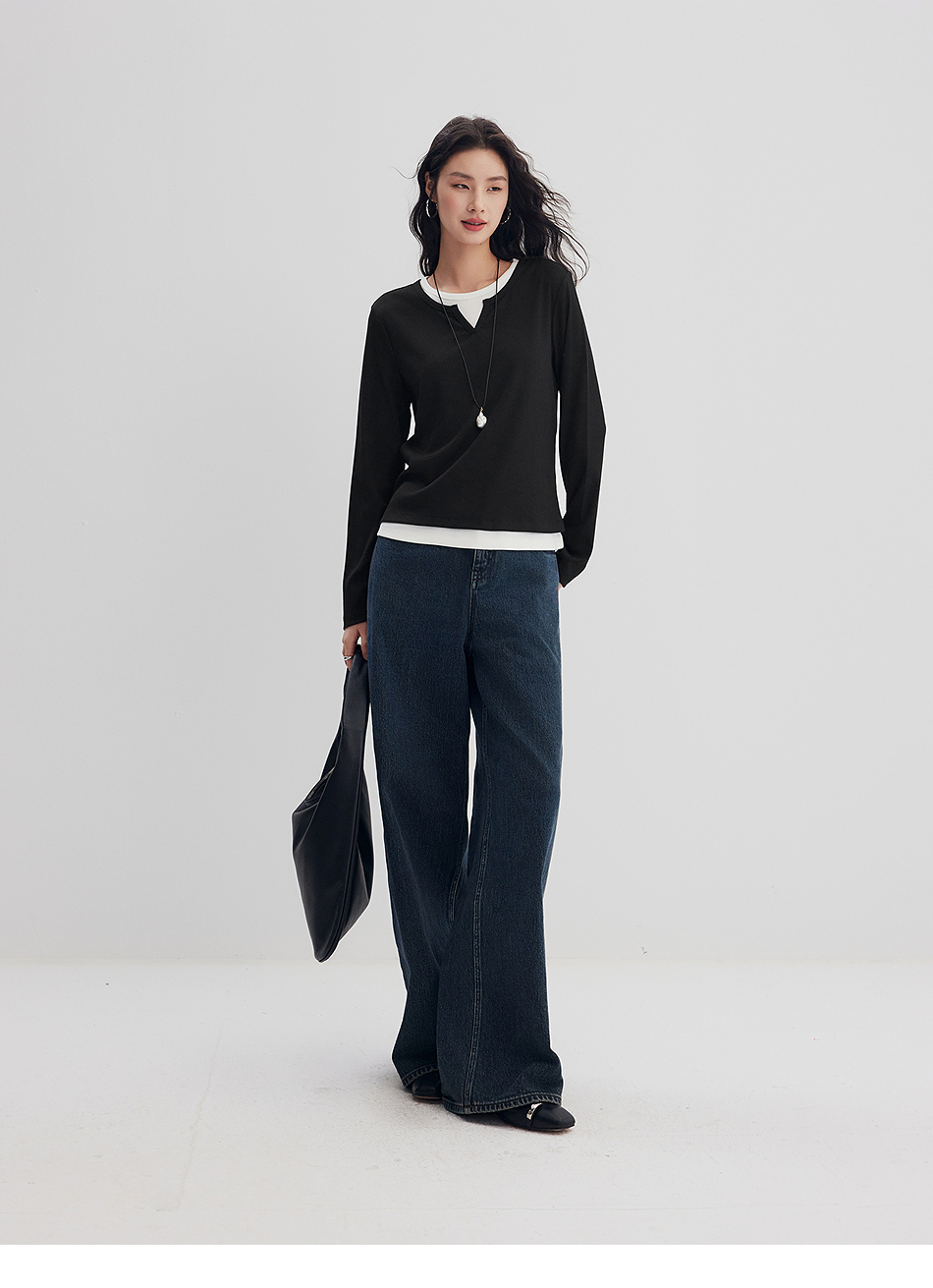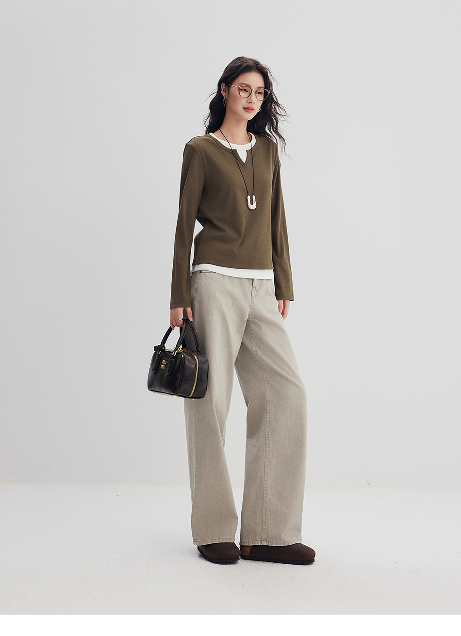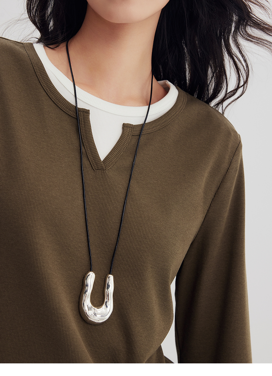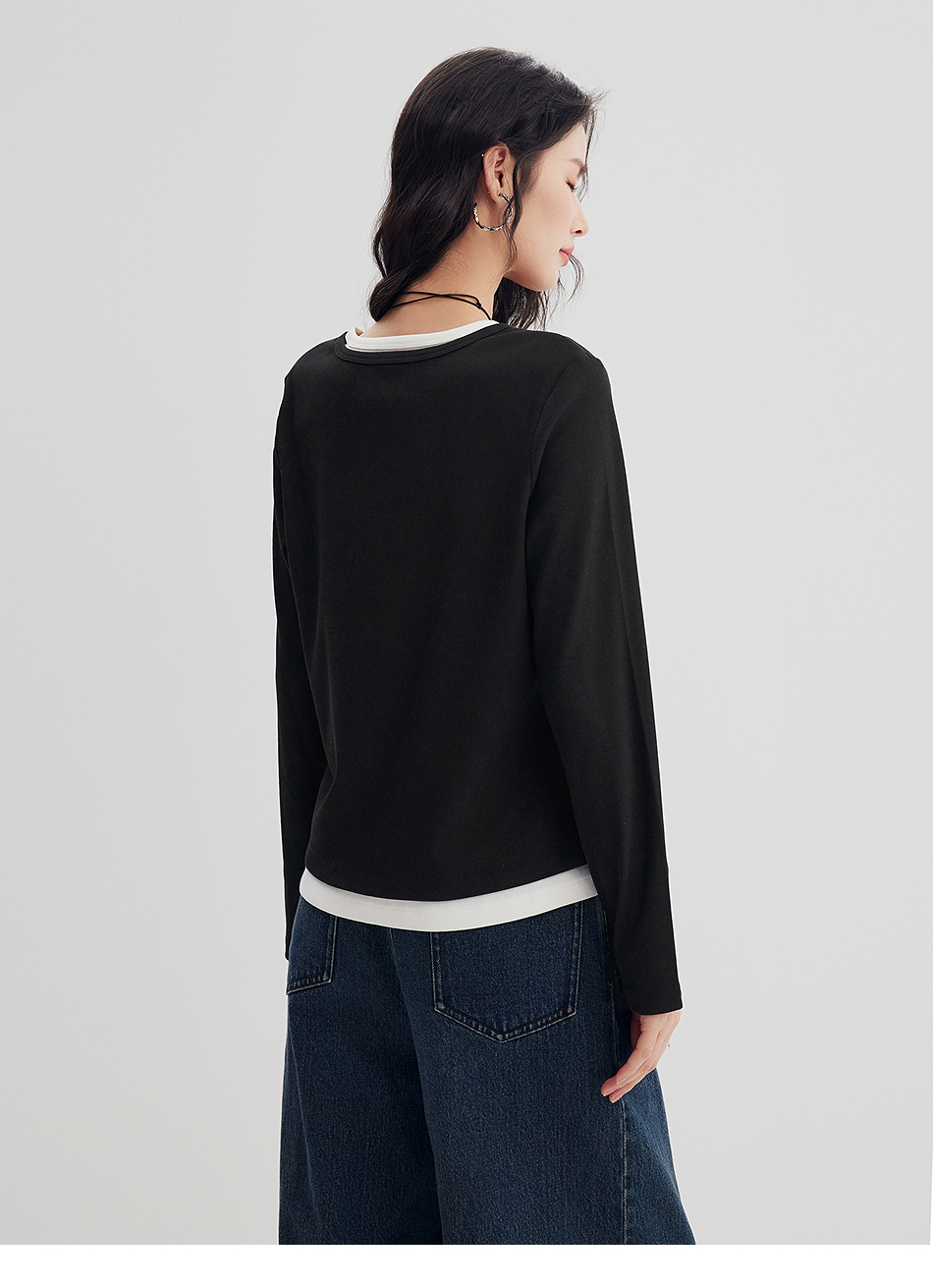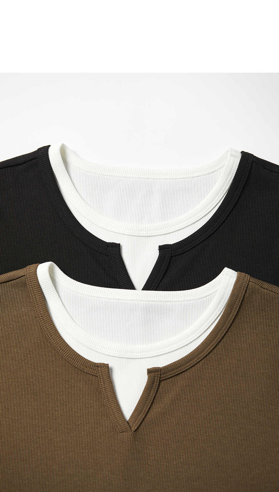 棉仓356601006-优雅假两件小V领合体微宽松T