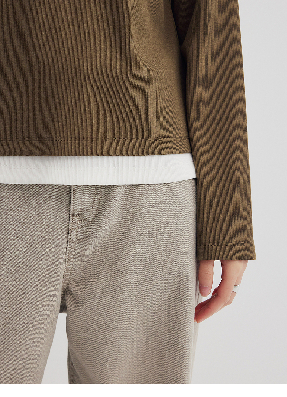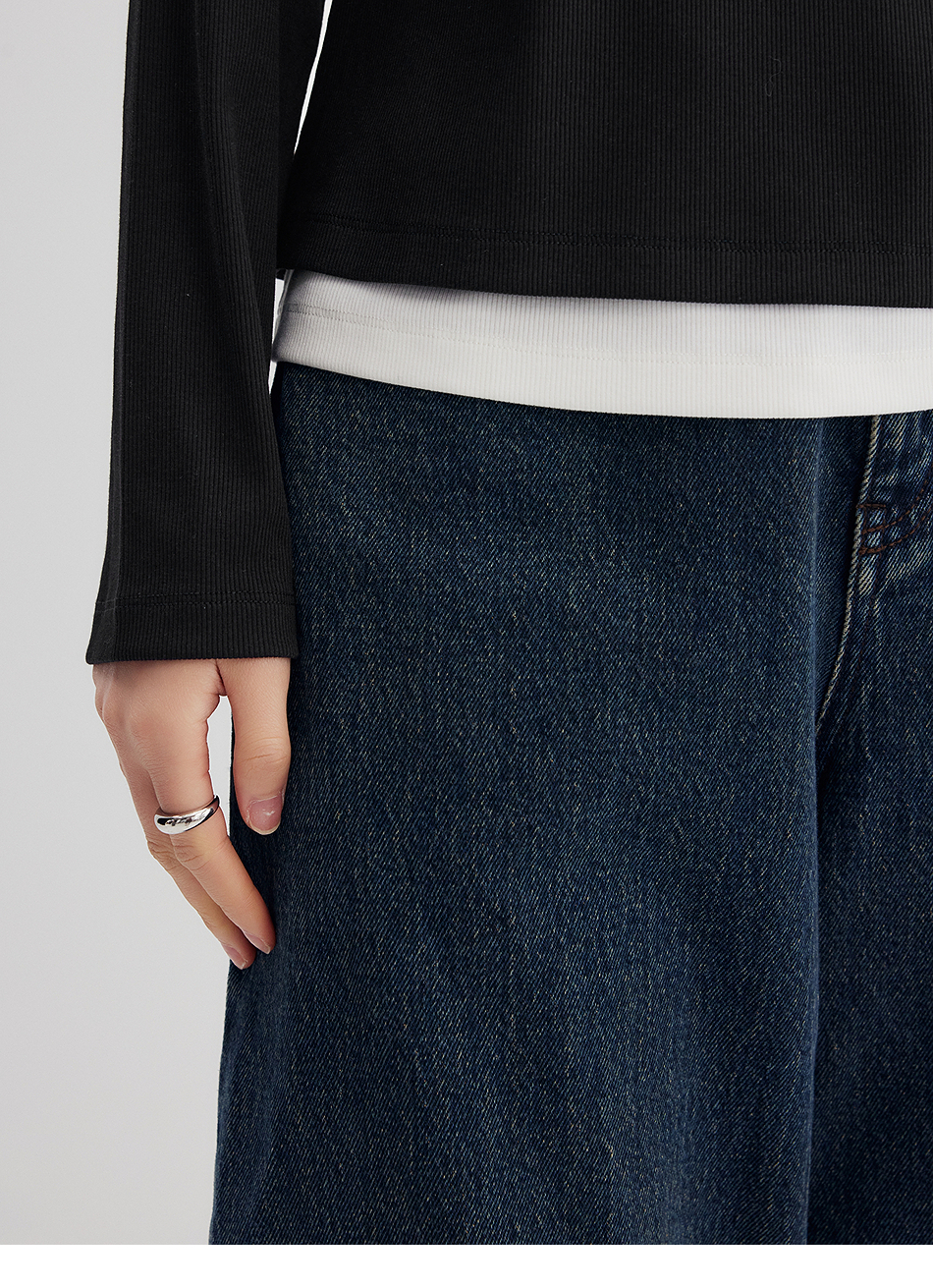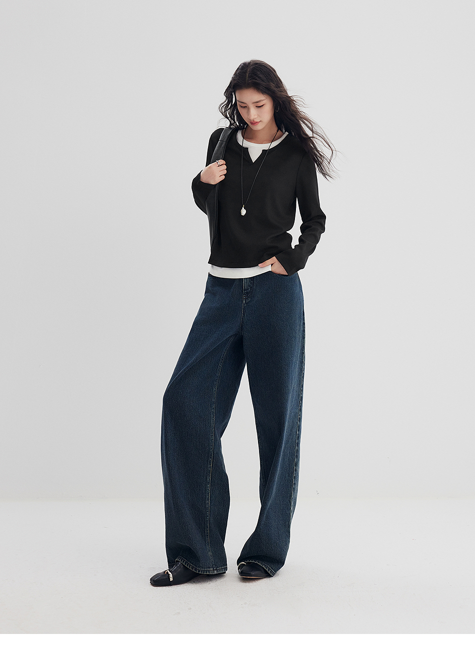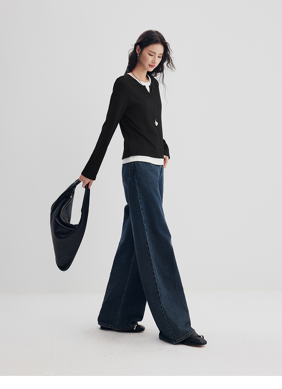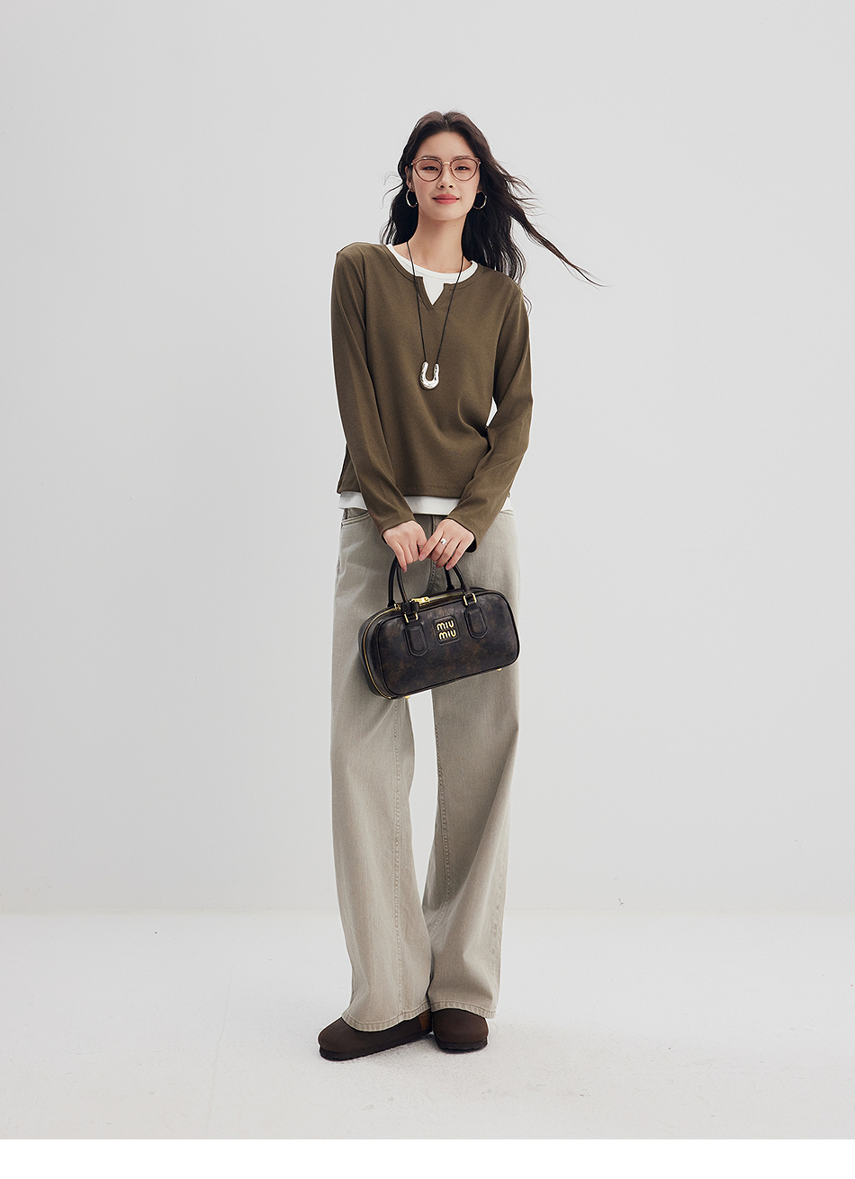 棉仓356601006-优雅假两件小V领合体微宽松T