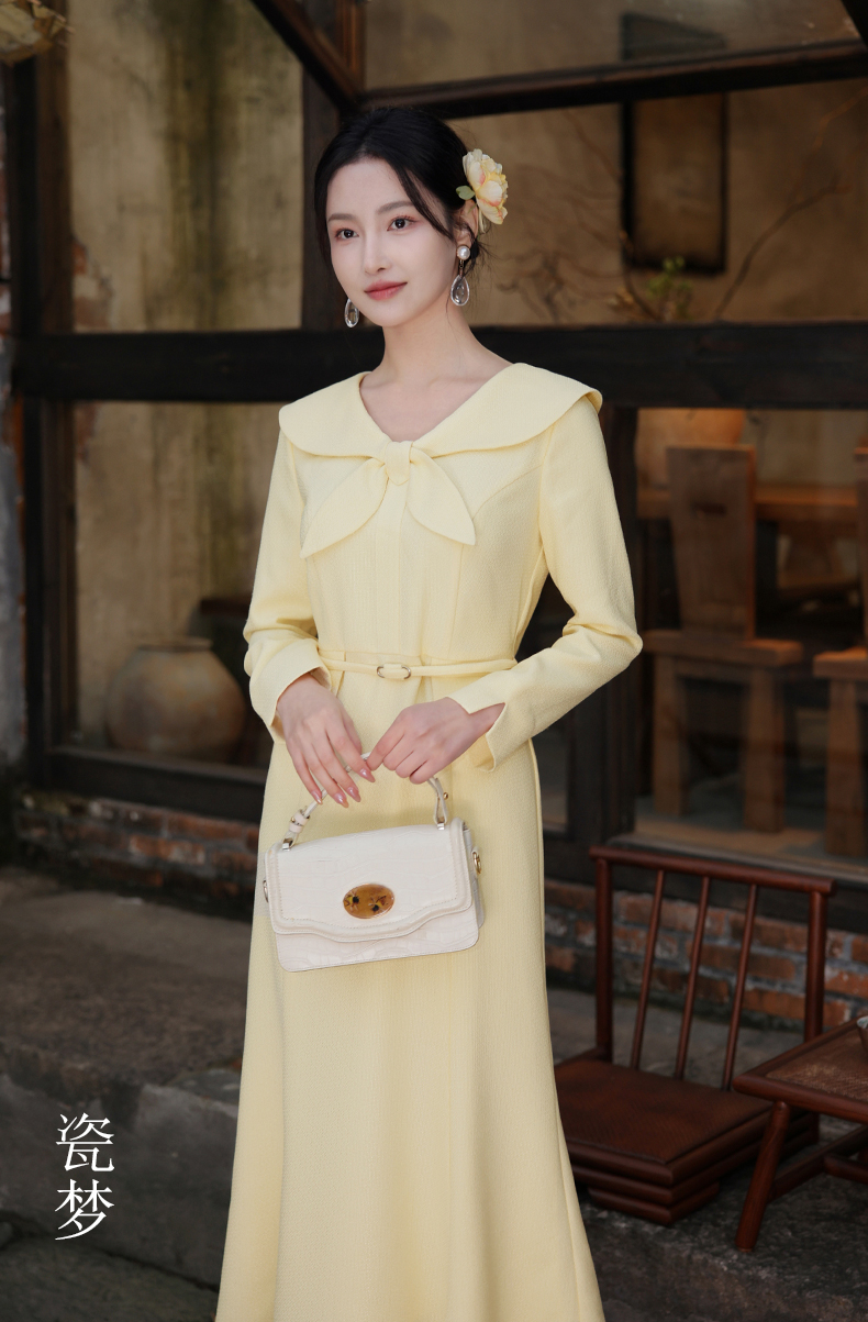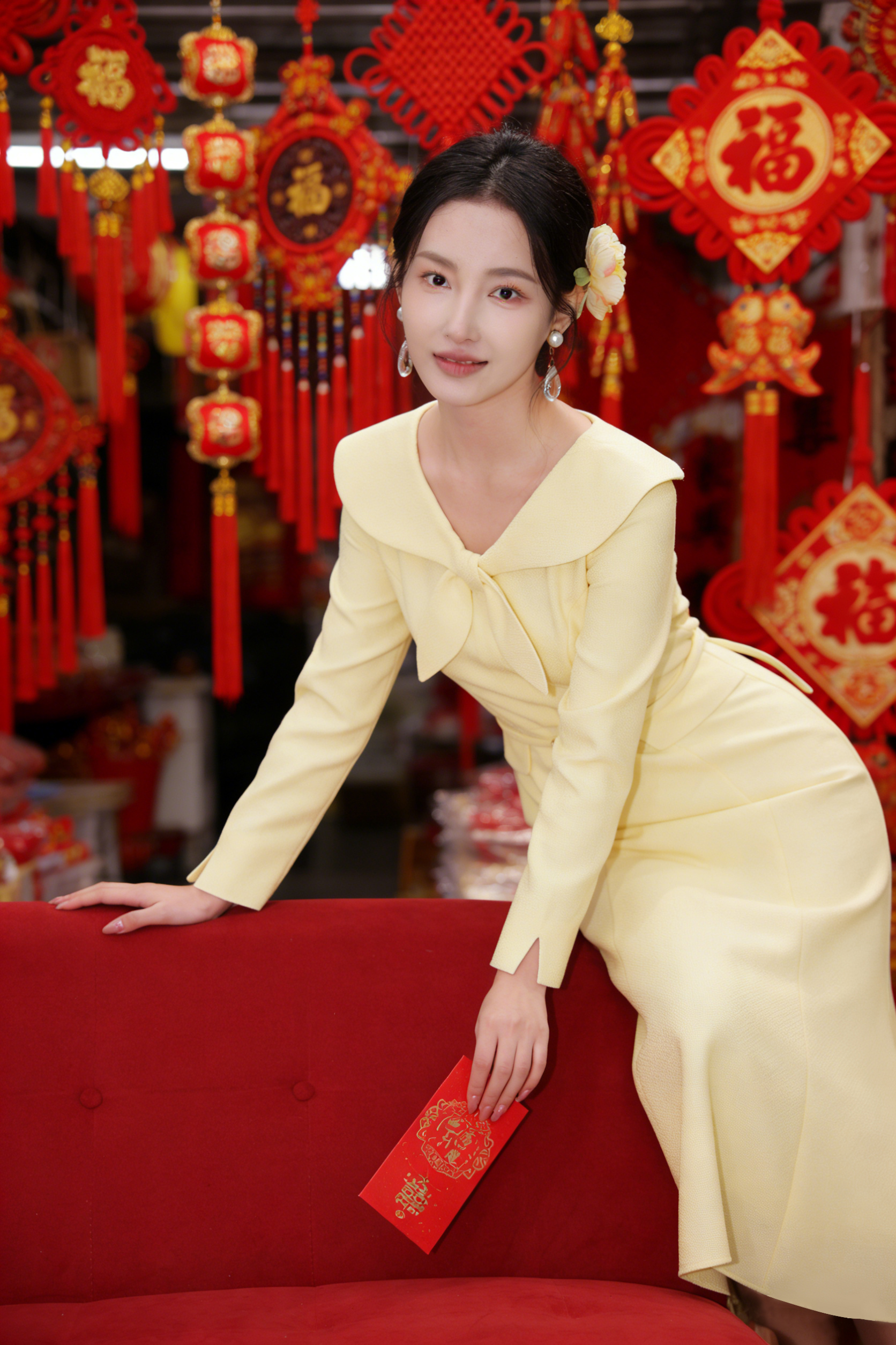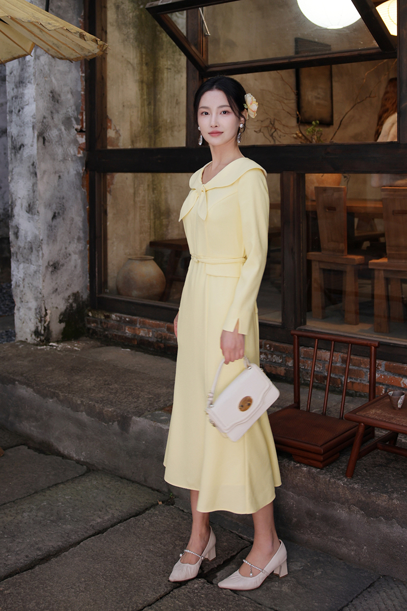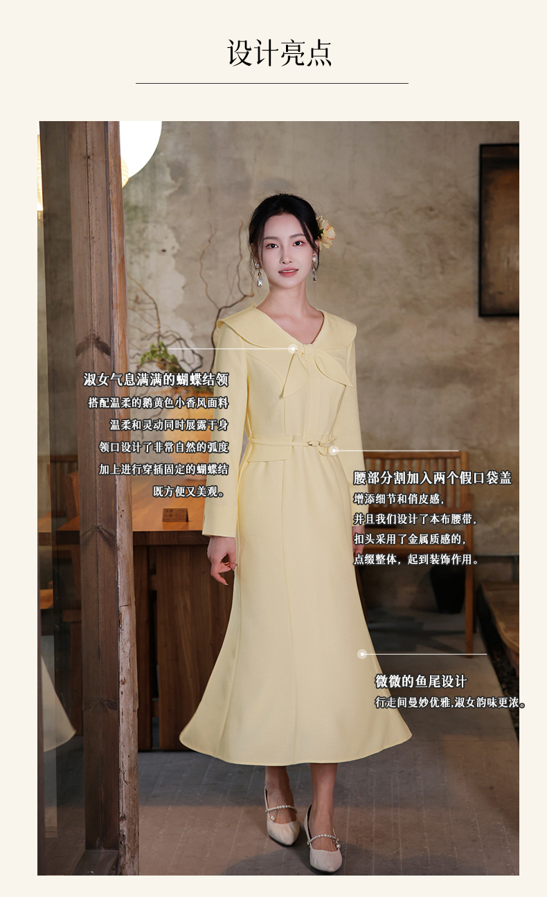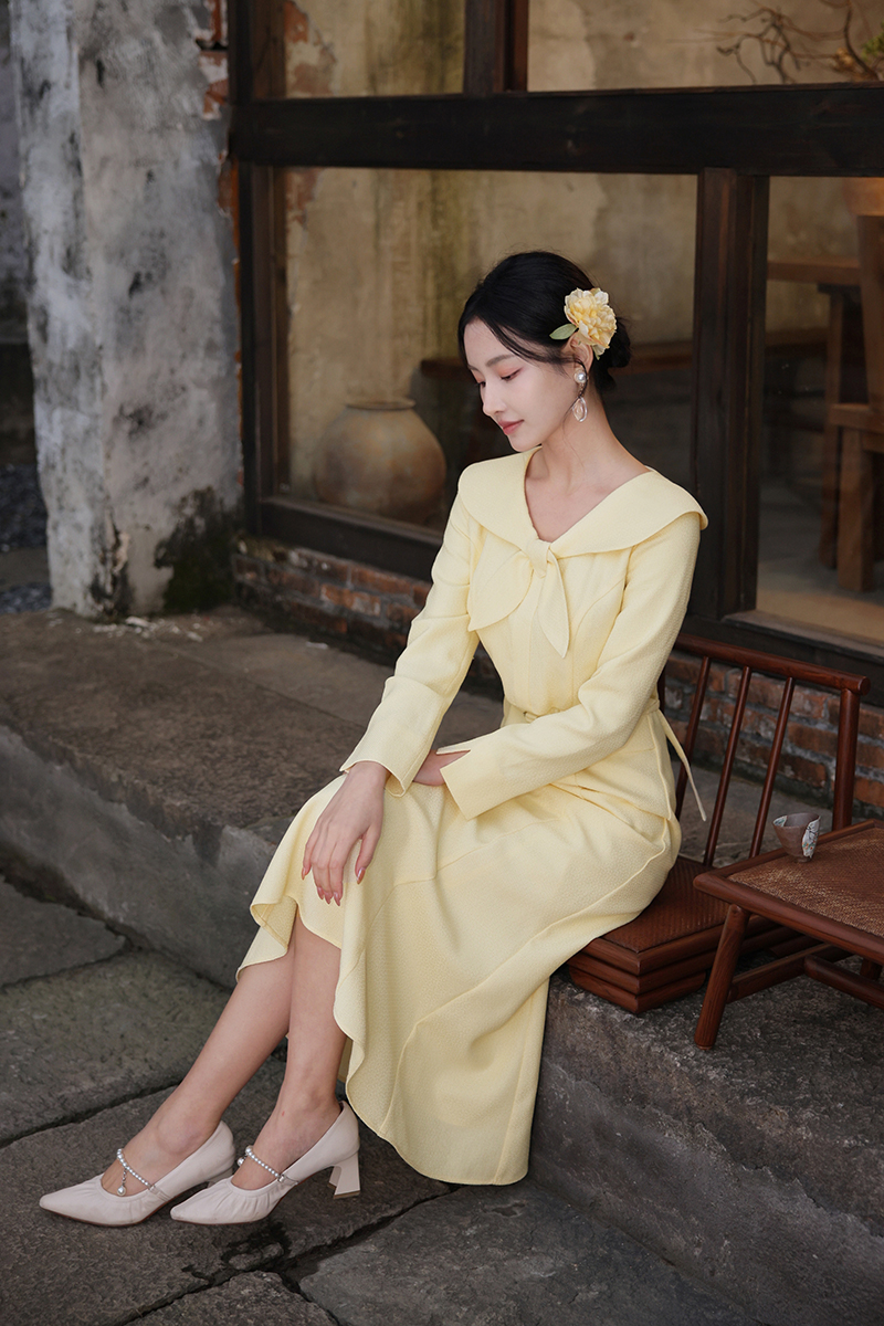 柔和鹅黄衬得气色透亮又高级,大翻领 + 蝴蝶结甜而不腻,收腰鱼尾裙把身段衬得刚刚好,逛年市、约闺蜜聚会都得体又吸睛~