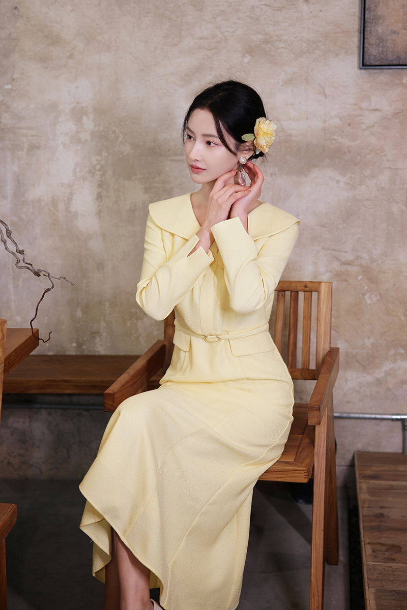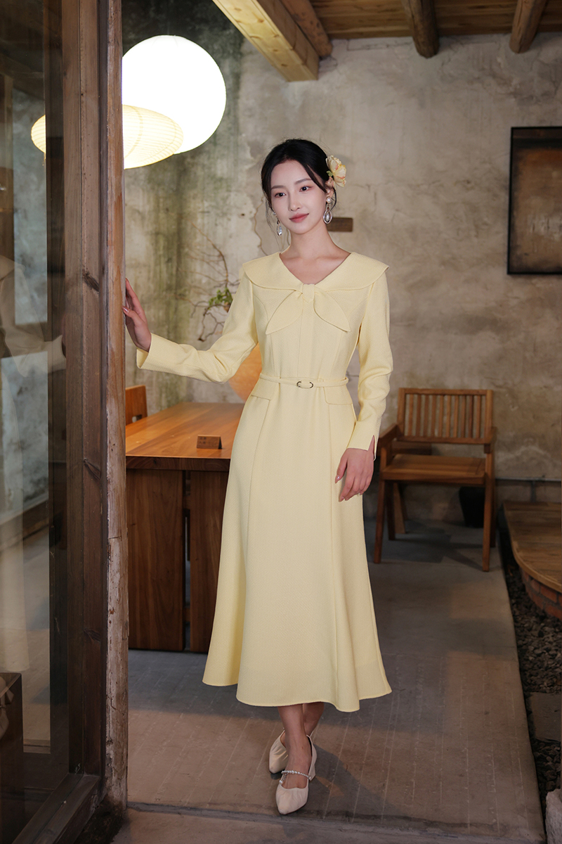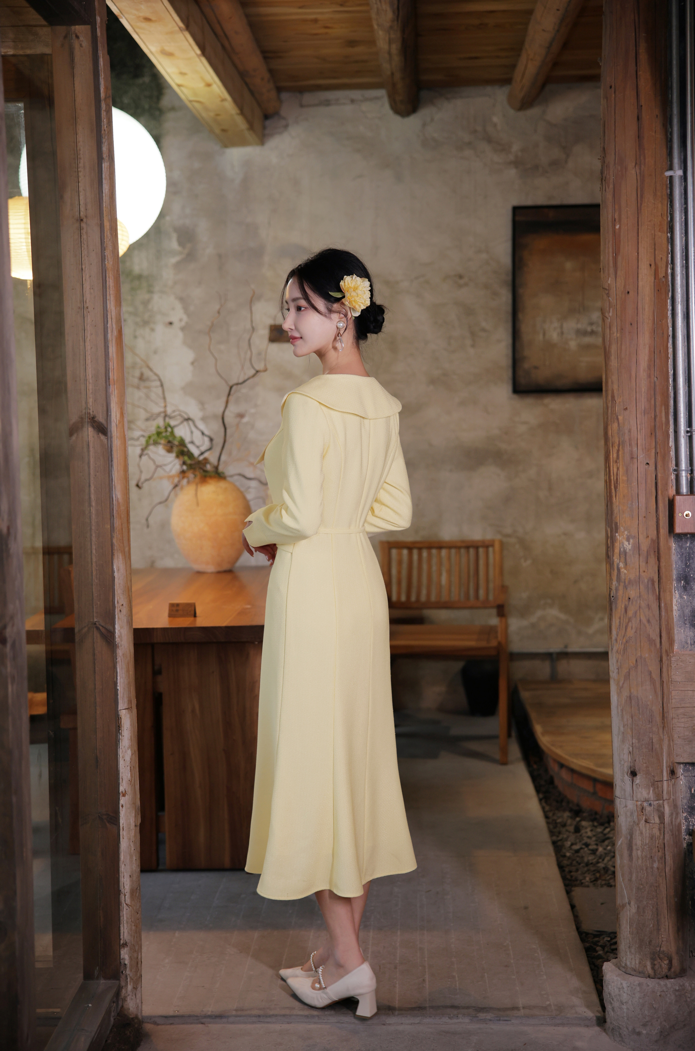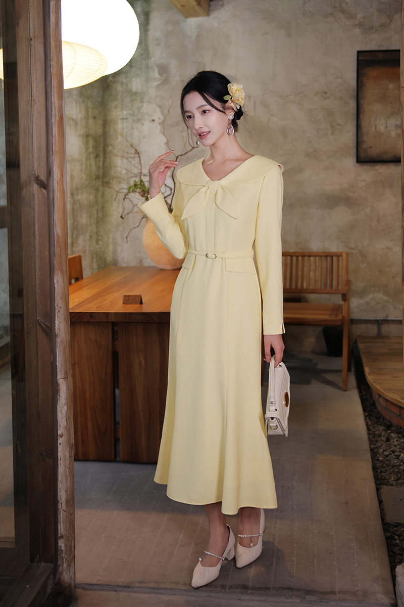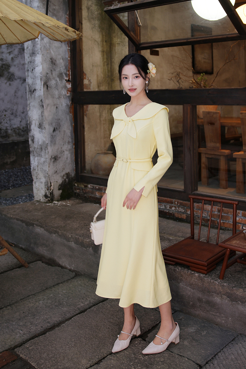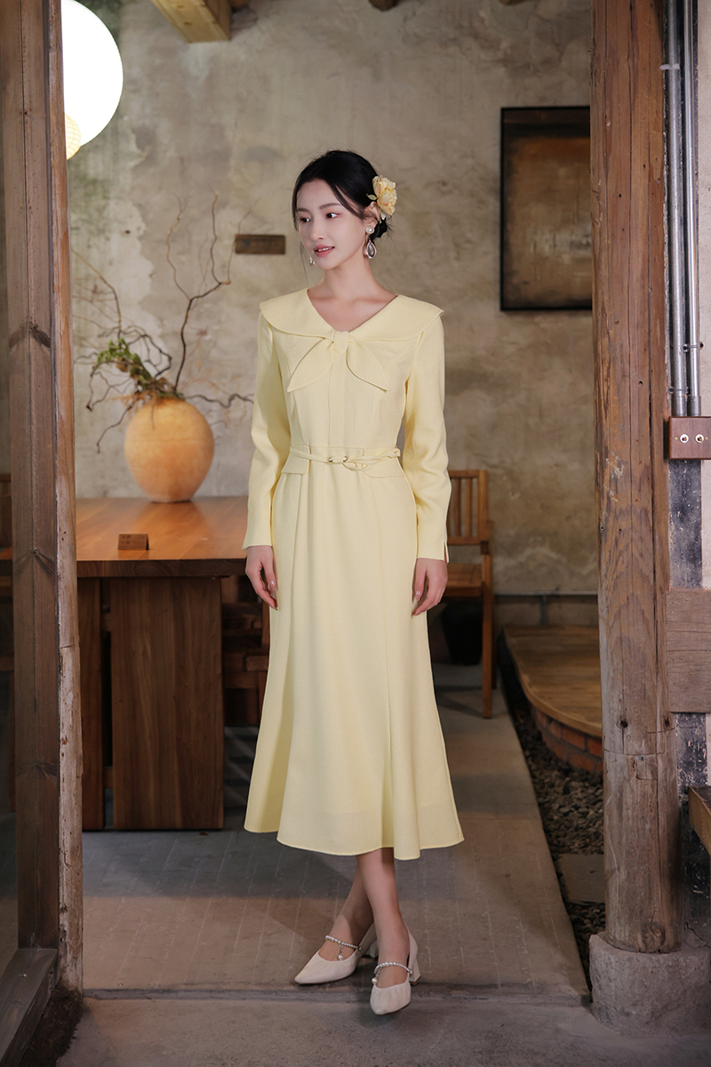 柔和鹅黄衬得气色透亮又高级,大翻领 + 蝴蝶结甜而不腻,收腰鱼尾裙把身段衬得刚刚好,逛年市、约闺蜜聚会都得体又吸睛~
