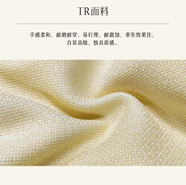 面:TR 织料,柔垂亲肤,韧如轻罗,不易皱好打理,似江南浣纱后的春绸,一身清贵皆在肌理。