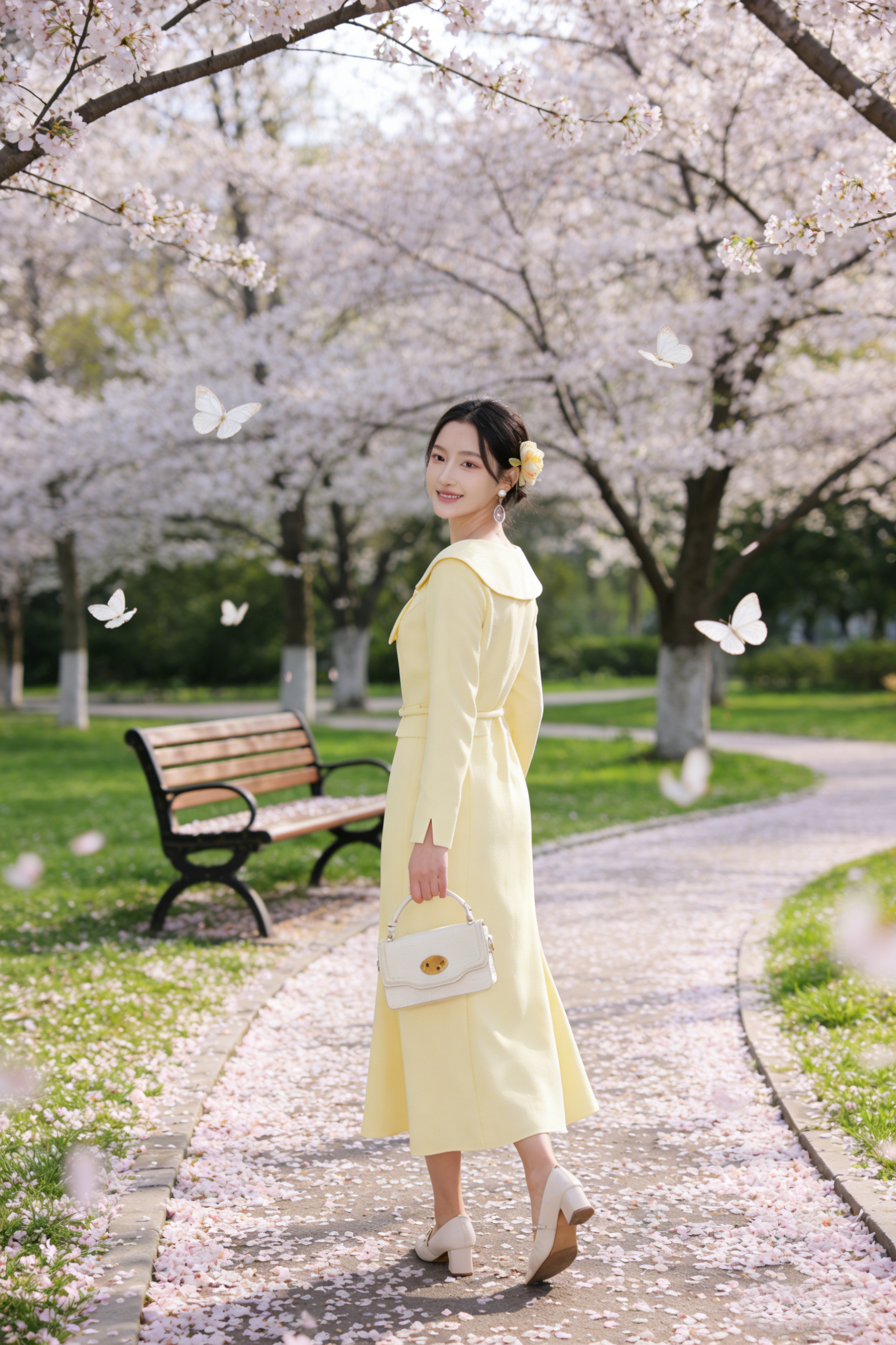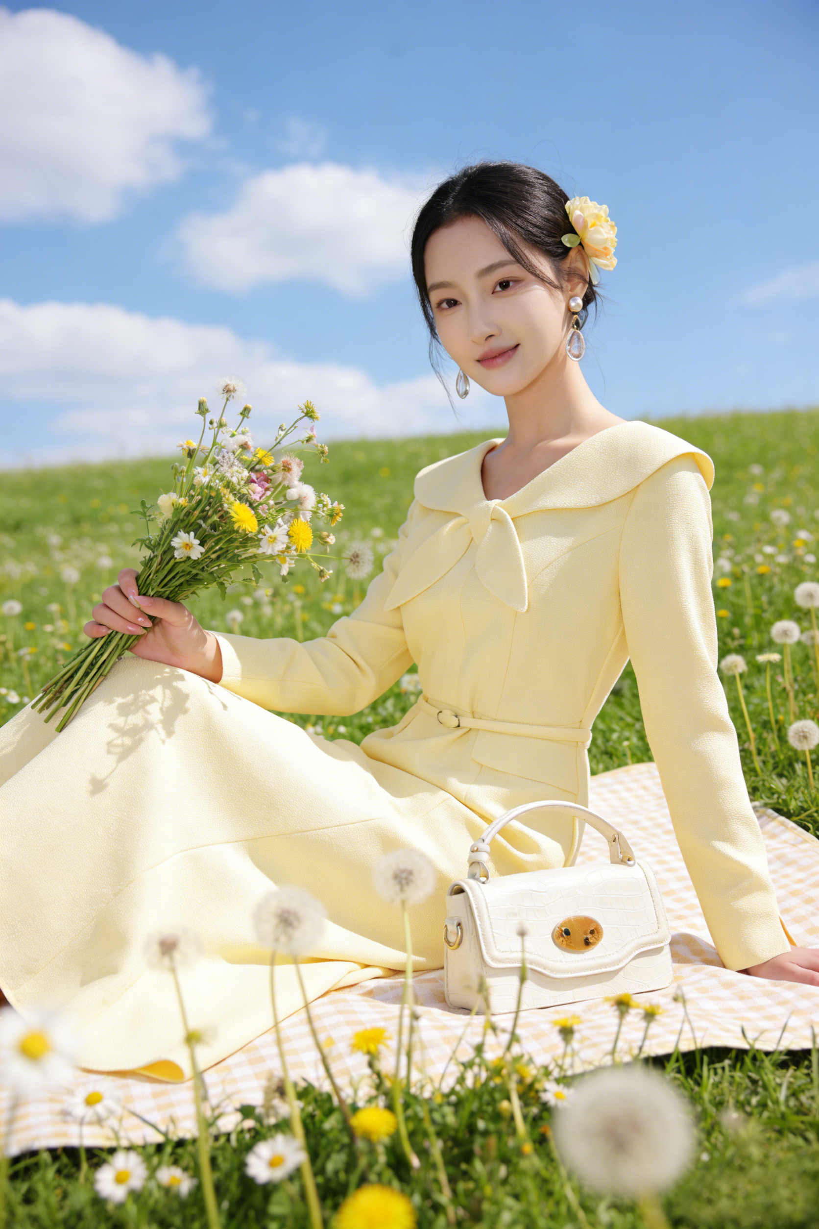 浅黄连衣裙是春天的入场券~坐在蒲公英漫野的草地上,风裹着花香往裙摆里钻;或是踩着落樱小径走,连蝴蝶都要为这抹温柔停一停。