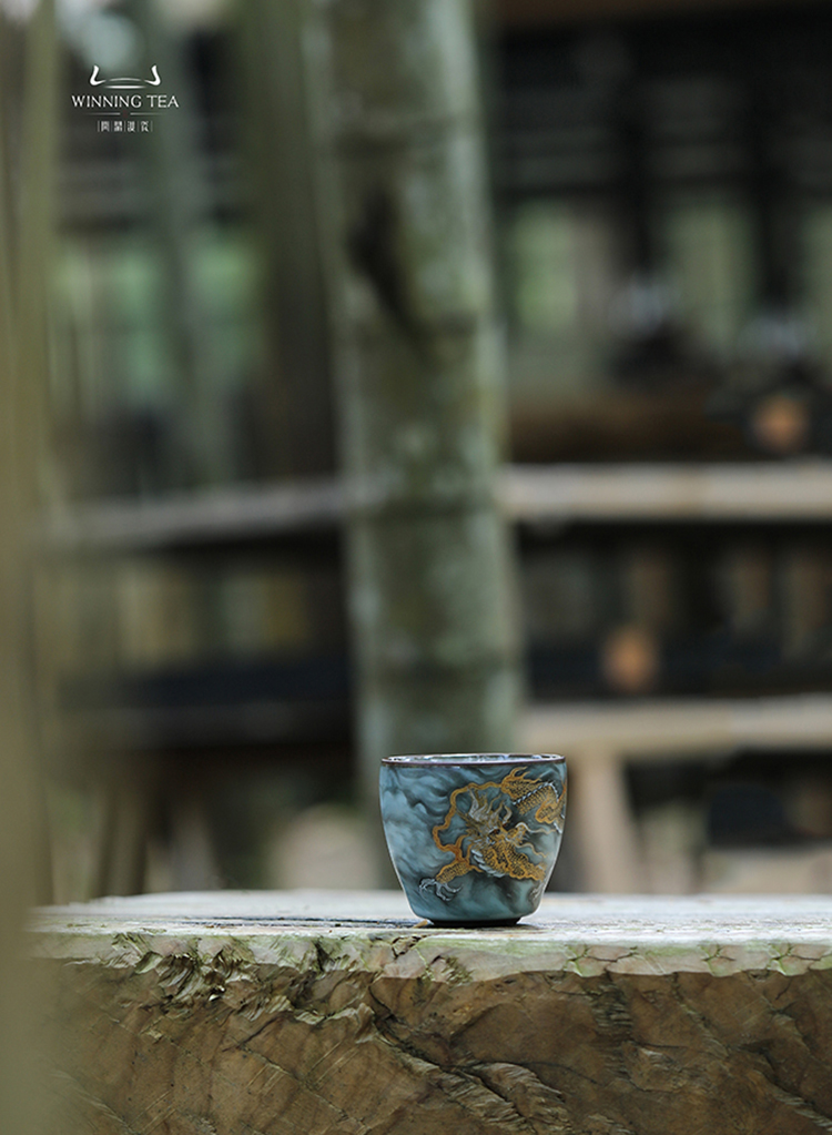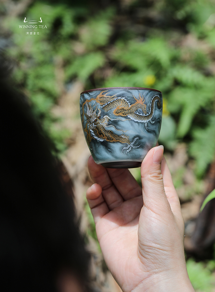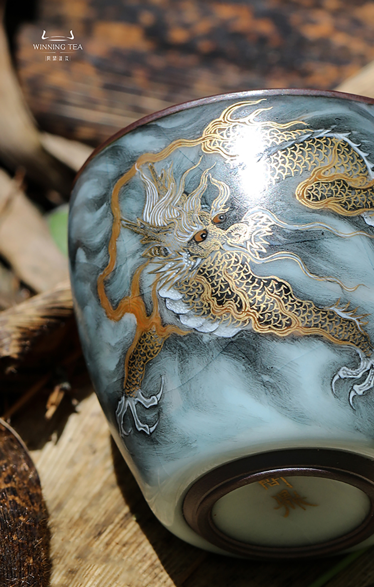 问鼎铁胎汝窑青枫杯(墨彩描金龙纹)