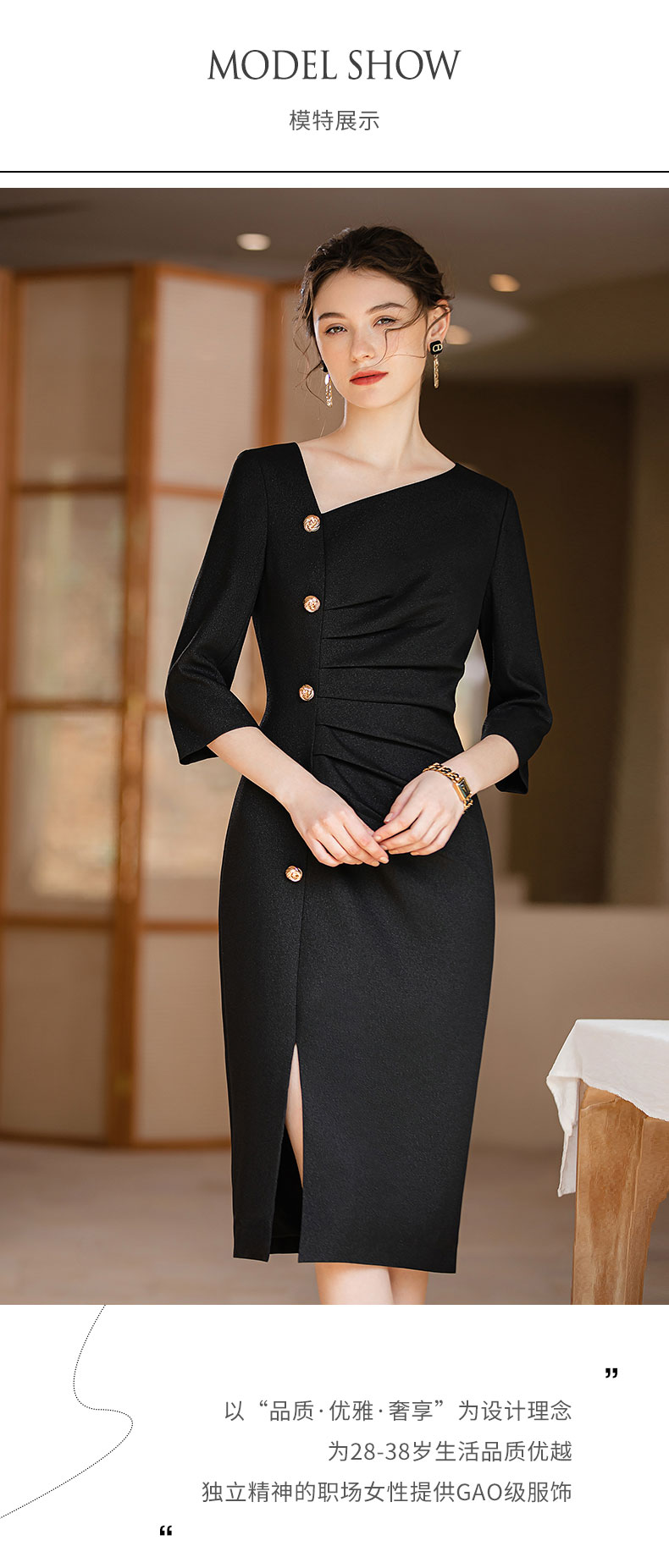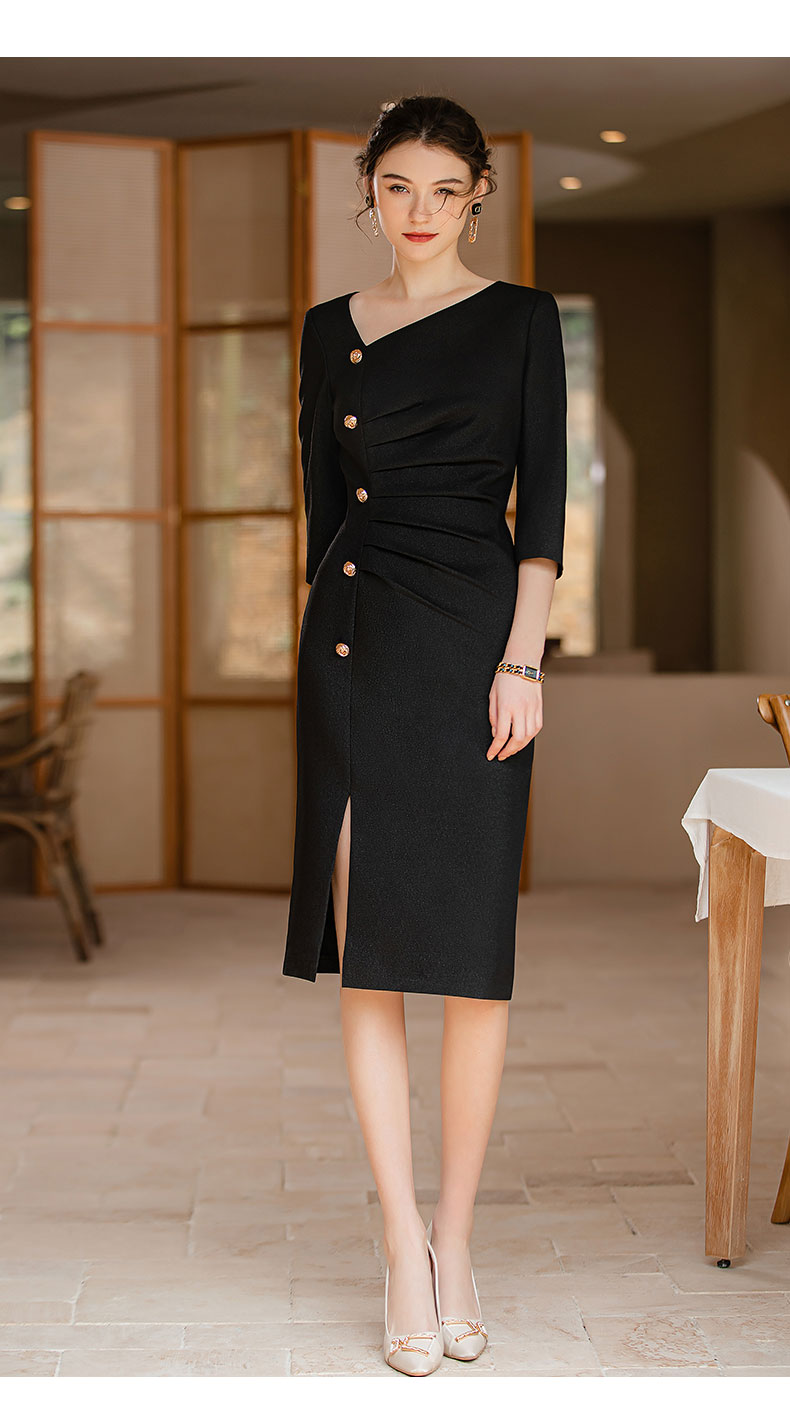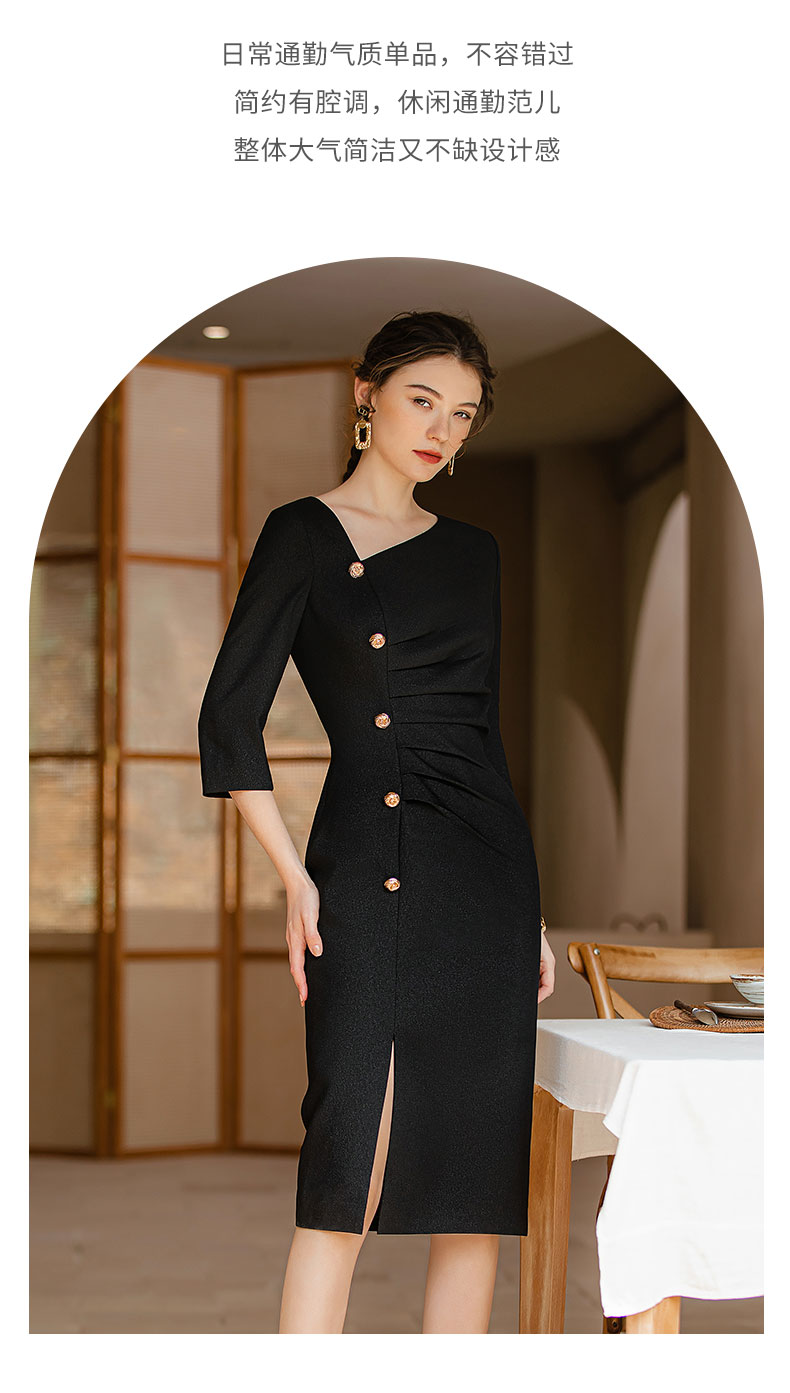 AD法式优雅连衣裙女不规则斜领小黑裙高级感褶皱修身显瘦开叉裙夏