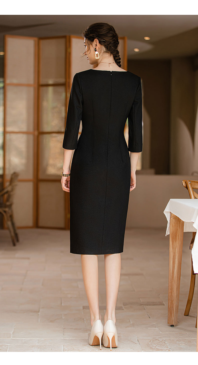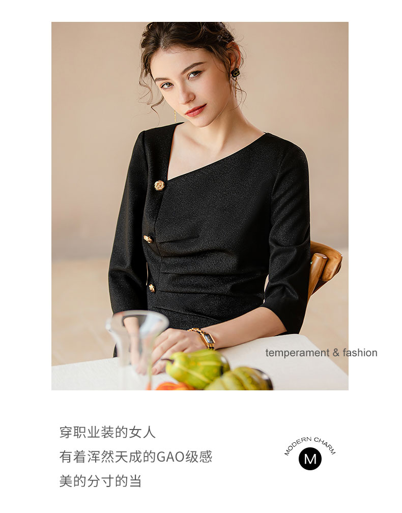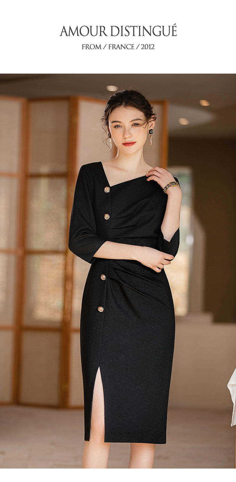 AD法式优雅连衣裙女不规则斜领小黑裙高级感褶皱修身显瘦开叉裙夏