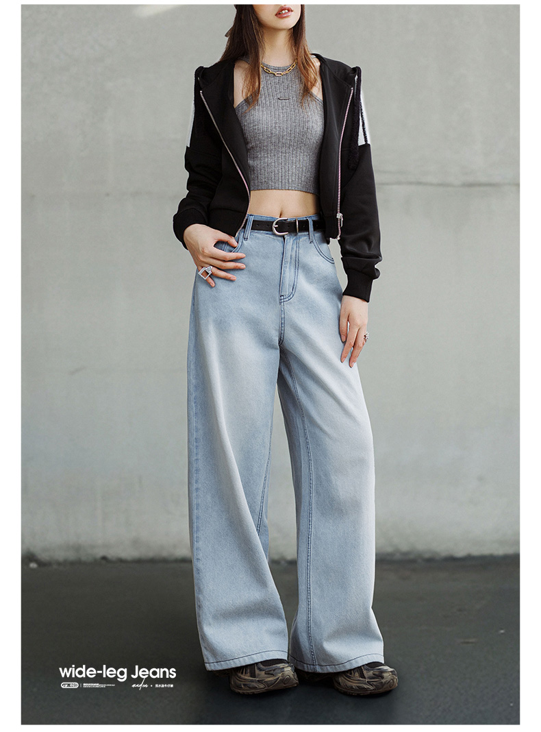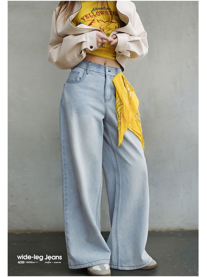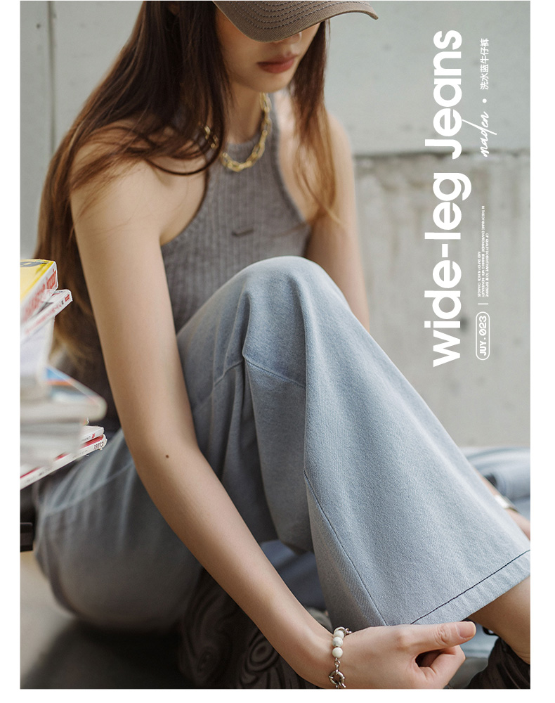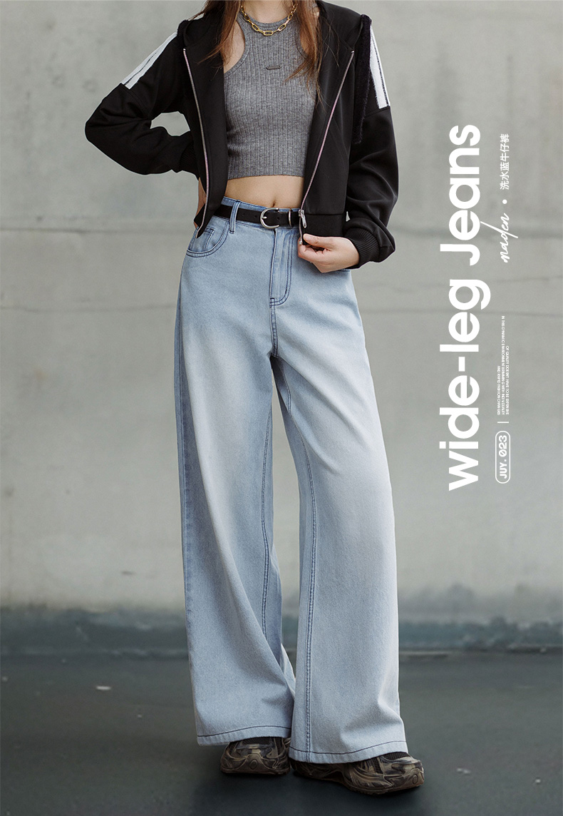 马登美式复古洗水蓝阔腿牛仔裤宽松做旧百搭直筒裤全棉透气轻盈长裤女