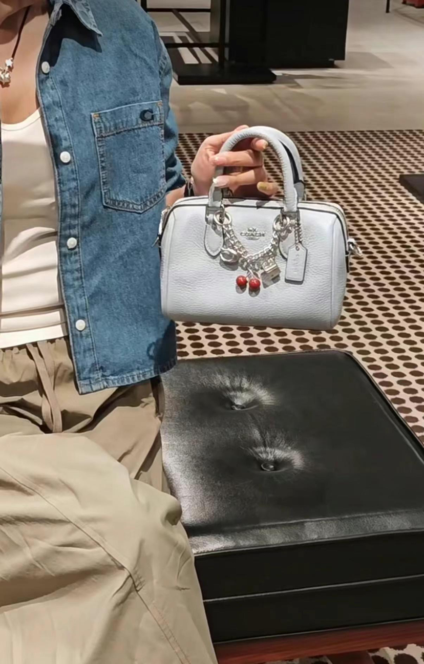 新款折扣¥1599直邮🇺🇸Coach最新mini迷你Rowan波士顿[呲牙]baby蓝全荔枝纹牛皮,自带樱桃🍒小挂饰,尺寸17.5*13*8.5cm,可手挽可斜背
