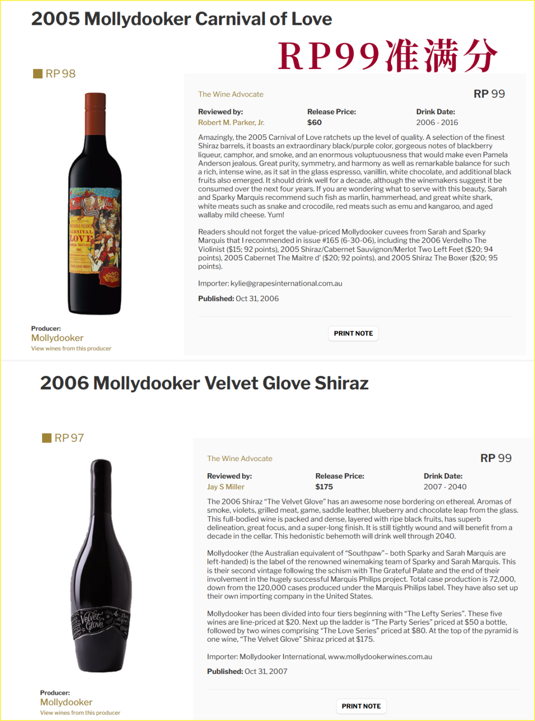 来自澳洲新生代膜拜酒庄"左撇子"Mollydooker出品,当家招牌西拉The Boxer"拳师",问世第壹个年份2005便拿下Robert Parker 95高分,2006年份则被Wine Advocate评为"澳洲蕞具价值葡萄酒第壹"(#1 Australian Value Wines),上市19天内全部售罄,可见受欢迎程度。