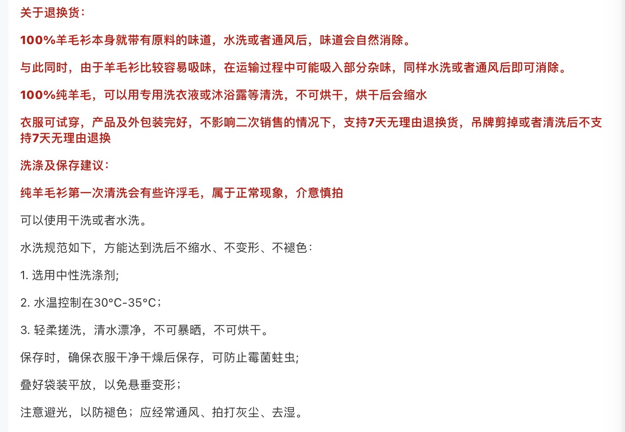 | 售后标准 | 7天无理由退换 非质量问题顾客自己承担运费 洗涤及保存建议: 纯羊毛衫第一次清洗会有些许浮毛,属于正常现象,介意慎拍 可以使用干洗或者水洗。 水洗规范如下,方能达到洗后不缩水、不变形、不褪色: 1. 选用中性洗涤剂; 2. 水温控制在30℃-35℃; 3. 轻柔搓洗,清水漂净,不可暴晒,不可烘干。 保存时,确保衣服干净干燥后保存,可防止霉菌蛀虫; 叠好袋装平放,以免悬垂变形; 注意避光,以防褪色;应经常通风、拍打灰尘、去湿。 |