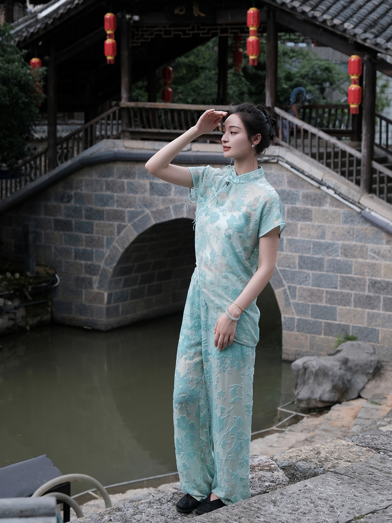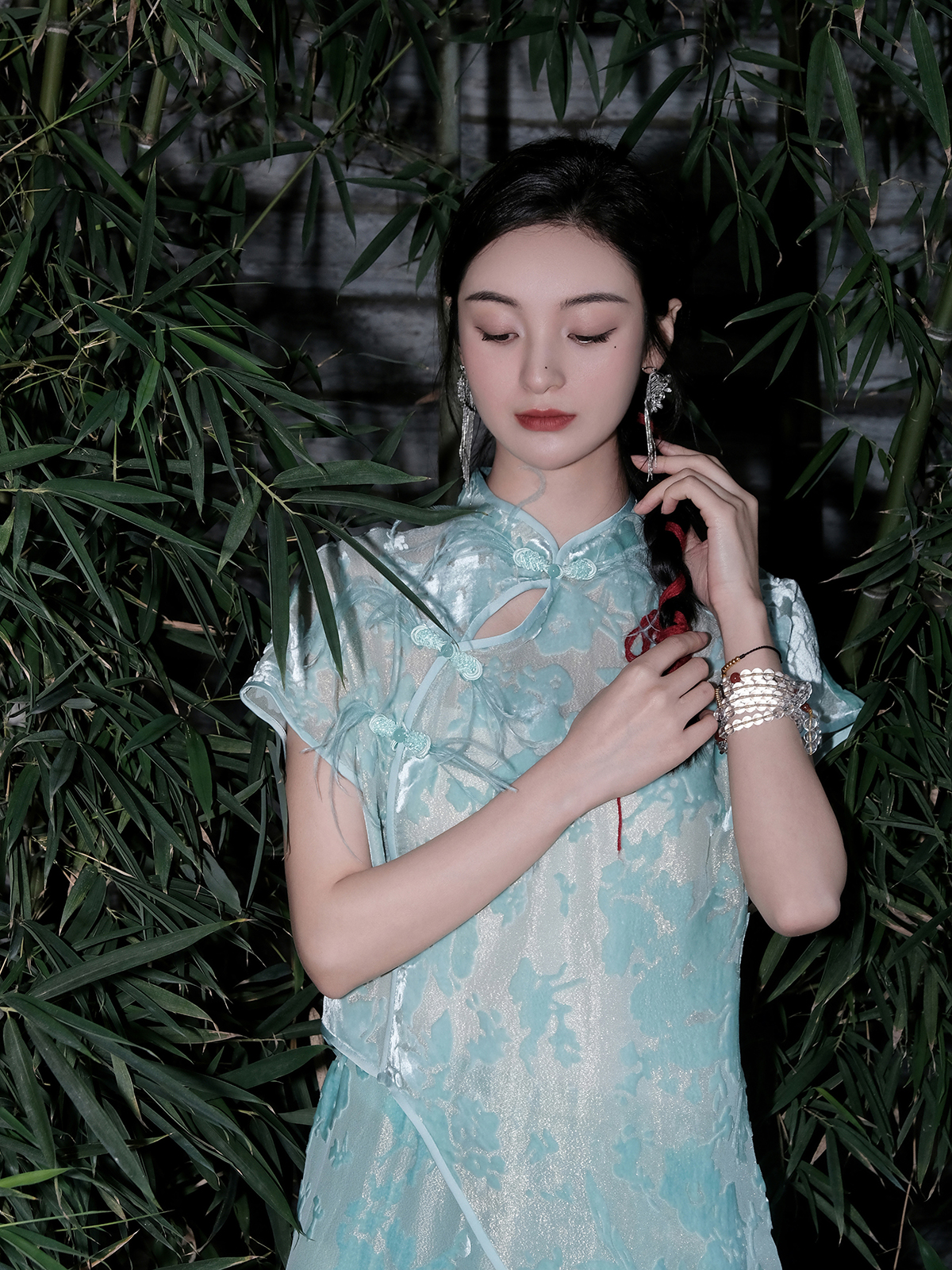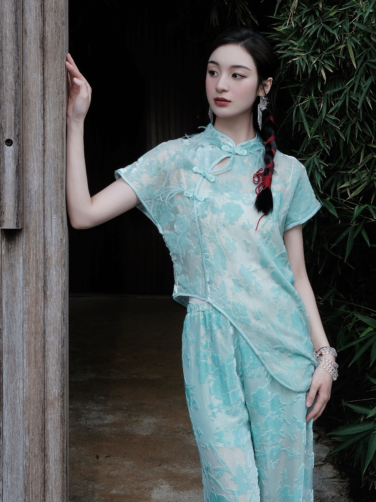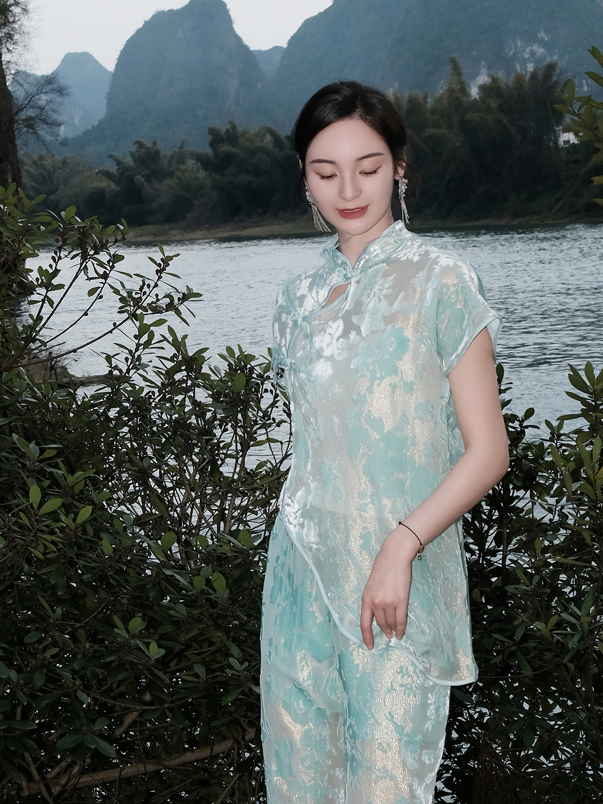 盛唐婧 |蒂芙尼蓝国风丝绒短袖上衣
