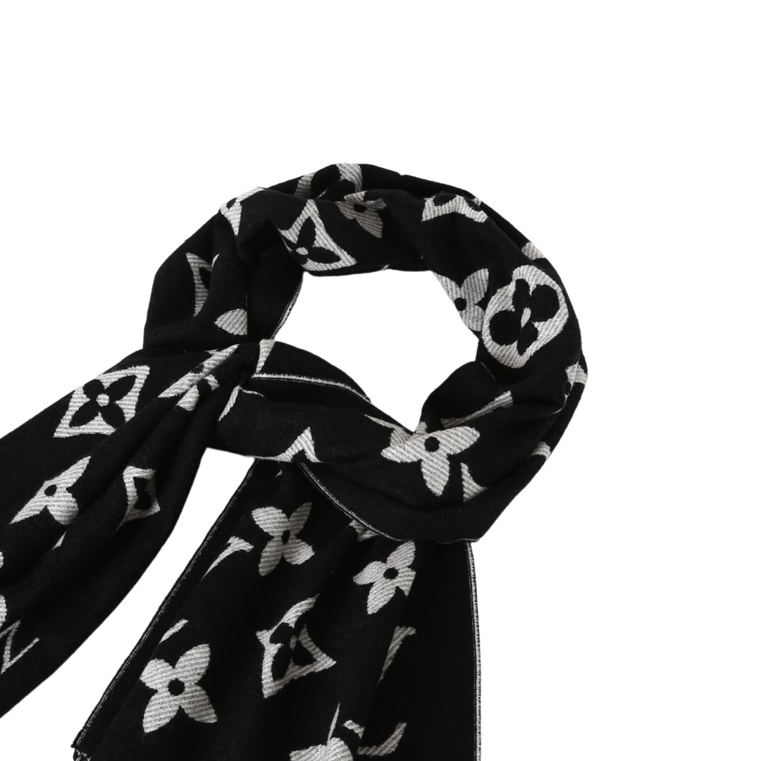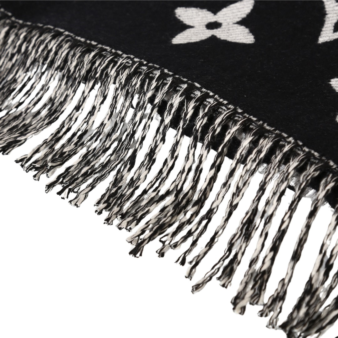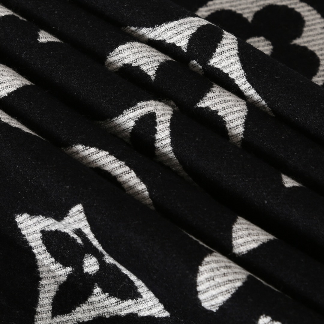 LV 黑老花,织就秋冬的奢华注脚,当 Louis Vuitton 的经典老花图腾在黑绒之上铺陈,秋冬的风格叙事瞬间有了 “高级锚点”。LV 字母、四叶花、菱形纹…… 这些刻入时尚史的标识,以纯净白调立体交织,每一处提花都是品牌百年底蕴的温柔呢喃;下摆流苏随动作轻曳,为沉郁的黑注入灵动韵律。柔糯却挺括的触感,围上颈间的刹那,暖意与奢华感同步涌来 —— 配 oversize 大衣,是都市潮人的吸睛暗号;搭软糯针织衫,又成慵懒氛围里的精致伏笔。从早秋到深冬,从通勤到社交,它让 LV 的经典美学自然晕开,把秋冬的凛冽,衬成了彰显这份奢华温暖的背景板。