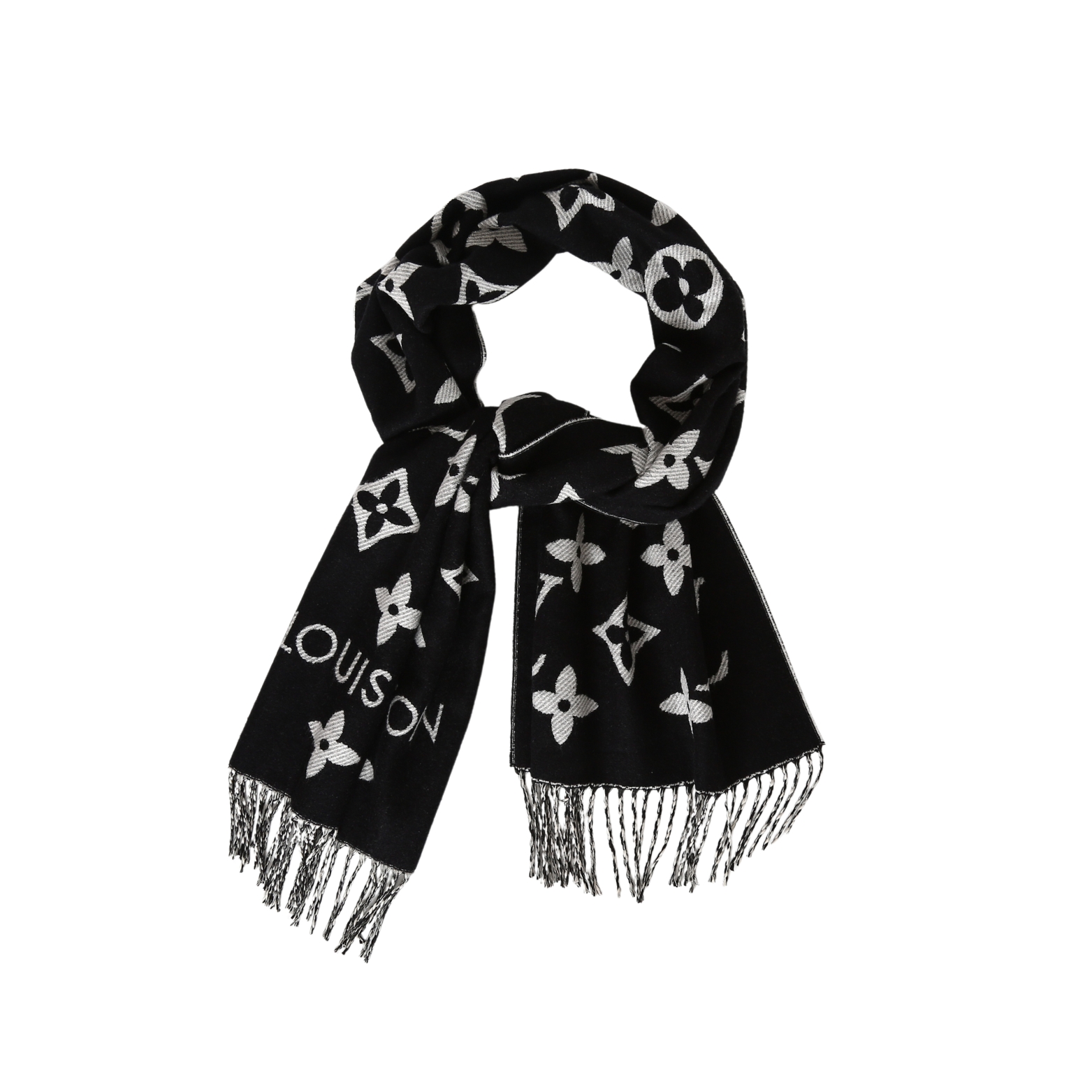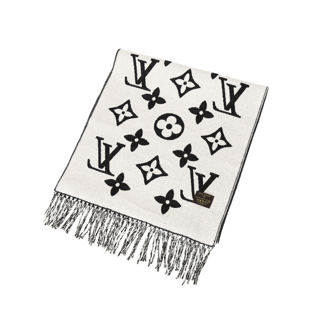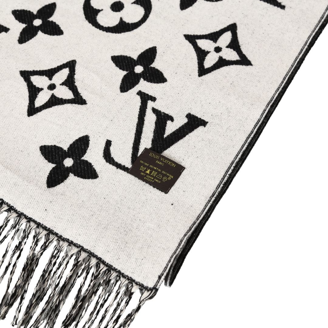 LV 黑老花,织就秋冬的奢华注脚,当 Louis Vuitton 的经典老花图腾在黑绒之上铺陈,秋冬的风格叙事瞬间有了 “高级锚点”。LV 字母、四叶花、菱形纹…… 这些刻入时尚史的标识,以纯净白调立体交织,每一处提花都是品牌百年底蕴的温柔呢喃;下摆流苏随动作轻曳,为沉郁的黑注入灵动韵律。柔糯却挺括的触感,围上颈间的刹那,暖意与奢华感同步涌来 —— 配 oversize 大衣,是都市潮人的吸睛暗号;搭软糯针织衫,又成慵懒氛围里的精致伏笔。从早秋到深冬,从通勤到社交,它让 LV 的经典美学自然晕开,把秋冬的凛冽,衬成了彰显这份奢华温暖的背景板。