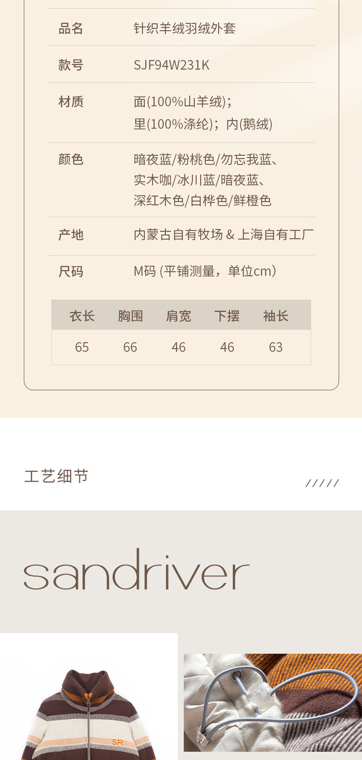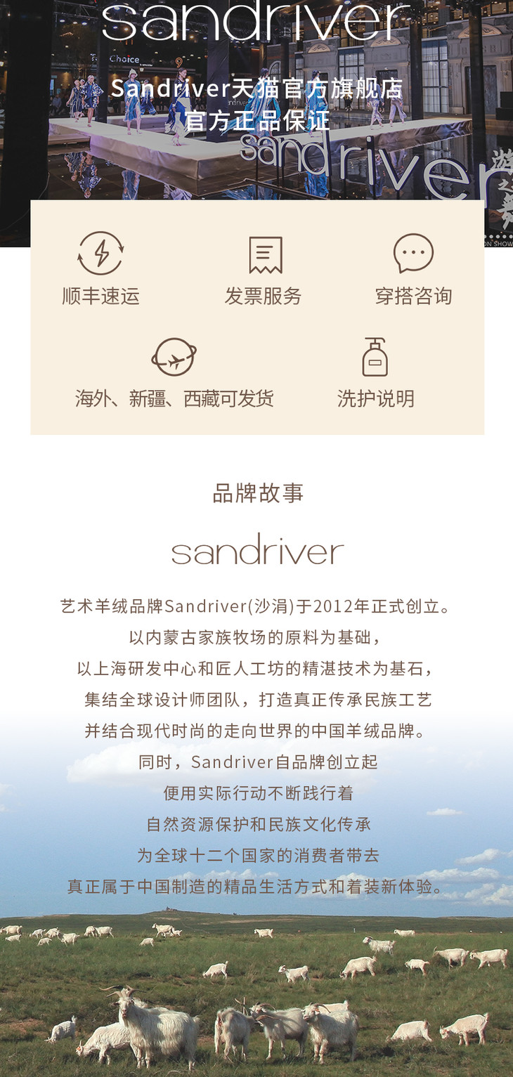 历年在巴黎时装周亮相,享誉世界的艺术羊绒品牌[Sandriver 沙涓]由羊绒布道者郭秀玲女士创立。阿拉善自有牧场纯种羔羊绒,日本国宝设计师小筱顺子,上海自有基地精工细作。承载羊绒情怀,坚持匠人品质。