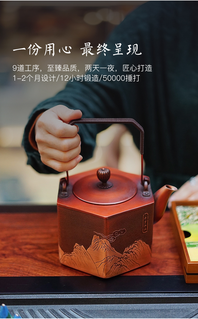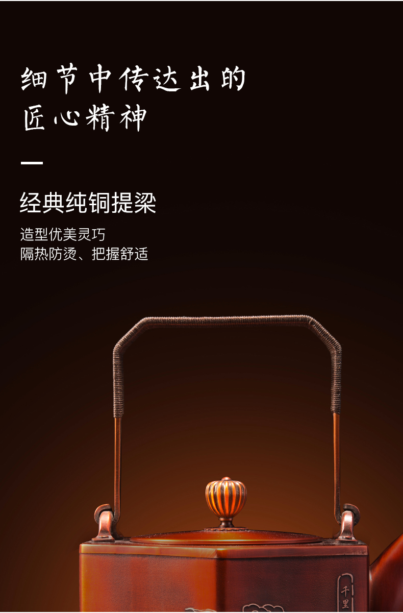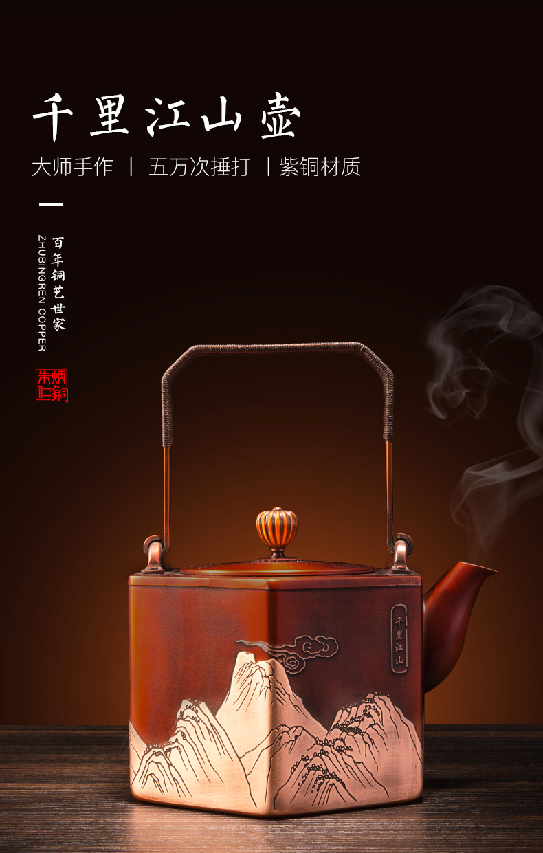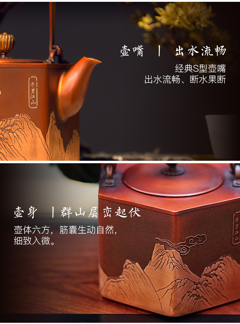 产品介绍:设计灵感源自故宫珍藏北宋王希孟青 绿山水画《千里江山图》,壶身雕刻群山层峦起 伏,细致入微。壶体六方,菊壶纽,直棱肩,短 弯流嘴,刚柔并济,气韵俱佳。铜壶采用国家传 统百年非遗工艺精制,紫铜材质,口感顺滑饱满, 更有益人体。