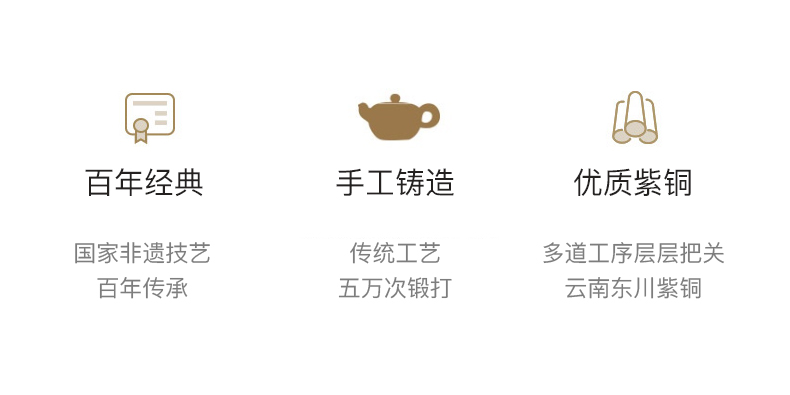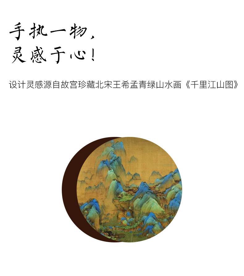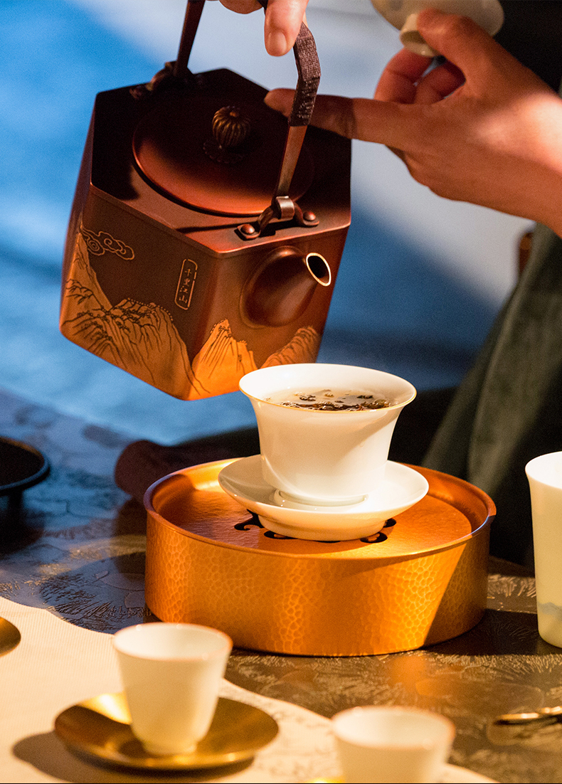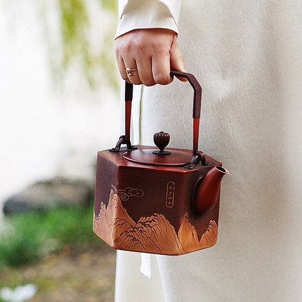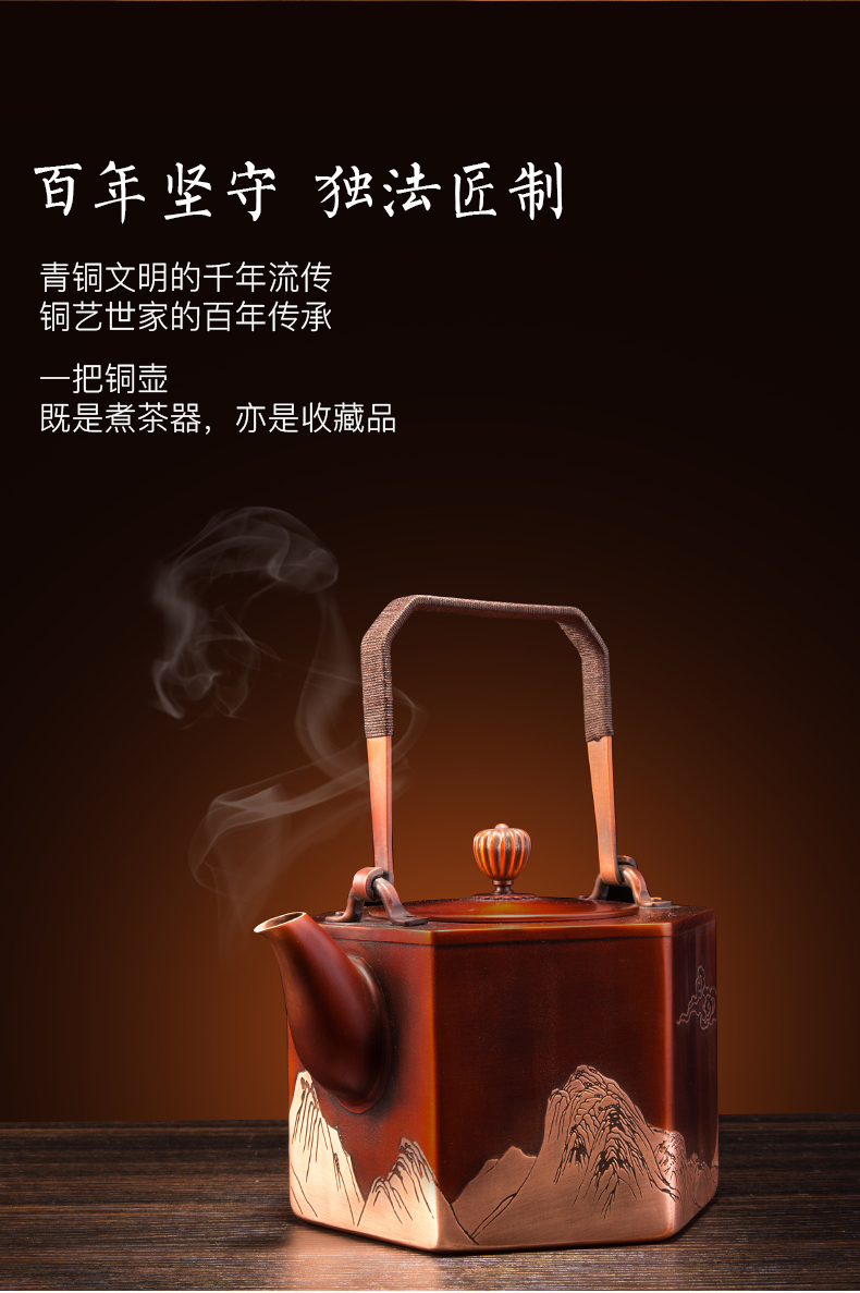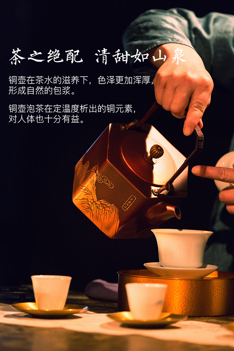 产品介绍:设计灵感源自故宫珍藏北宋王希孟青 绿山水画《千里江山图》,壶身雕刻群山层峦起 伏,细致入微。壶体六方,菊壶纽,直棱肩,短 弯流嘴,刚柔并济,气韵俱佳。铜壶采用国家传 统百年非遗工艺精制,紫铜材质,口感顺滑饱满, 更有益人体。