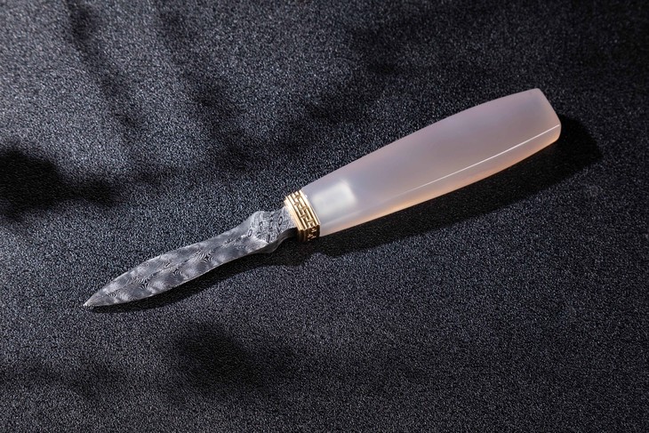 玛瑙剑柄质地温润白皙、状如凝脂,选取的玛瑙中最优良的部分,纹理浑然天成,如云,如雾,如游丝,如水草;或宽如带,或细如丝,天然纯真,甚为美妙,通体呈现清新明亮之感,超凡气质荡怀入心。