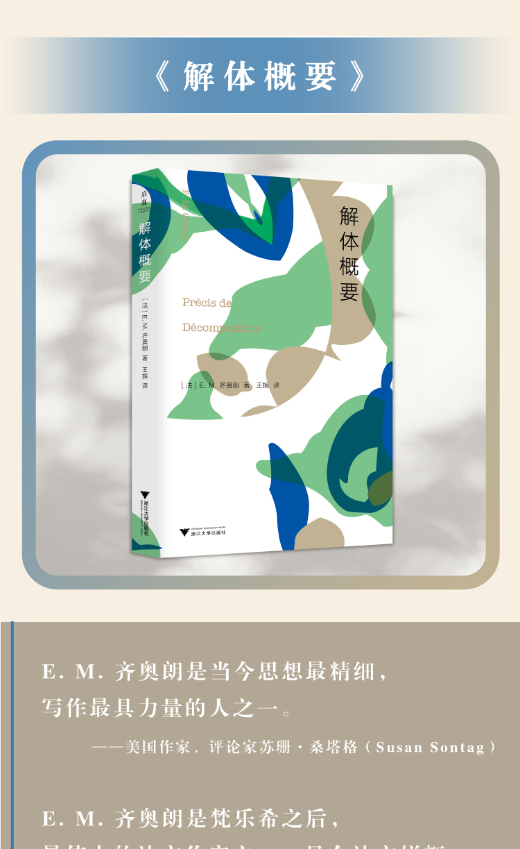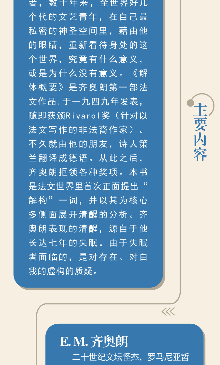 齐奥朗是一位奇特的作者,数十年来,全世界好几个代的文艺青年,在自己最私密的神圣空间里,藉由他的眼睛,重新看待身处的这个世界,究竟有什么意义,或是为什么没有意义。《解体概要》是齐奥朗第一部法文作品,于一九四九年发表,随即获颁Rivarol奖(针对以法文写作的非法裔作家)。不久就由他的朋友,诗人策兰翻译成德语。从此之后,齐奥朗拒领各种奖项。 本书是法文世界里首次正面提出“解构”一词,并以其为核心多侧面展开清醒的分析。齐奥朗表现的清醒,源自于他长达七年的失眠。由于失眠者面临的,是对存在、对自我的虚构的质疑。