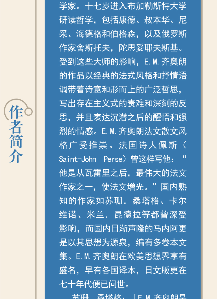 E. M. 齐奥朗,二十世纪文坛怪杰,罗马尼亚哲学家。十七岁进入布加勒斯特大学研读哲学,包括康德、叔本华、尼采、海德格和伯格森,以及俄罗斯作家舍斯托夫,陀思妥耶夫斯基。受到这些大师的影响,E. M. 齐奥朗的作品以经典的法式风格和抒情语调带着诗意和形而上的广泛哲思,写出存在主义式的责难和深刻的反思,并且表达沉潜之后的醒悟和强烈的情感。E. M. 齐奥朗法文散文风格广受推崇。法国诗人佩斯(Saint-John Perse)曾这样写他:“他是从瓦雷里之后,最伟大的法文作家之一,使法文增光。”国内熟知的作家如苏珊.桑塔格、卡尔维诺、米兰.昆德拉等都曾深受影响,,而国内日渐声隆的马内阿更是以其思想为源泉,编有多卷本文集。E. M. 齐奥朗在欧美思想界享有盛名,早有各国译本,日文版更在七十年代便已问世。