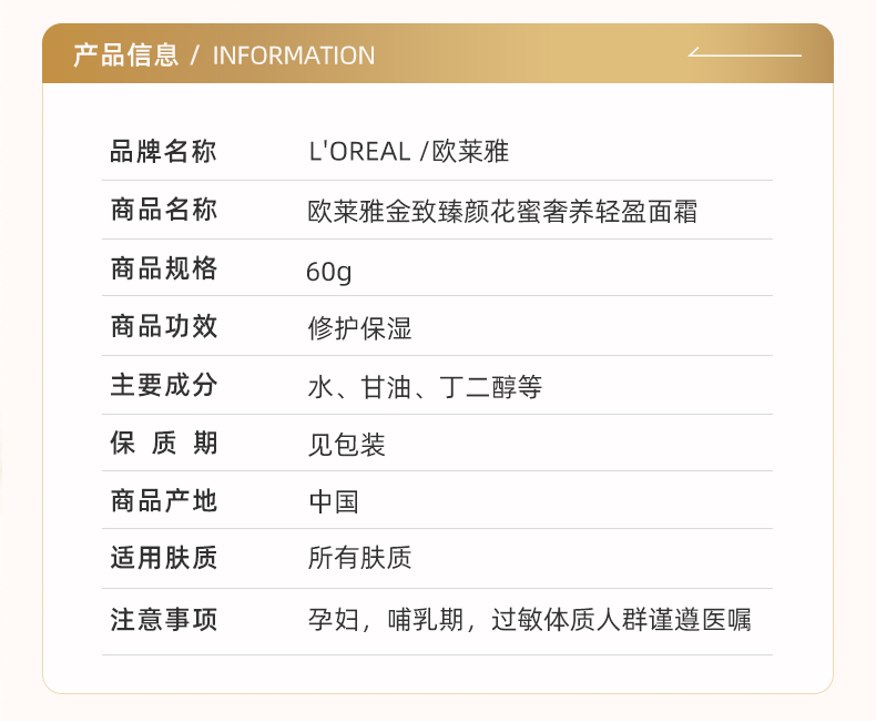 欧莱雅精致臻颜花蜜奢养轻盈面霜60ML