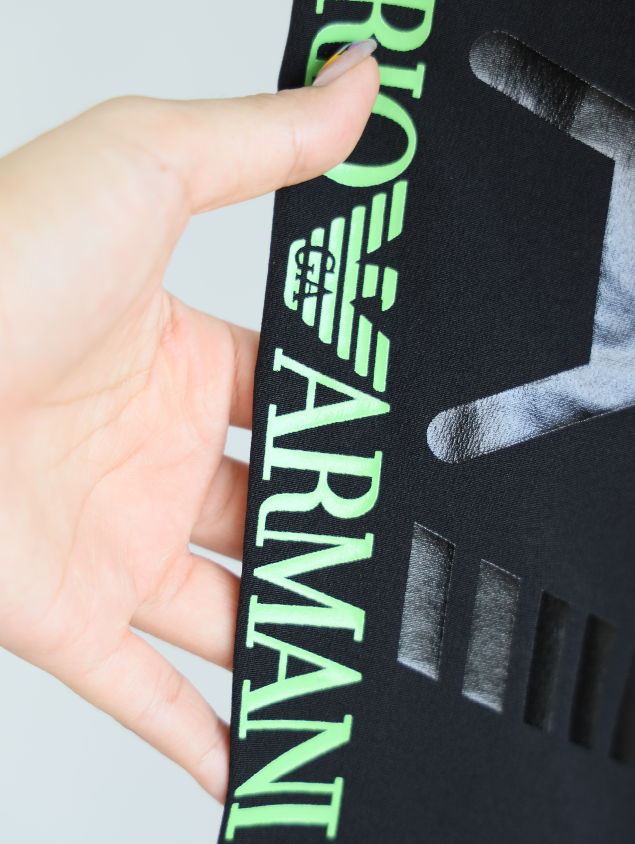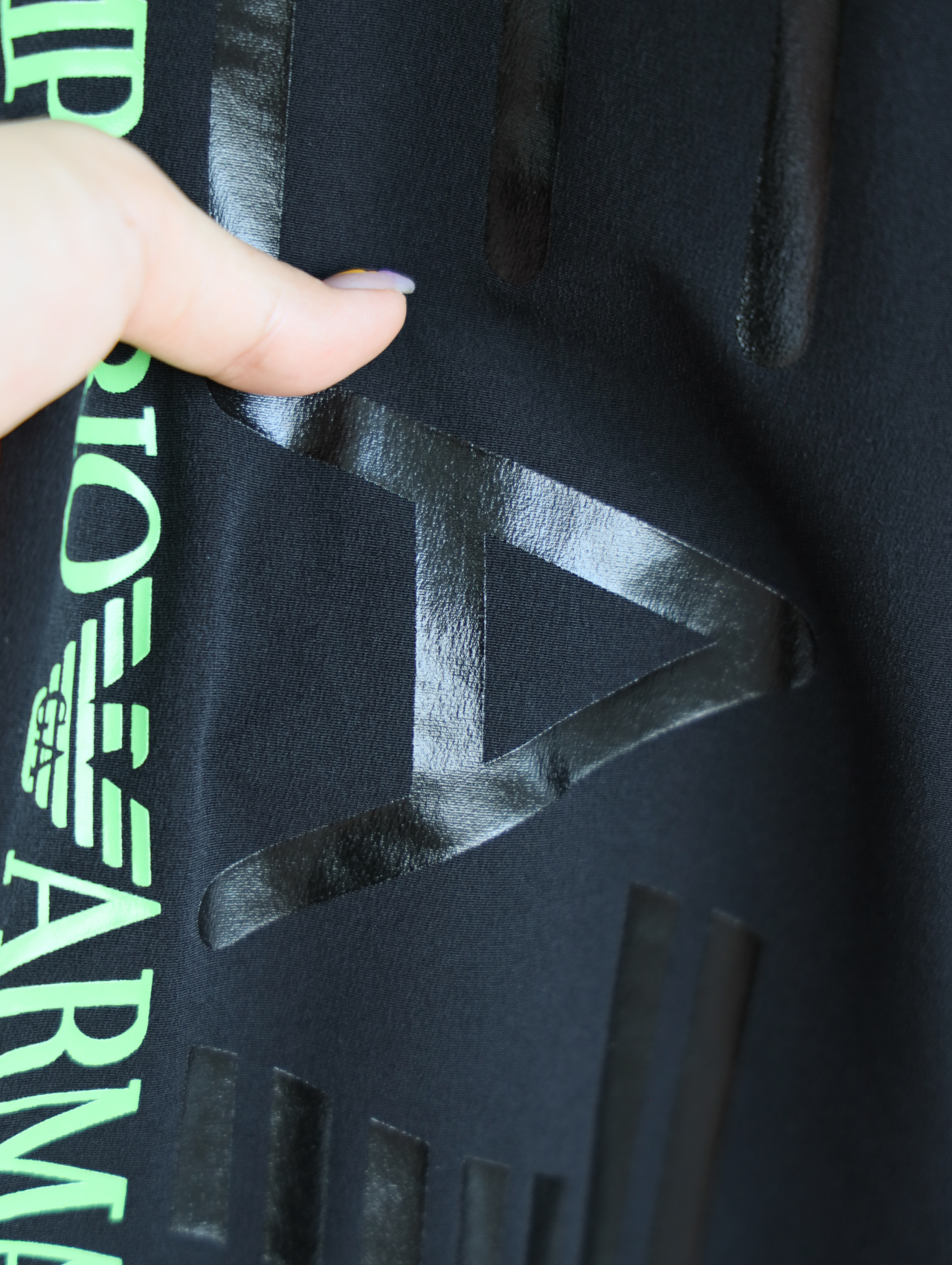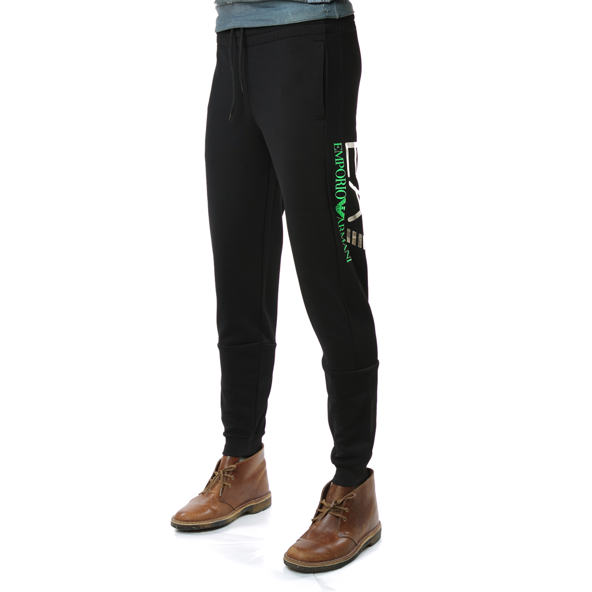 侧边E7绿标+黑标印花一直延伸到大腿后侧,错落有致。