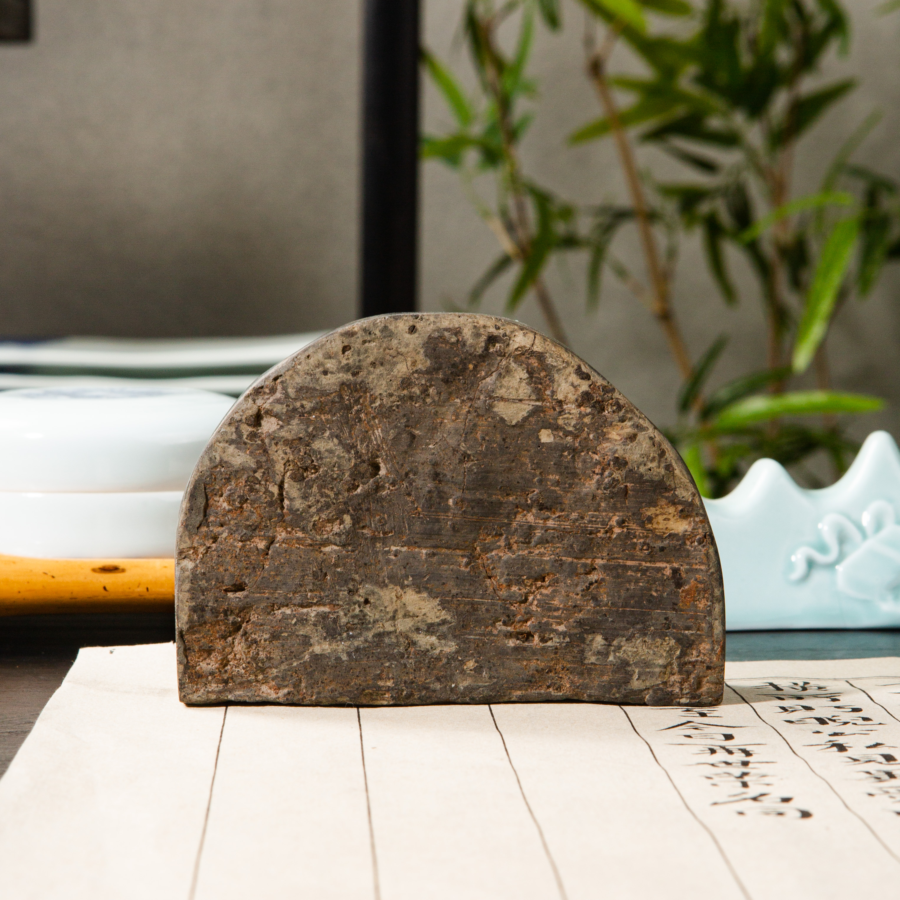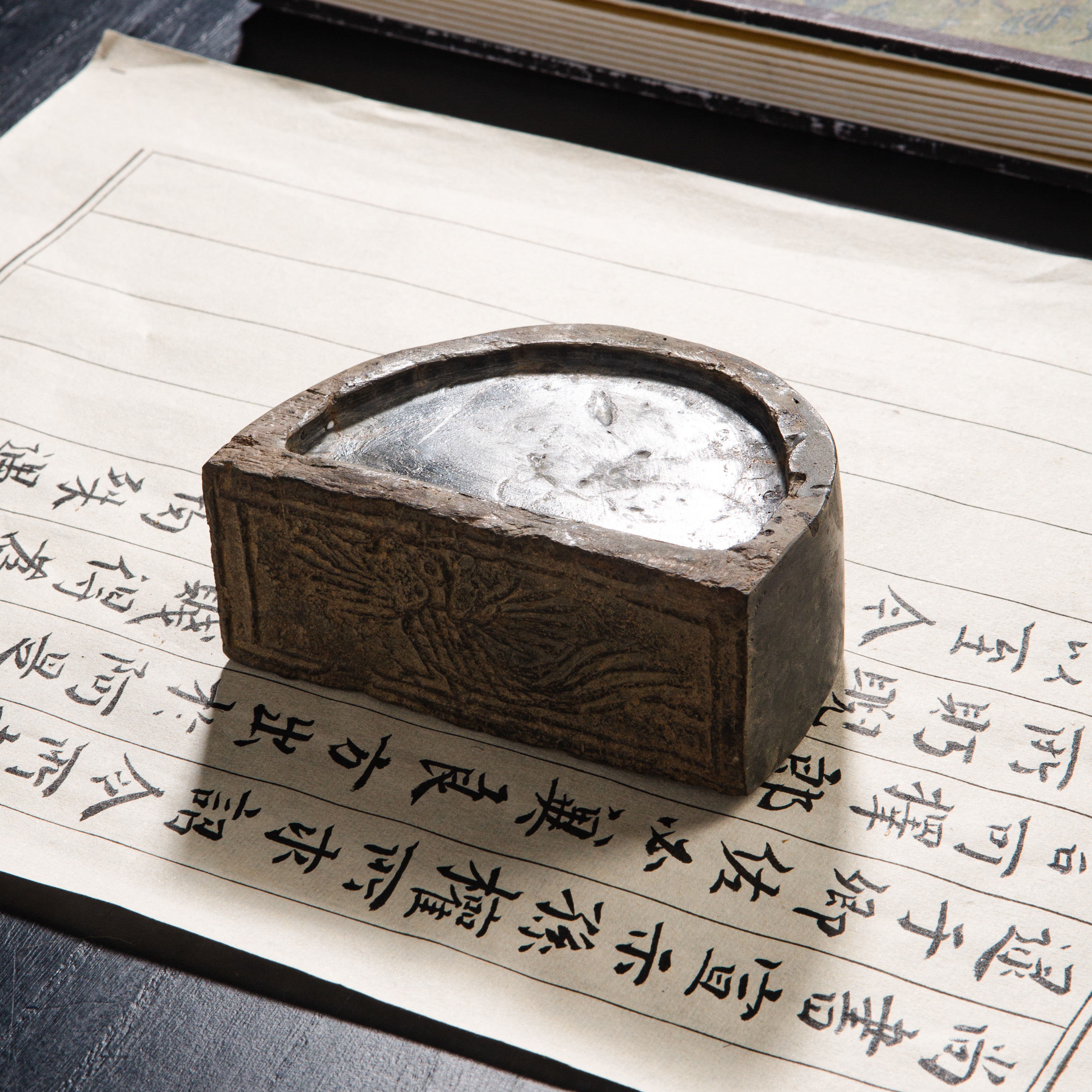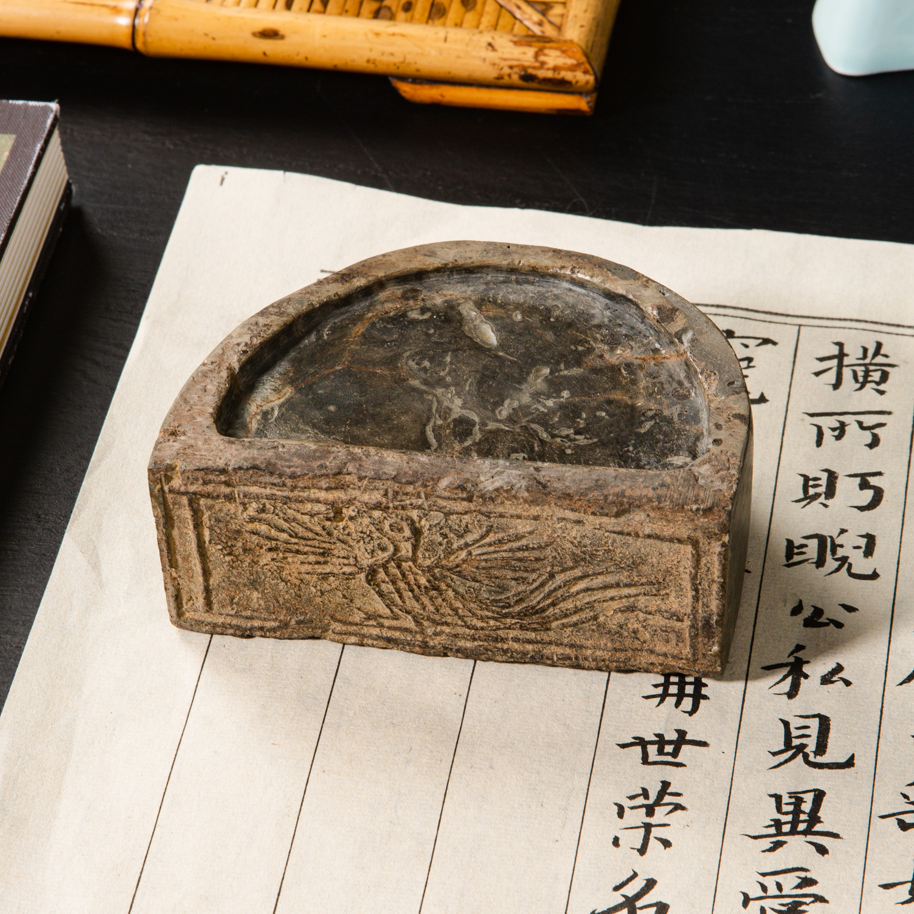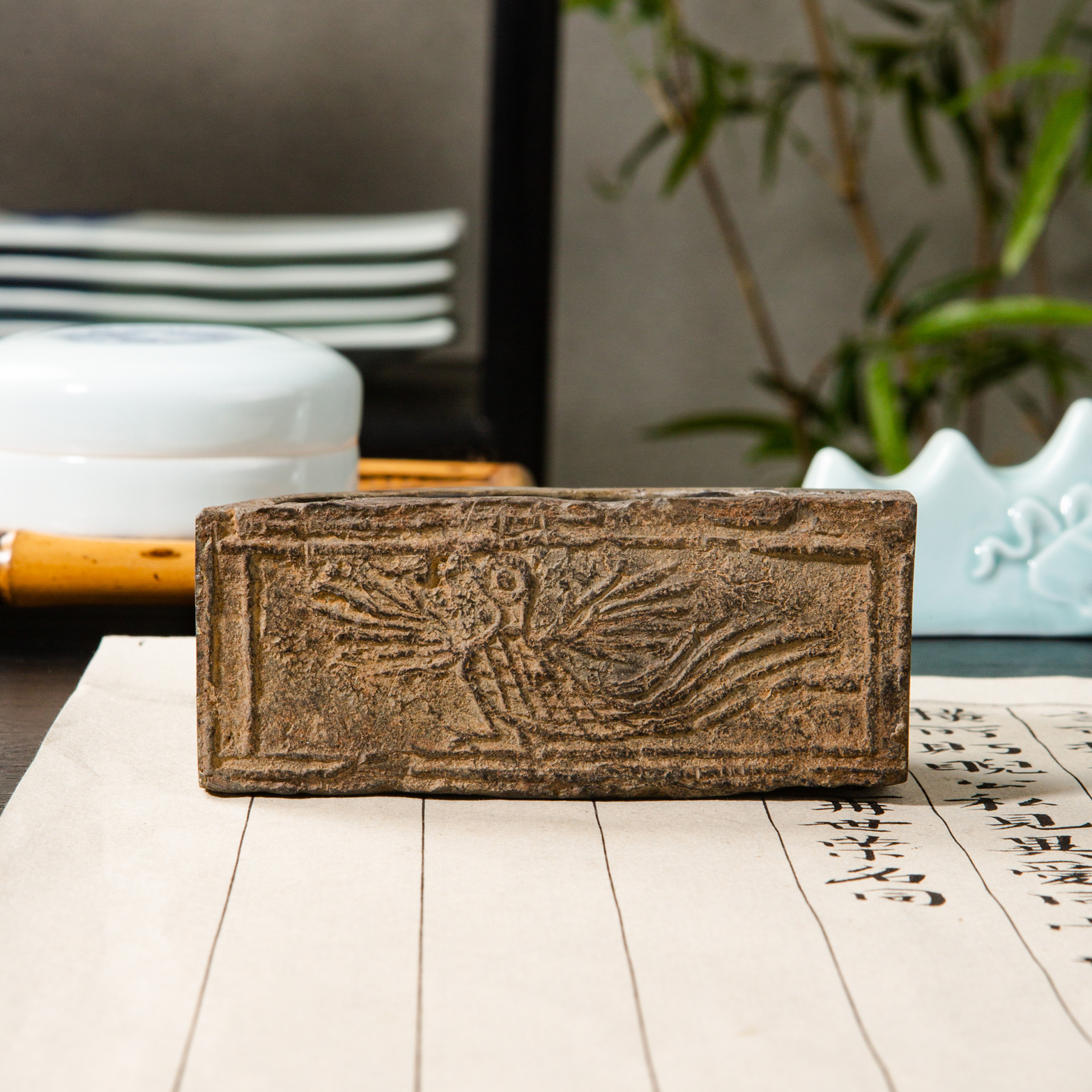 汉晋“精巧凤凰纹”古砖制砚,纹饰少见,字口清晰,“凤凰”古朴灵动,器型典雅端庄,胎质坚实细腻,制砚工艺精良,十分稀有难得。