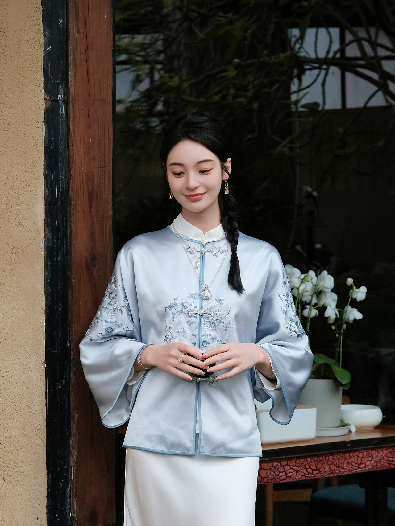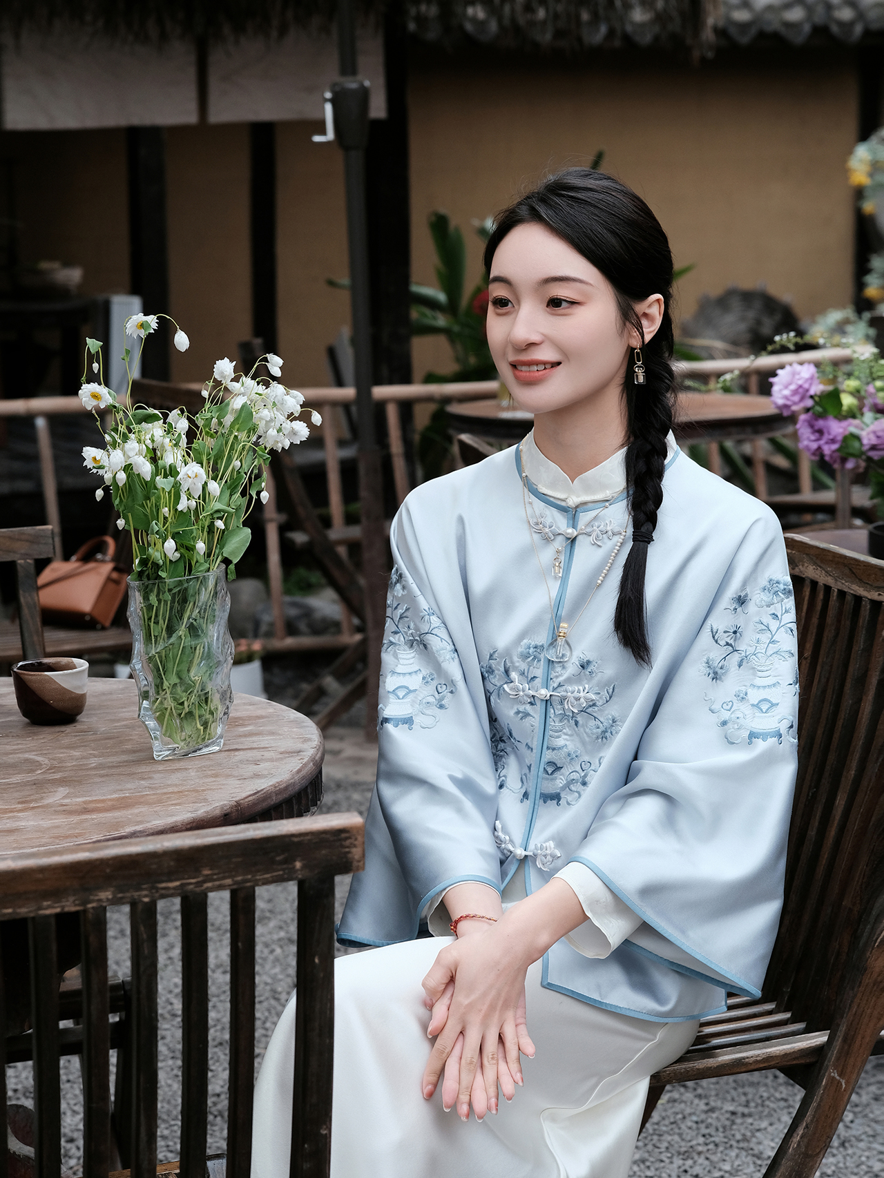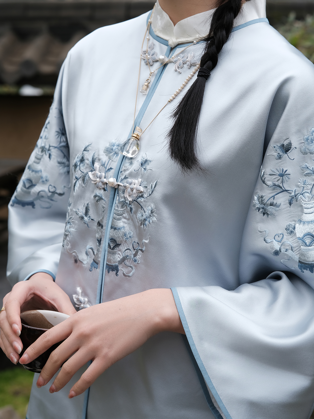盛唐牡丹 |吉祥宝瓶团纹对襟外套-月白蓝